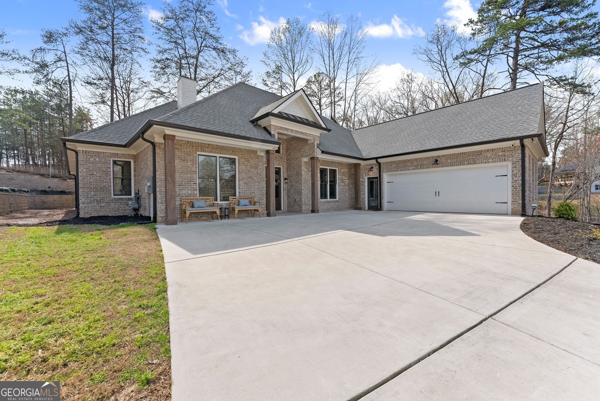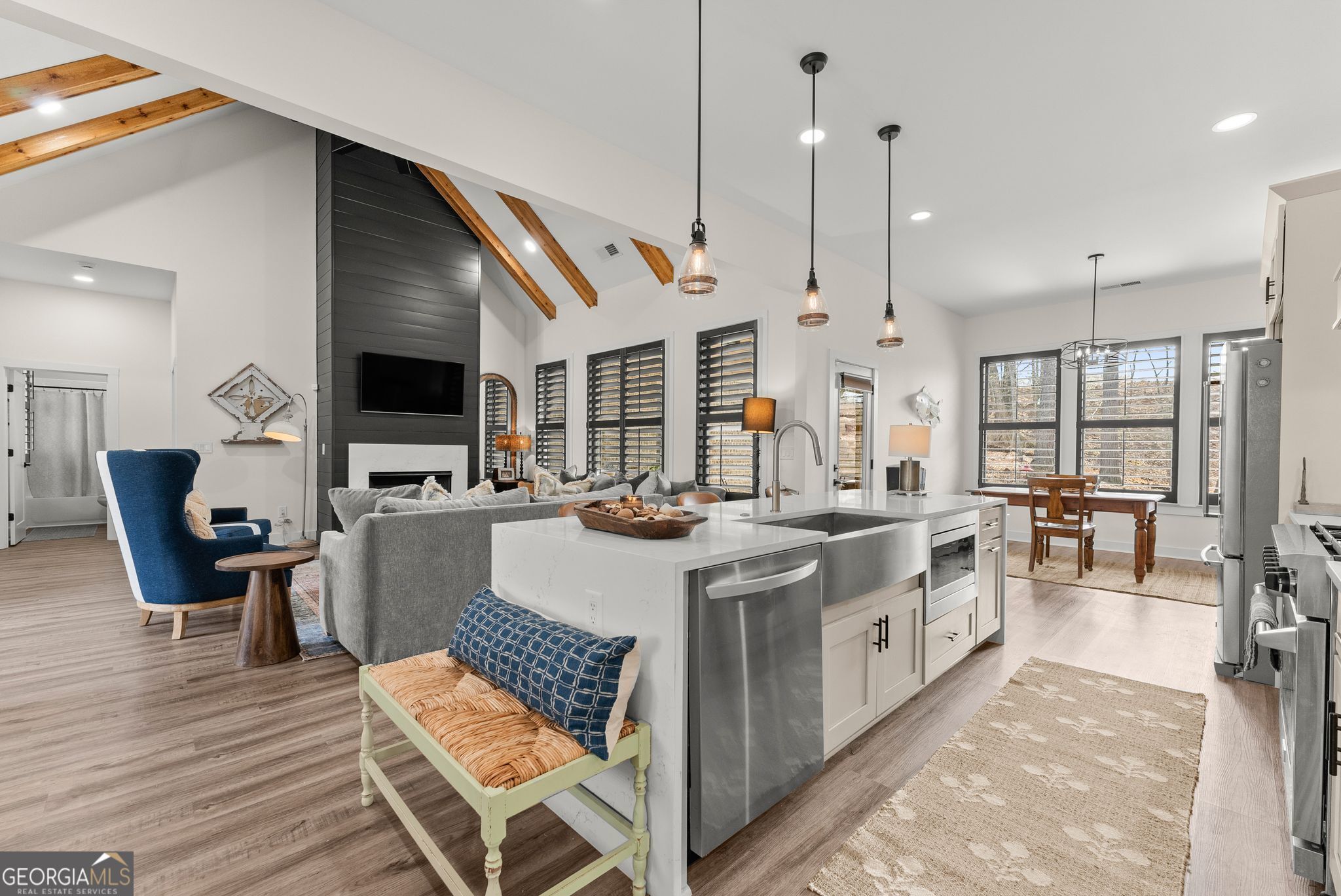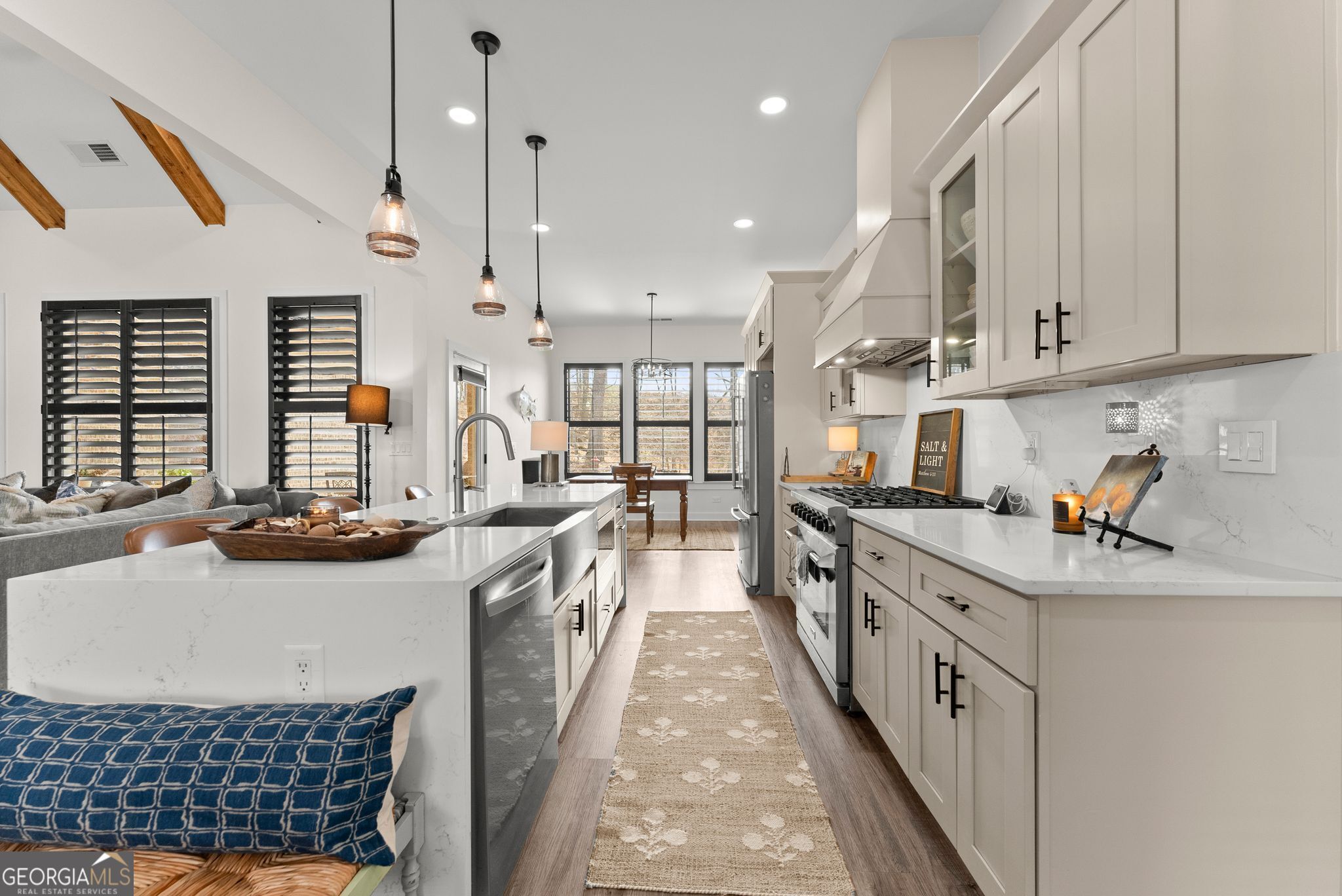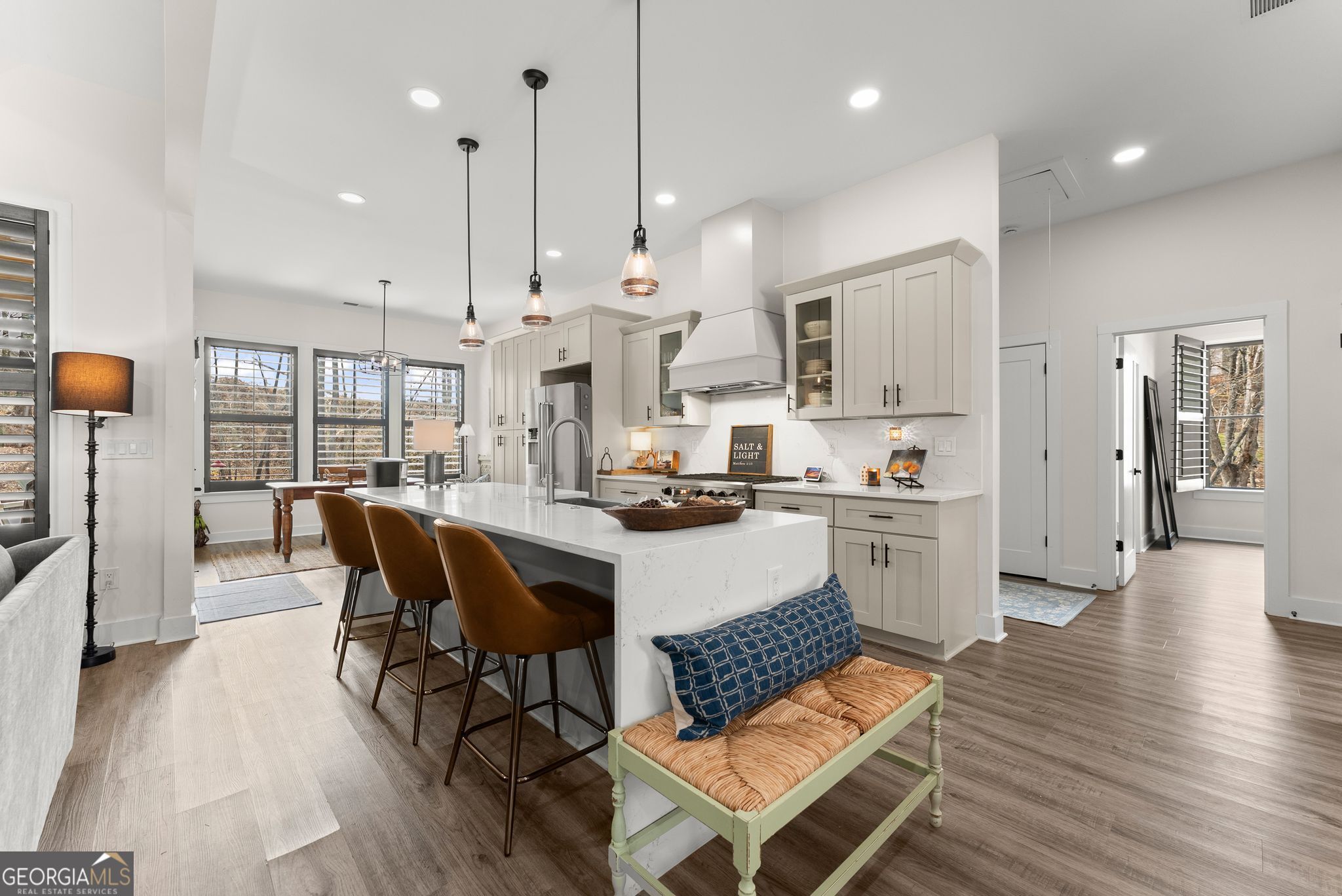 $25,000 PRICE DROP - Incredible Value on This Like-New Spacious Ranch! Welcome to this stunning all-brick 2023-built stepless ranch offering 4 bedrooms, 3 full baths, and 2,705 square feet of beautifully designed one-level living. Step through the double front doors into a welcoming foyer with a formal dining room that flows seamlessly into the grand living room featuring vaulted ceilings, exposed wood beams, and custom wood shutters. The gourmet kitchen is a true showstopper, complete with shaker-style cabinetry, waterfall quartz countertops, stainless steel appliances, a 36" gas range with vent hood, and a bright eat-in area-all opening to an inviting layout perfect for everyday living and entertaining. The spacious primary suite offers a luxurious retreat with a standalone soaking tub, oversized frameless glass shower, and dual vanities, while three additional bedrooms and two full baths provide plenty of space for family or guests. A large laundry room with sink and cabinetry and a thoughtfully designed mudroom add both convenience and functionality. Throughout the home, you'll find luxury LVP flooring with no carpet, enhancing the clean, modern feel. Situated on a private, professionally landscaped lot, enjoy outdoor living on the covered back porch and extended patio-perfect for relaxing or entertaining. Additional highlights include a 2-car garage with epoxy floors, upgraded lighting, and custom craftsmanship throughout. Located in the highly desirable Stratford on Lanier swim, tennis, and pickleball community, surrounded by Lake Lanier, this home offers the perfect blend of luxury, convenience, and lifestyle. Like-new, move-in ready, and loaded with upgrades-this one truly has it all!