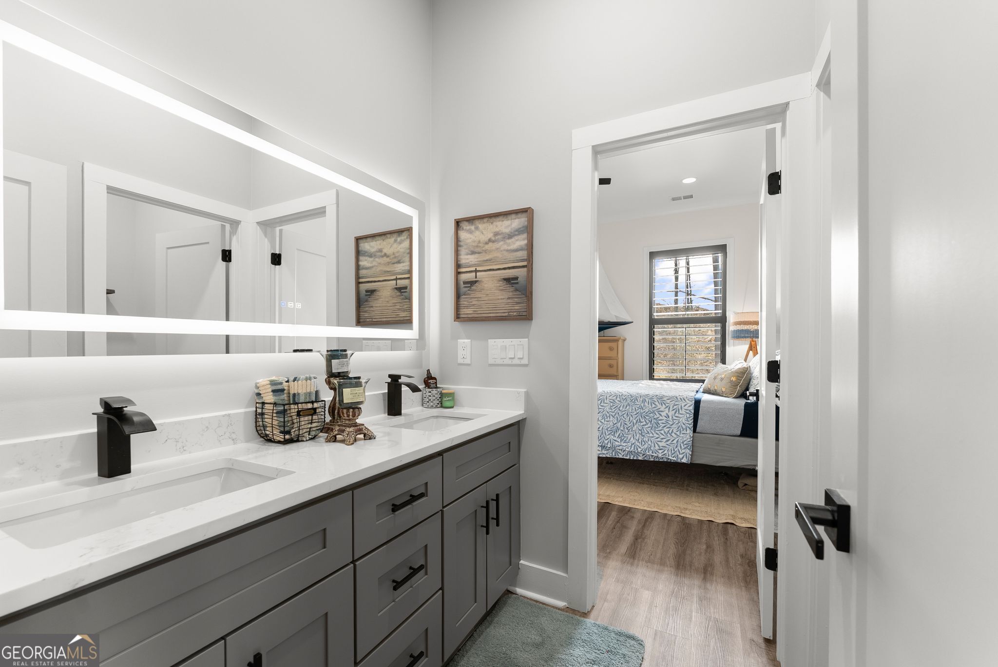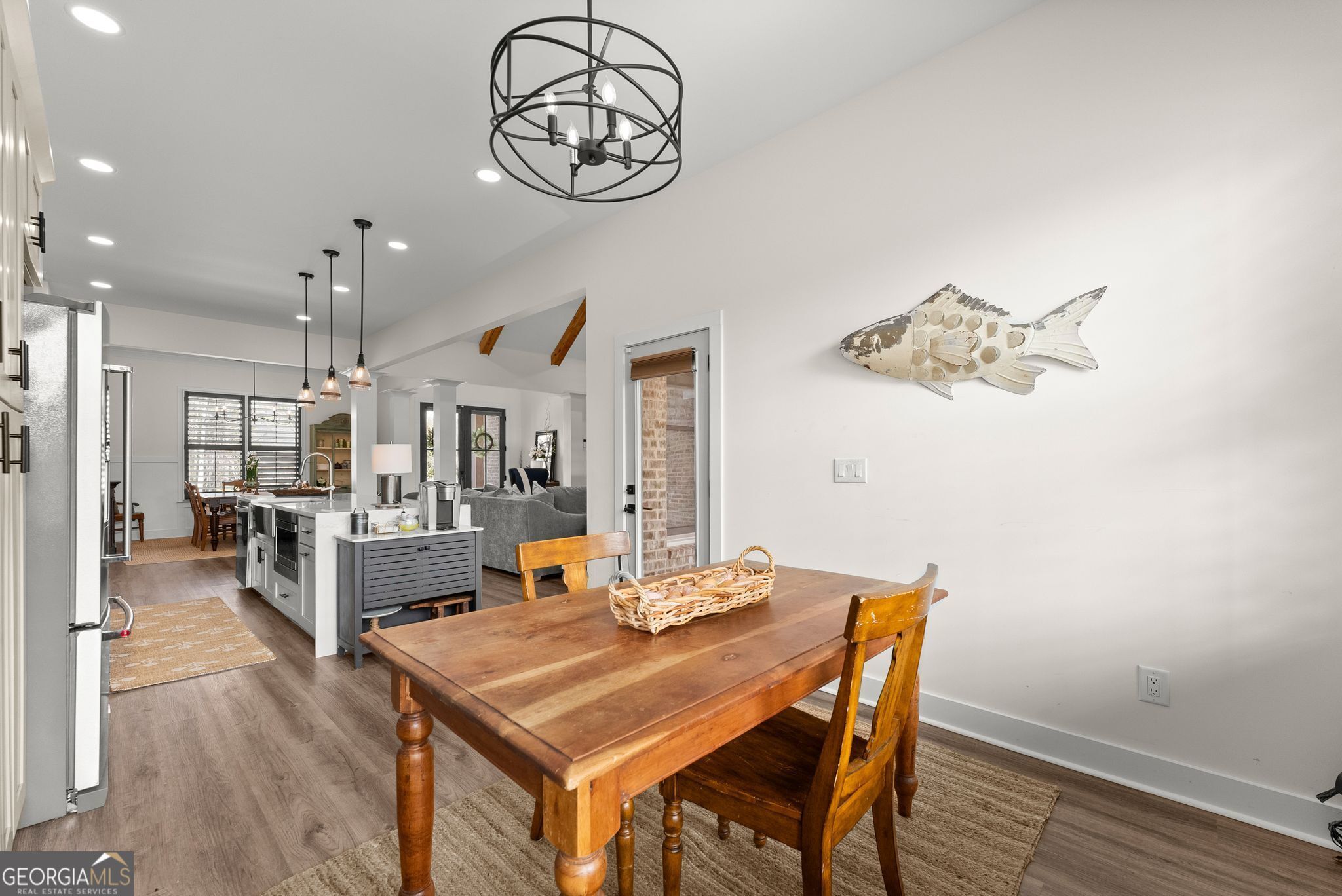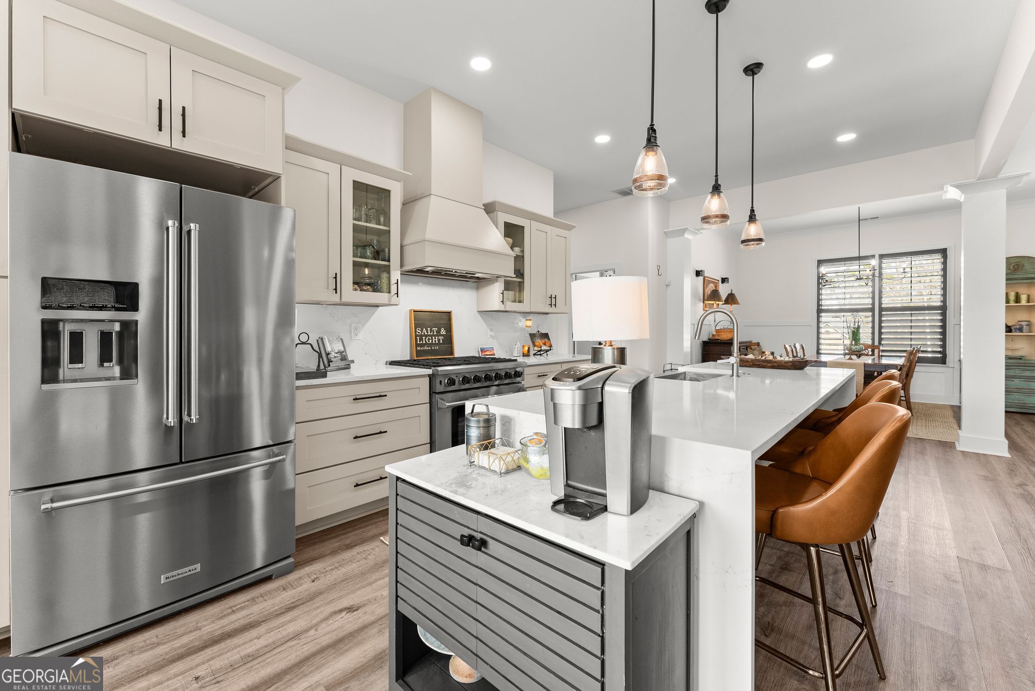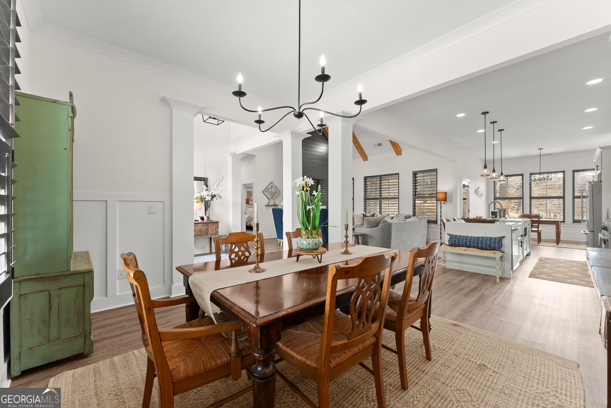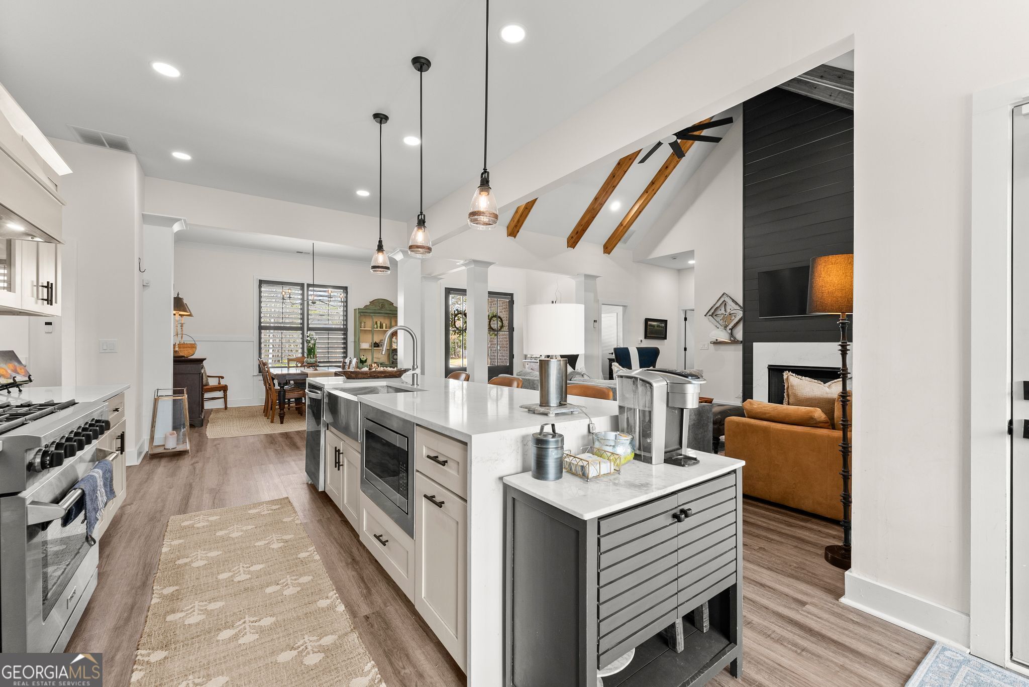 $25,000 PRICE DROP - Incredible Value on This Like-New Spacious Ranch! Welcome to this stunning all-brick 2023-built stepless ranch offering 4 bedrooms, 3 full baths, and 2,705 square feet of beautifully designed one-level living. Step through the double front doors into a welcoming foyer with a formal dining room that flows seamlessly into the grand living room featuring vaulted ceilings, exposed wood beams, and custom wood shutters. The gourmet kitchen is a true showstopper, complete with shaker-style cabinetry, waterfall quartz countertops, stainless steel appliances, a 36" gas range with vent hood, and a bright eat-in area-all opening to an inviting layout perfect for everyday living and entertaining. The spacious primary suite offers a luxurious retreat with a standalone soaking tub, oversized frameless glass shower, and dual vanities, while three additional bedrooms and two full baths provide plenty of space for family or guests. A large laundry room with sink and cabinetry and a thoughtfully designed mudroom add both convenience and functionality. Throughout the home, you'll find luxury LVP flooring with no carpet, enhancing the clean, modern feel. Situated on a private, professionally landscaped lot, enjoy outdoor living on the covered back porch and extended patio-perfect for relaxing or entertaining. Additional highlights include a 2-car garage with epoxy floors, upgraded lighting, and custom craftsmanship throughout. Located in the highly desirable Stratford on Lanier swim, tennis, and pickleball community, surrounded by Lake Lanier, this home offers the perfect blend of luxury, convenience, and lifestyle. Like-new, move-in ready, and loaded with upgrades-this one truly has it all!