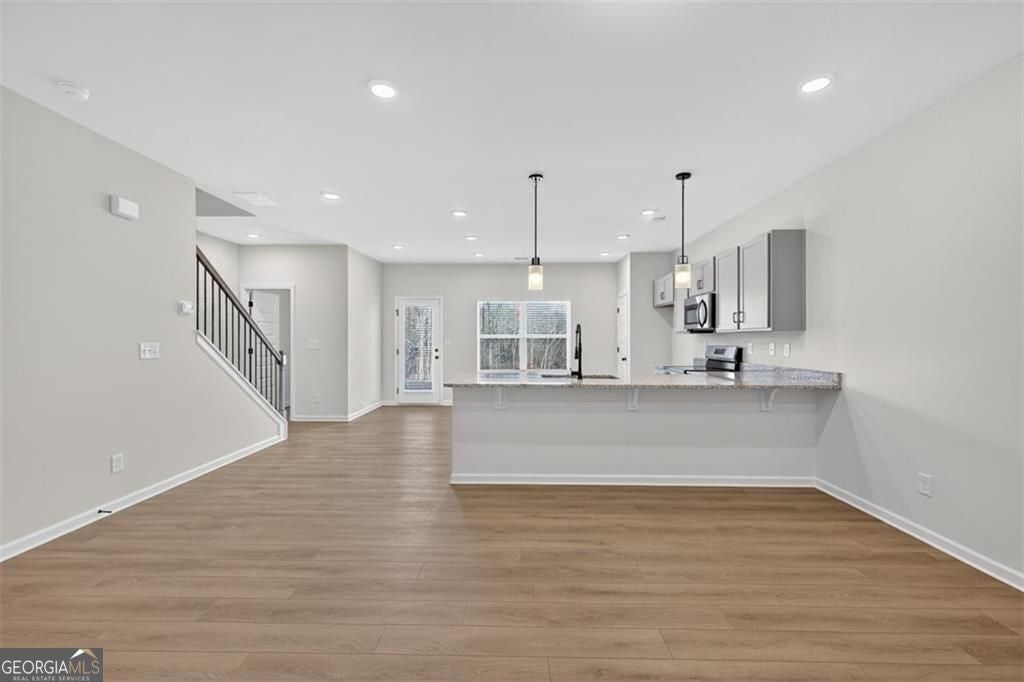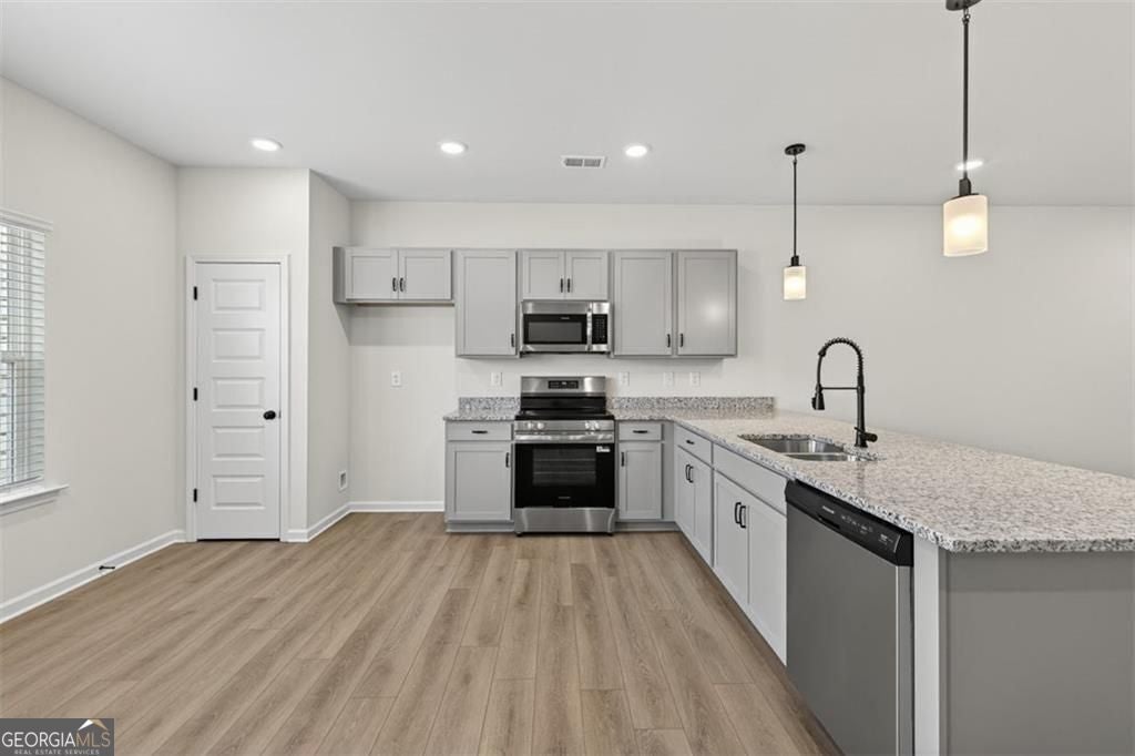 Move-In Ready July! The Maddux II plan in the desirable Sanders Park community by Smith Douglas Homes-a beautifully designed 3-bedroom, 2.5-bath townhome with a two-car garage. This new construction home features an open-concept floorplan with seamless living, kitchen, and dining areas, perfect for modern living and entertaining. The upgraded kitchen boasts granite countertops, stainless steel appliances, tile backsplash, pantry, and stylish cabinetry, all complemented by durable luxury vinyl plank flooring throughout the main level. Black interior hardware adds a sleek, contemporary touch. Step outside to enjoy easy outdoor entertaining on the private back patio. An elegant open iron rail staircase leads to the second floor, where the spacious primary suite offers a tray ceiling, large walk-in closet, and spa-like bath with garden tub and tiled shower. Two additional bedrooms, a shared hall bath, and a convenient upstairs laundry room complete the layout. Enjoy 9-foot ceilings on both levels, a 3/4 glass panel front door, and low-maintenance living with HOA-covered lawn care leaving you more time to do the things you enjoy. Community amenities include a neighborhood pool. Ideal location, modern finishes, and move-in ready convenience-this home has it all!