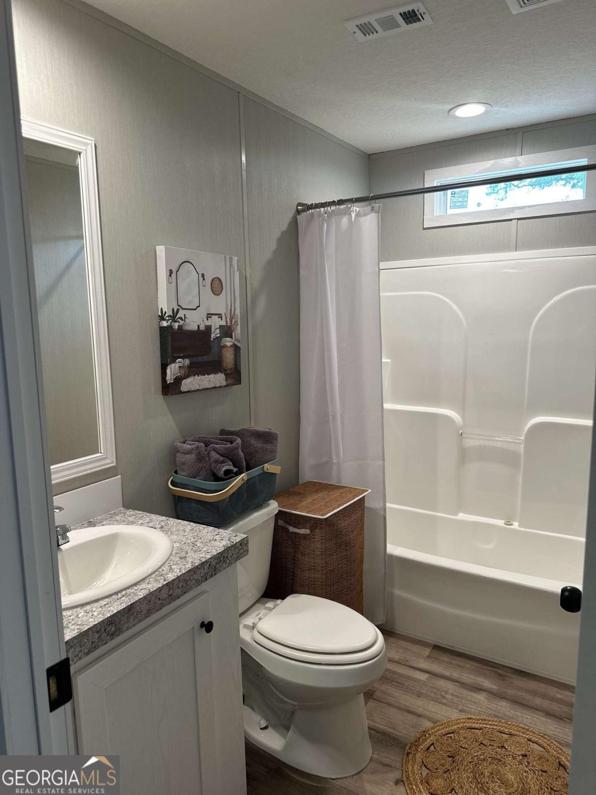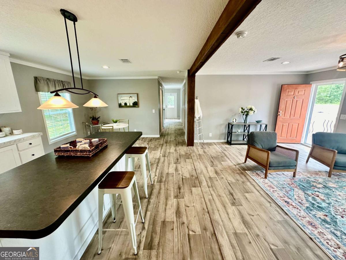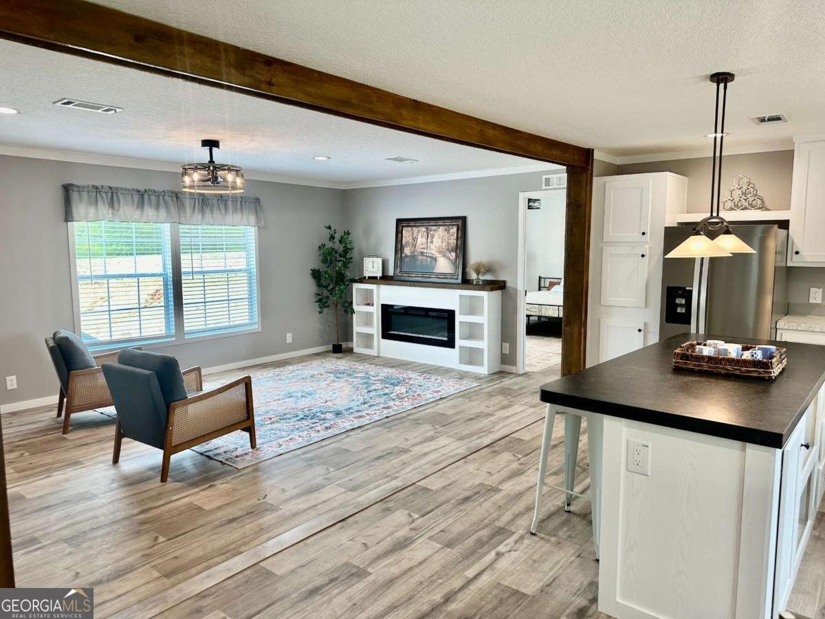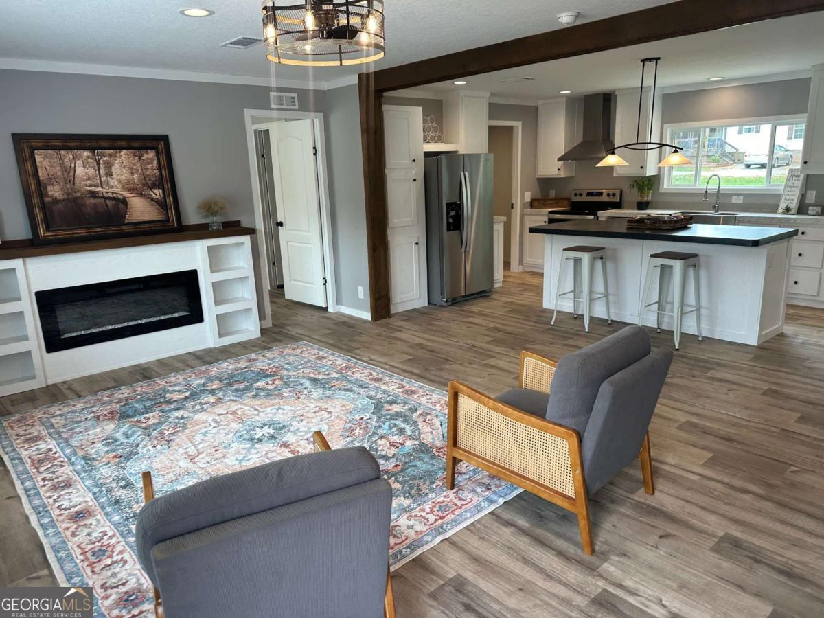 Welcome home to this beautifully maintained, like-new 3-bedroom, 2-bath ranch nestled on just over an acre in Cleveland. Offering 1,568 square feet of thoughtfully designed living space, this home features an open-concept layout paired with custom finishes throughout. From the moment you arrive, you'll notice the craftsmanship with custom wood accents inside and out, a solid all-brick foundation, and durable OSB-wrapped construction. Inside, the home flows seamlessly from the living room into the kitchen and dining area, complete with stainless steel appliances, a kitchen island, and a cozy remote-controlled fireplace. Designed for both comfort and efficiency, the home includes a spacious mud room, upgraded insulation, energy-efficient windows, and a programmable thermostat. The split-bedroom floor plan offers privacy, with a generously sized owner's suite on the main level featuring a soaking tub, separate shower, double vanity, and walk-in closet. Additional features include beamed ceilings, durable vinyl flooring, and stylish modern finishes throughout. Enjoy the outdoors on custom-stained decks overlooking a level 1.01-acre lot, complete with a 10x12 shed for added storage and convenience. There is plenty of space to add a future garage or workshop, allowing the property to grow with your needs. With no HOA and a prime North Georgia location, this home offers the perfect blend of privacy, quality, and everyday convenience.