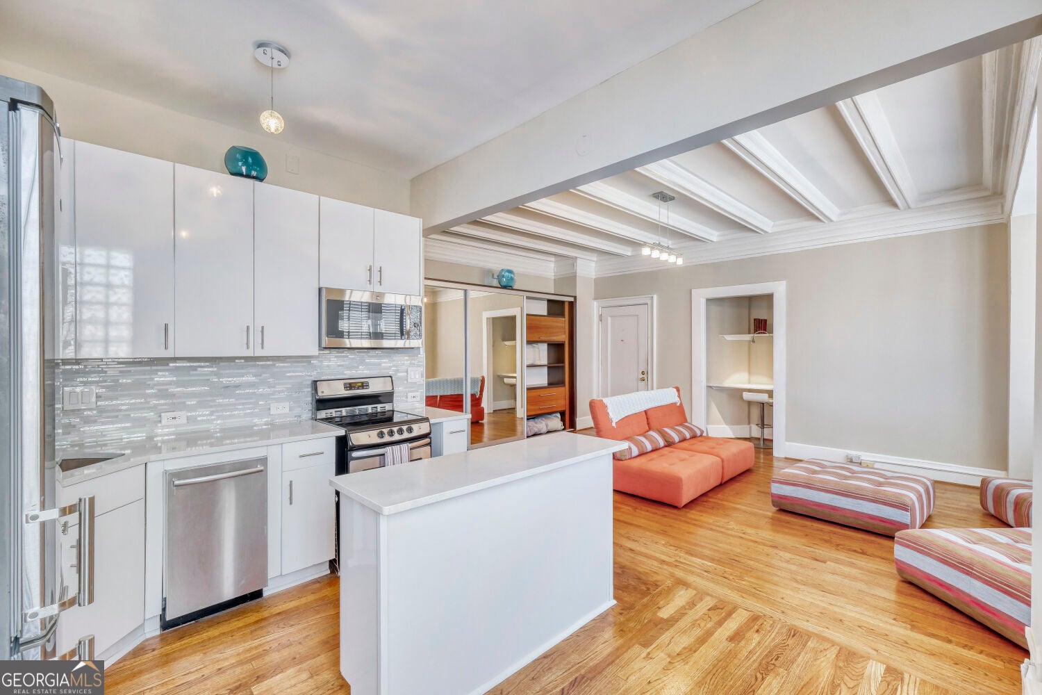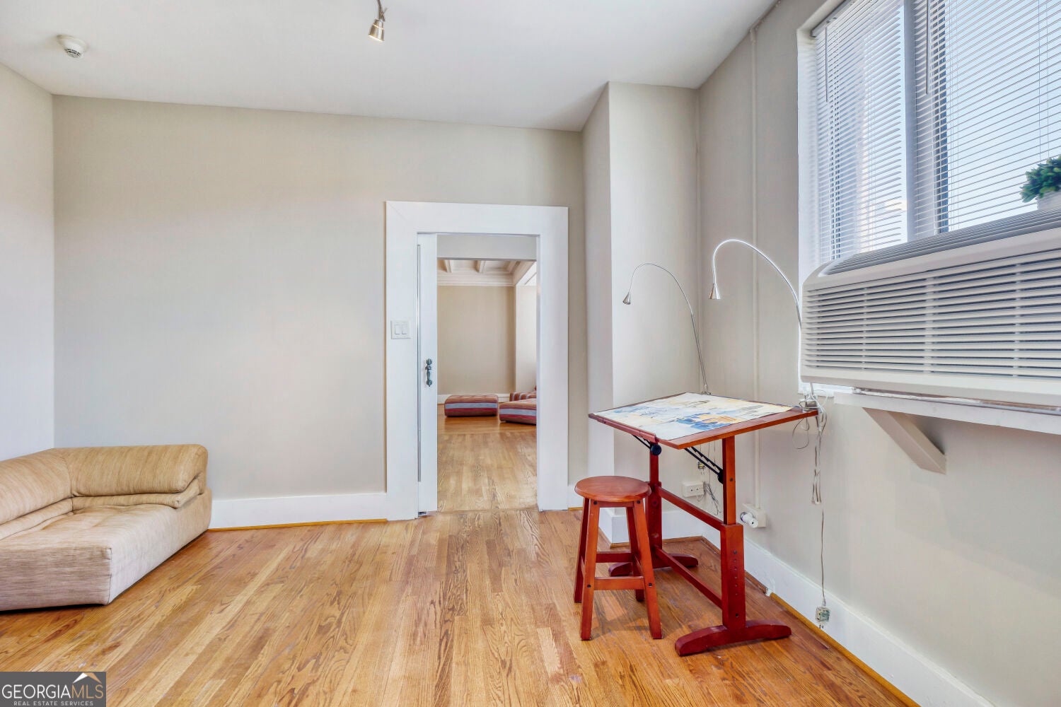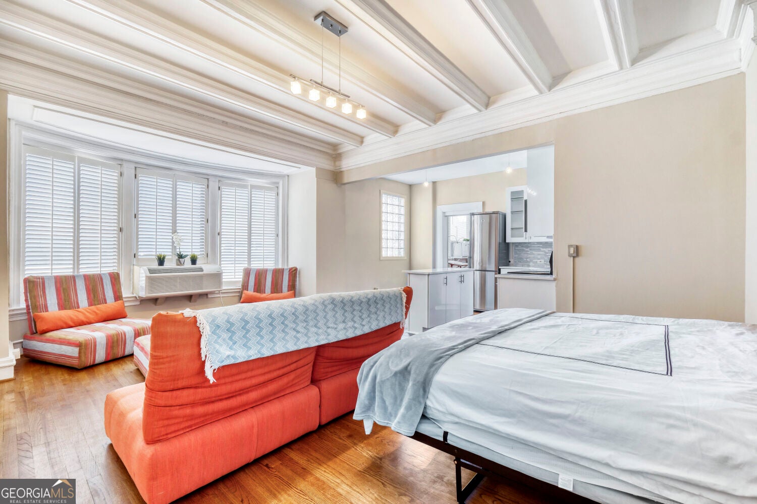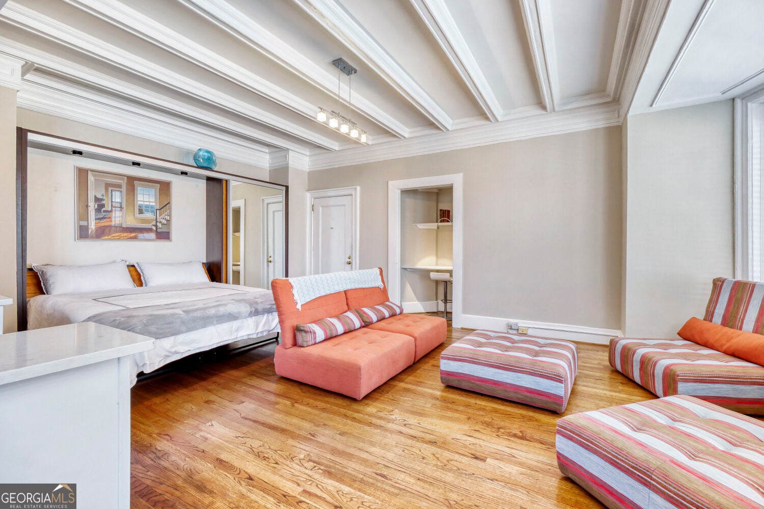 Former artist studio seeks new owner! Experience this eclectic, spacious, light and bright studio in an iconic building close to everything Midtown has to offer. Steps from The Proton Center, The Fox and PDH as well as public transportation. Bike to the High Museum, SCAD, GA Tech, Ponce City Market, The Beltline, Piedmont Park, Trader Joe's, Whole Foods, Publix and so, so much more! Hardwoods throughout, the main room has a nine foot beamed ceiling with molding and includes a king-sized Murphy bed and office nook. The upgraded kitchen has contemporary cabinets with soft-close doors and apartment-sized appliances with room for a small dining table. A mirrored pocket door separates a flex space from the main area and a third room serves as a walk-in closet, in-unit full-sized laundry and three piece washroom. A king-sized Murphy bed and the six piece custom designed living room furniture are included in the sale. The Ponce amenities include a rooftop deck that has views for miles (to Stone Mountain on a clear day), bike storage, a small gym, storage units (for rent) and a guest suite available for rent. Unit does come with one parking space. This will be a match made in heaven for the discerning buyer!