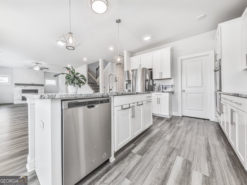 Step into a beautifully appointed kitchen featuring sleek granite countertops, an expansive center island with a stainless steel sink, and abundant white cabinetry complete with convenient pull-out drawers. Enjoy cooking with brand-new double ovens, a 4-burner gas cooktop, upgraded fixtures, a spacious walk-in pantry, and a breakfast bar-perfect for both everyday living and entertaining. This east-facing home welcomes you with a light-filled flex space, ideal for a home office, yoga studio, library, or playroom. The inviting living room is filled with natural light from large windows, offers direct backyard access, and showcases stunning evening sunset views. A striking stone fireplace serves as a warm and elegant focal point. Upstairs, the open layout overlooks the living room below, creating an airy, connected feel while allowing easy interaction with family. Stylish wooden railings along the staircase further enhance the home's sense of openness and charm. Enjoy one of the largest fully fenced backyards in the neighborhood-perfect for relaxing, playing, or hosting gatherings. The partially covered patio features a 3-4 ft wooden privacy wall and ceiling fan, creating a comfortable and private outdoor retreat. The front and side lawns are professionally maintained by the HOA for added convenience. Nestled in a quiet, peaceful community, this home offers the perfect blend of comfort and convenience. Additional highlights include an upstairs loft, spacious primary suites with double vanities and walk-in closets, a large laundry room, multiple storage spaces, smart home features, and front-door camera surveillance. A brand-new HVAC system (2025) with a 10-year warranty adds peace of mind. L