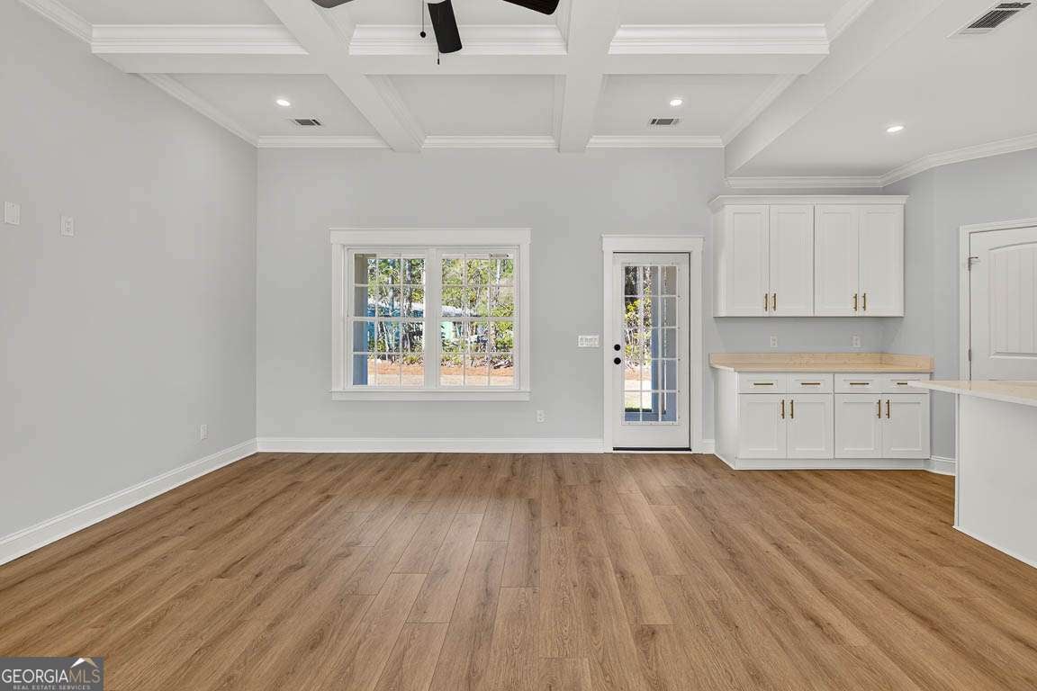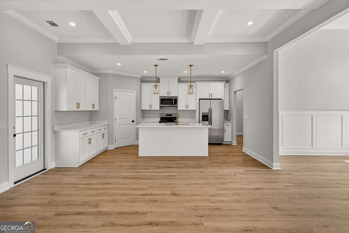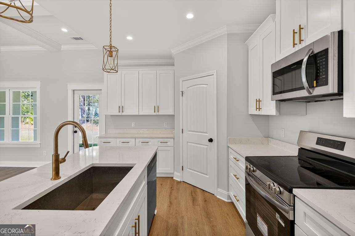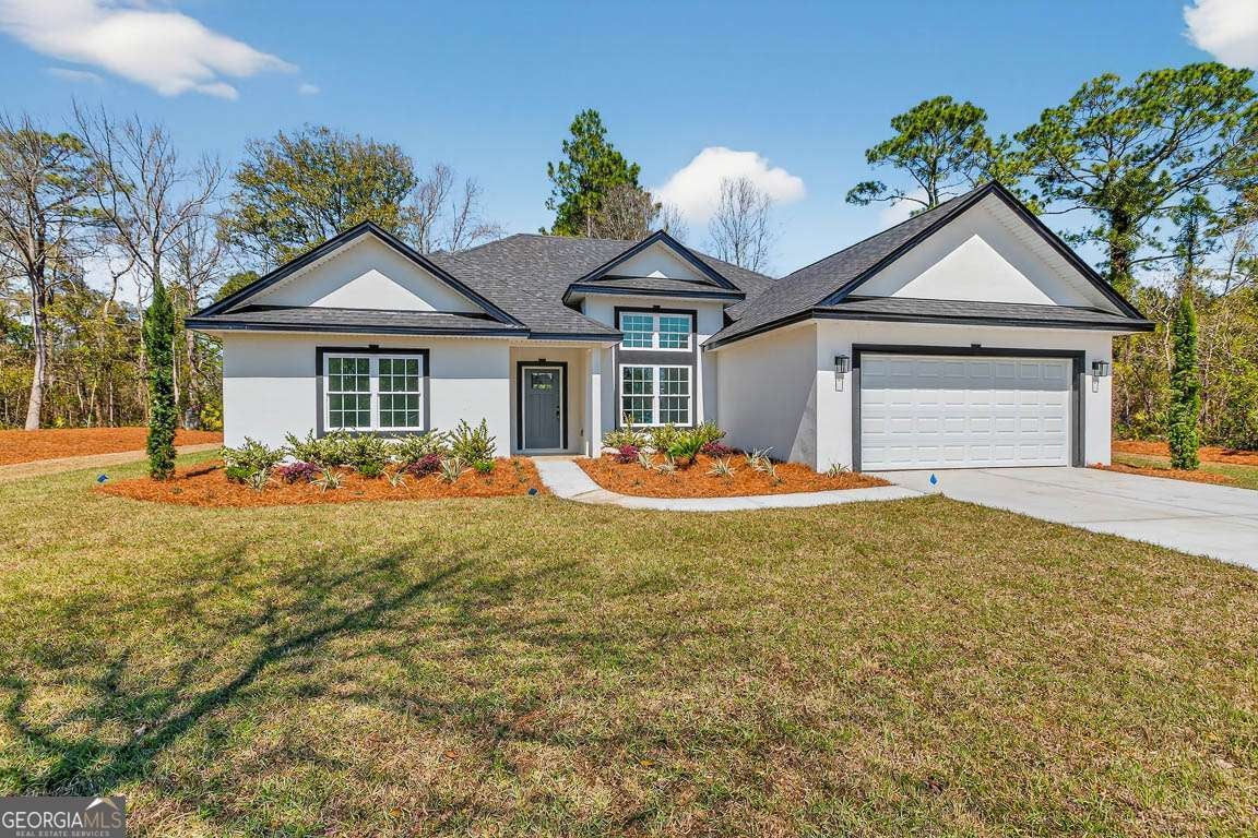 Discover this move in ready, brand-new construction home offering 1,894 square feet, this thoughtfully designed 4-bedroom, 2.5-bath residence sits on a generous 0.54-acre lot with a stylish stucco exterior. A welcoming foyer leads to the dining and living rooms, all boasting high ceilings and luxury vinyl plank flooring throughout. The living room is highlighted by elegant trayed ceilings, while the split-bedroom floor plan ensures privacy. The kitchen impresses with a large island, pantry, and stainless-steel appliances. The spacious primary suite features a walk-in closet with custom wood shelving, plus an ensuite bath with dual vanities, a separate tiled shower, and a soaking tub. Three additional guest bedrooms, a convenient laundry room, and a powder room complete the interior. Enjoy outdoor living on the back porch overlooking a yard framed by gorgeous trees and take advantage of the two-car garage for ample storage and parking.