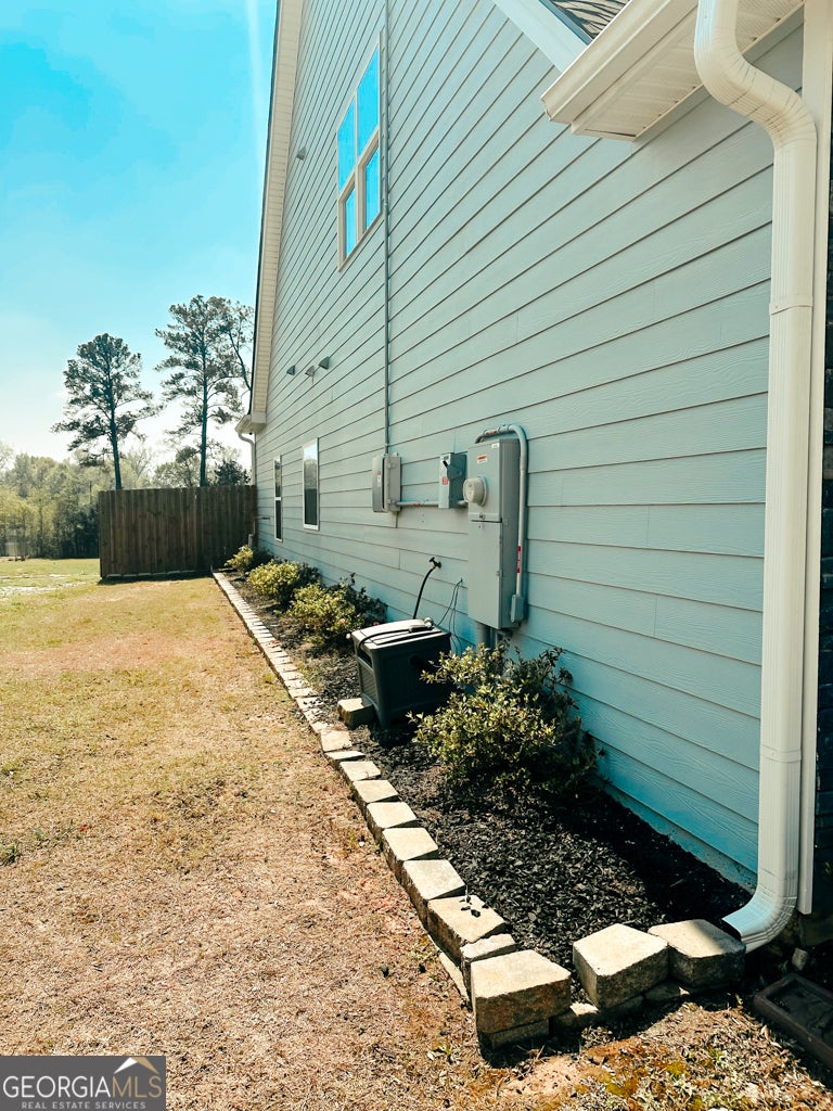 COME SEE GORGEOUS CRAFTSMAN-style home with SOLAR POWERED UTILITIES, cement siding and stone accents with a pond view. Enter the 2-story foyer in this 4 BR 3.5 bath home with formal living room, a large separate dining room with coffered 9-foot ceilings and shadowbox moldings. The open concept interior design connects the kitchen and breakfast area with a vaulted-ceiling great room and fireplace with gas logs and wood-burning insert. Stainless Steel appliances, gas cooktop, pantry and backsplash in the kitchen. The Master Suite is tucked away on the Main level as well as the laundry room and 1/2 bath. Upstairs are three bedrooms with 2 full baths. Closets have shelves & organizing systems. New, huge, covered deck on the back privacy-fenced yard and an outdoor shed. Double attached garage with shelving and cabinets. Underground utilities and bills under $200/month. Complete Home Security system installed with monthly monitoring.