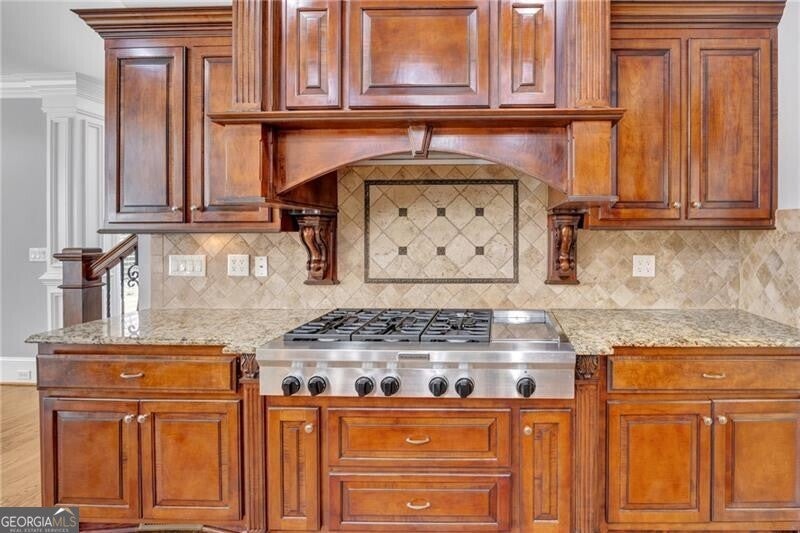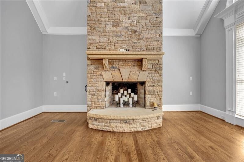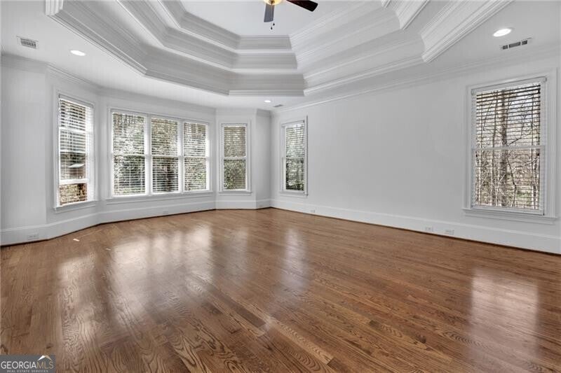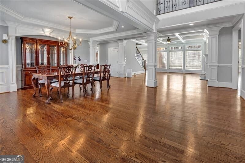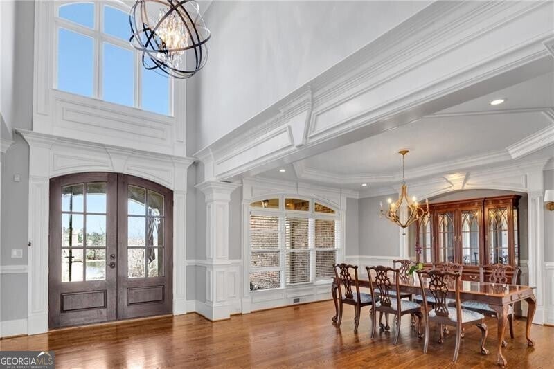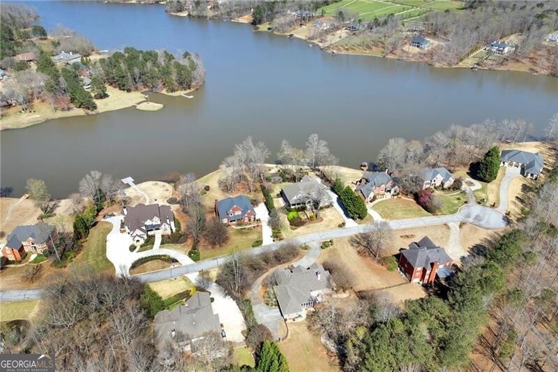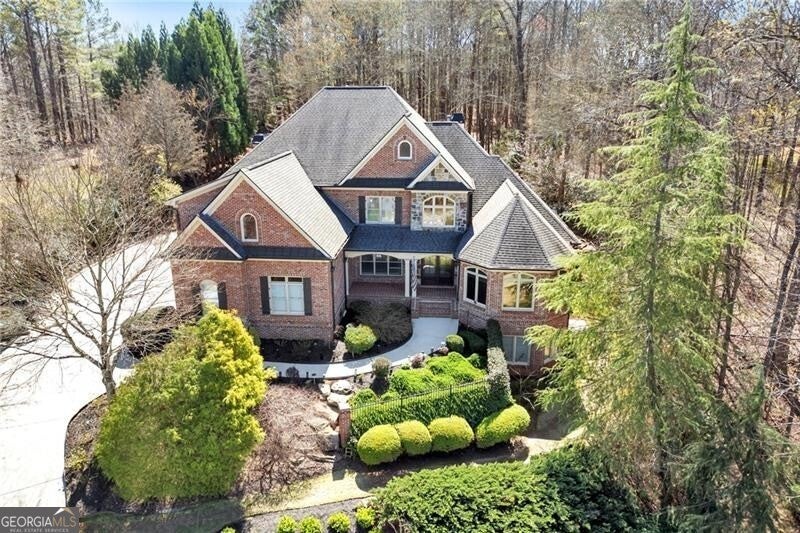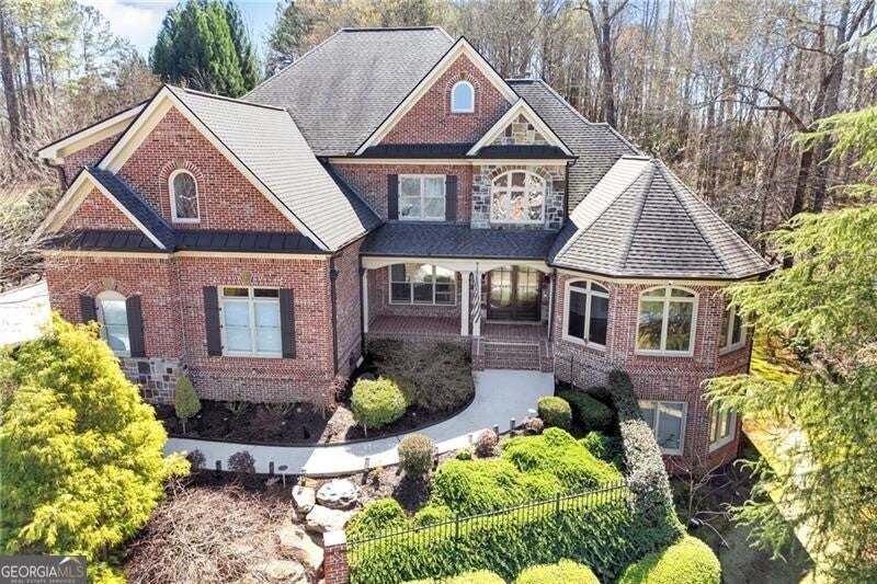Enjoy lake views from your private front porch in this exquisite four-sided brick estate with stone accents, offering approximately 5,700 sq ft of refined living space in a prestigious gated community. From the moment you enter, you're welcomed by abundant natural light, rich hardwood floors, an extensive trim package, and striking architectural details including vaulted, coffered, and turret ceilings with intricate moldings throughout. Designed for both everyday living and elevated entertaining, the home features a beautiful formal living room with a gorgeous, vaulted ceiling, perfect as a peaceful sitting area or private office. The grand living room is equally impressive, centered around a fireplace flanked by custom built-in bookcases. The chef's kitchen is a true showpiece, complete with two oversized islands, custom cabinetry, stainless steel KitchenAid appliances, granite countertops, and an expansive walk-in pantry with refrigerator outlet and water line. The spacious breakfast area easily accommodates large gatherings, while the vaulted keeping room with a dramatic stone fireplace creates a warm and inviting atmosphere. The main-level owner's suite offers a private retreat, featuring a sitting area, direct access to the backyard, and a spa-inspired bath with heated floors, jetted soaking tub, oversized dual-head shower, and a custom walk-in closet system. Upstairs, you'll find a spacious media room ideal for a playroom or homeschool space, a versatile bonus room, and three oversized bedrooms - each with walk-in closets and private baths, providing comfort and privacy for family and guests. Additional highlights include an oversized mudroom with built-in cabinetry, a laundry room with sink, a 3-car side-entry garage, landscape lighting, and designer finishes throughout. The unfinished terrace level offers endless potential and is already equipped with a full bath and laundry connection, ready to be customized to fit your lifestyle. Enjoy resort-style living in this exclusive gated lake community, featuring a clubhouse, pool, tennis courts, pavilion, community dock, and boat ramp on a breathtaking 300+ acre lake
