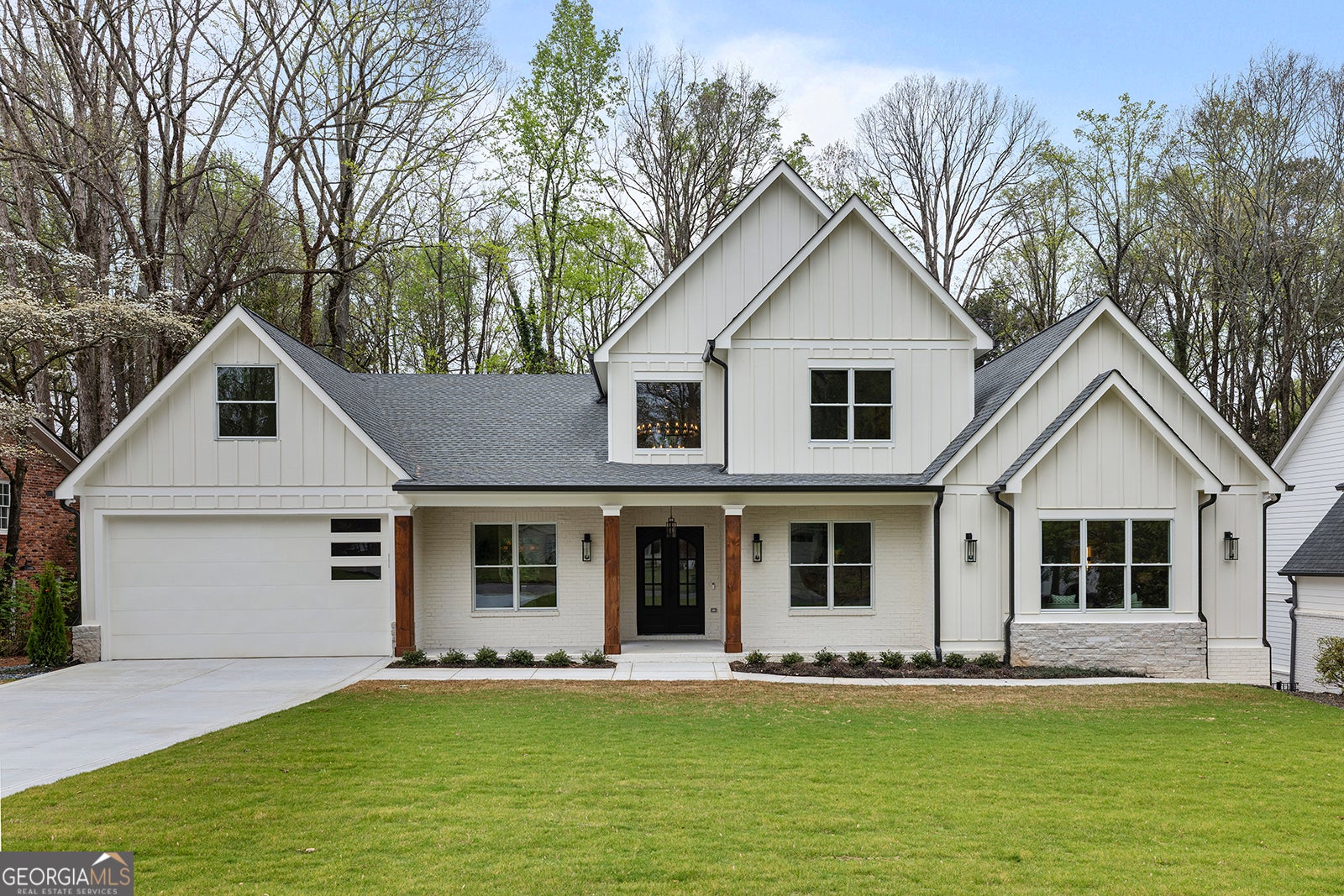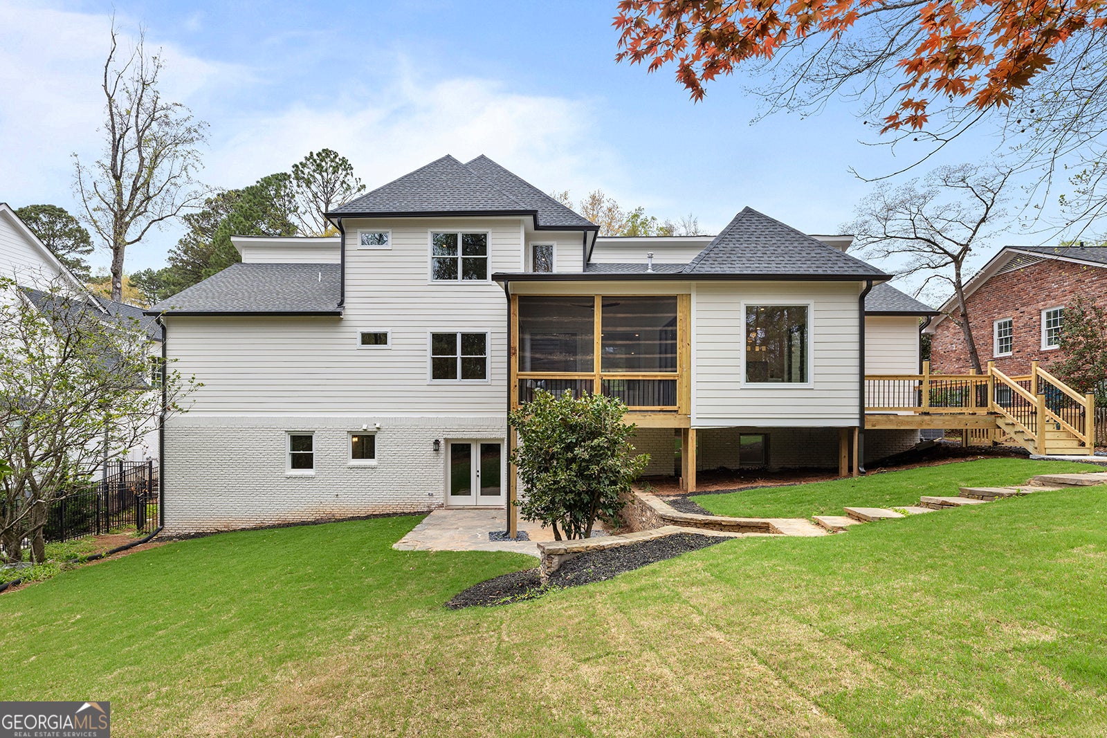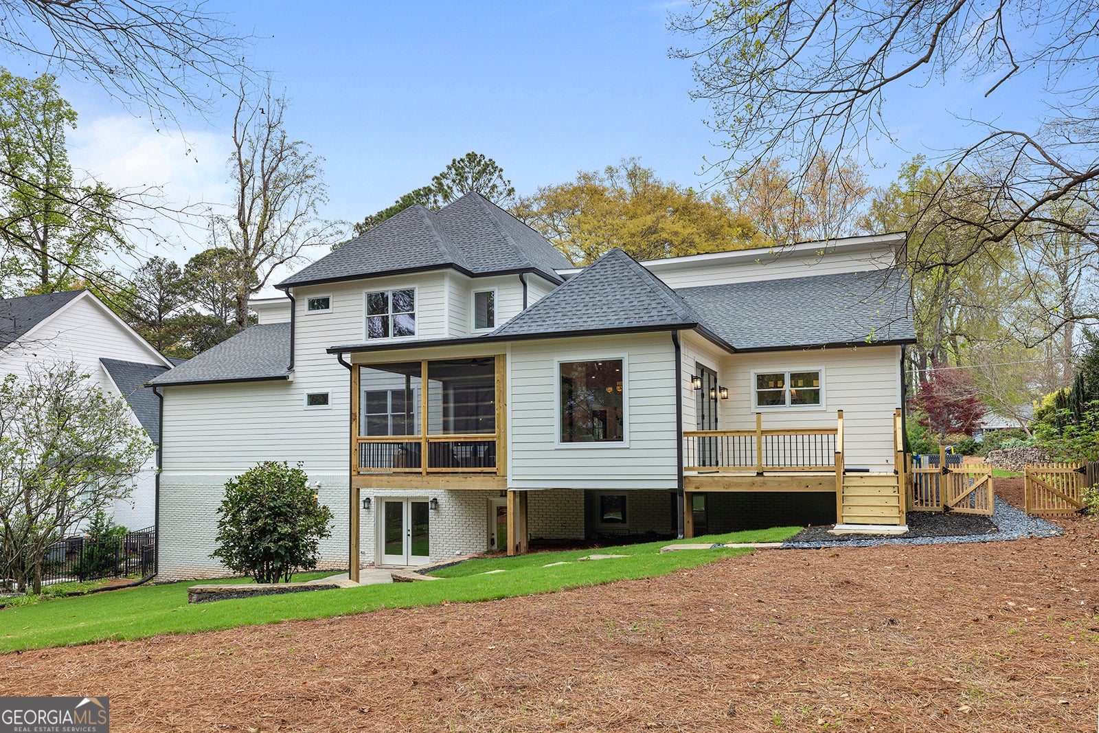 Open and filled with natural light, this brand new North Buckhead home sits on over half an acre and offers a flat, private backyard perfect for outdoor living and entertaining. Thoughtfully designed for both comfort and style, the home features a spacious primary suite and guest suite on the main level, along with a private office, formal dining room, and hardwood floors throughout. The bright white kitchen is appointed with quartz countertops, stainless steel appliances, and a sunny breakfast area, all opening seamlessly to the fireside family room. French doors lead to a deck and screened porch, creating effortless indoor and outdoor flow. A conveniently located laundry room completes the main level. Upstairs, you will find three generously sized bedroom suites, each offering privacy and comfort. The finished daylight basement adds exceptional versatility with an additional bedroom suite, a second laundry area, generous storage, and flexible space for everyday living.