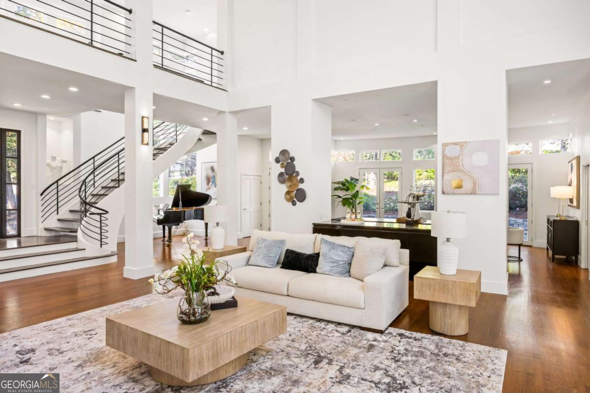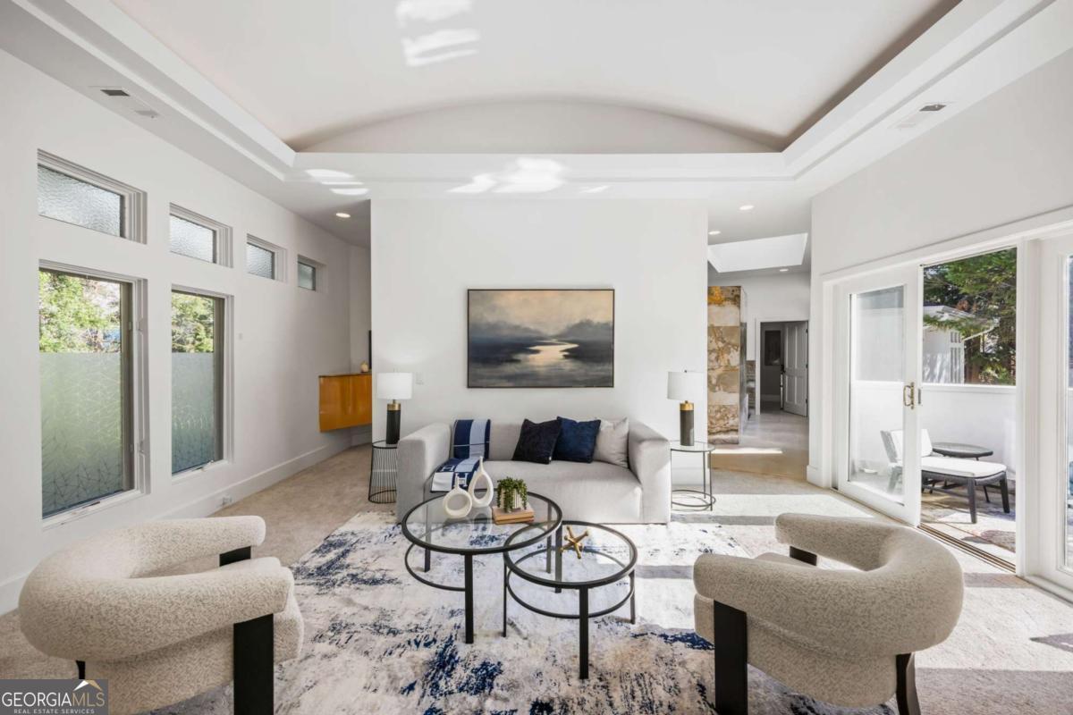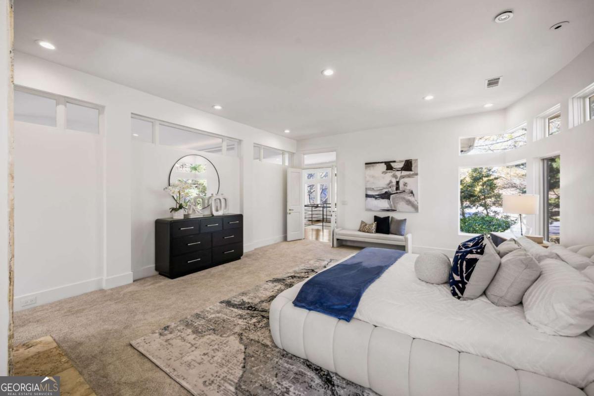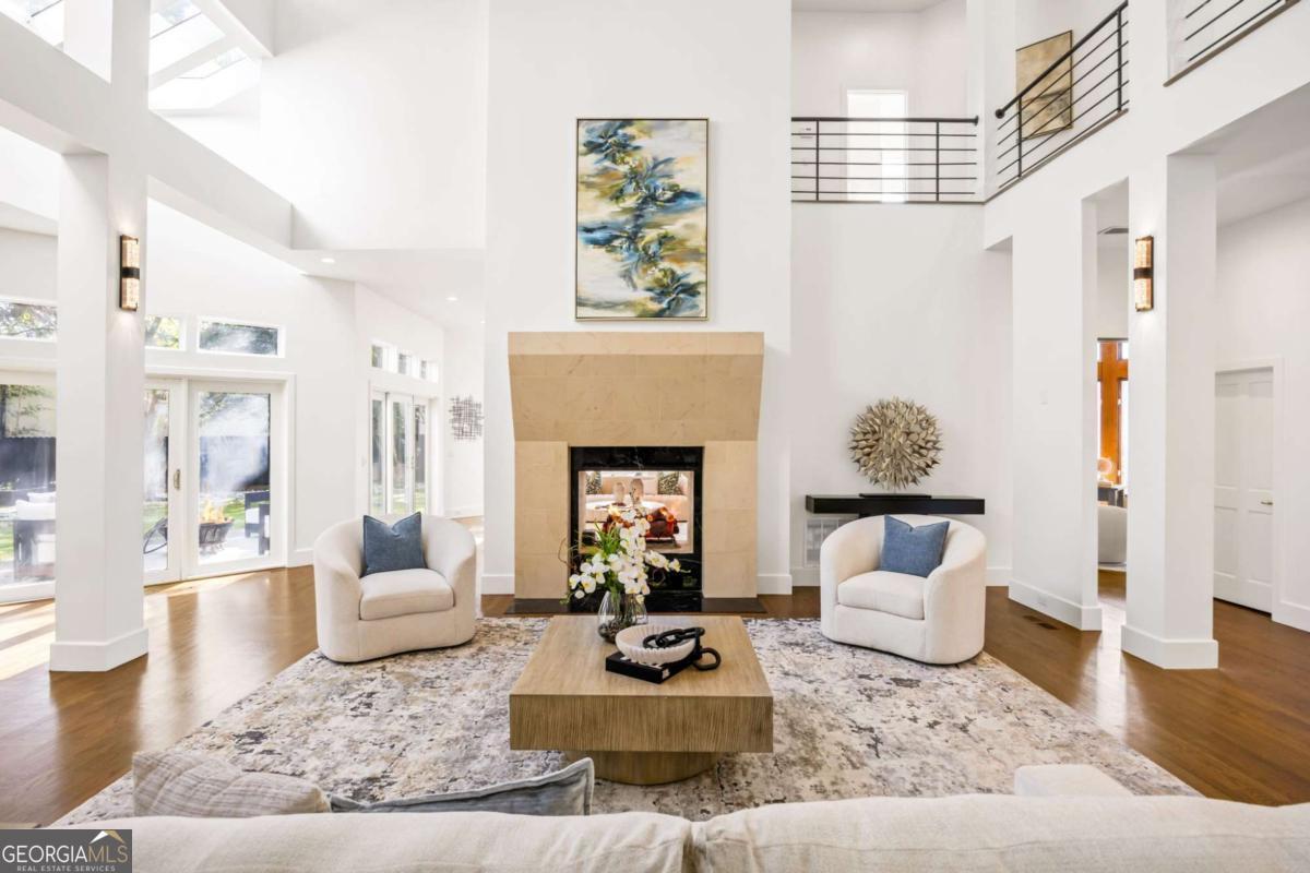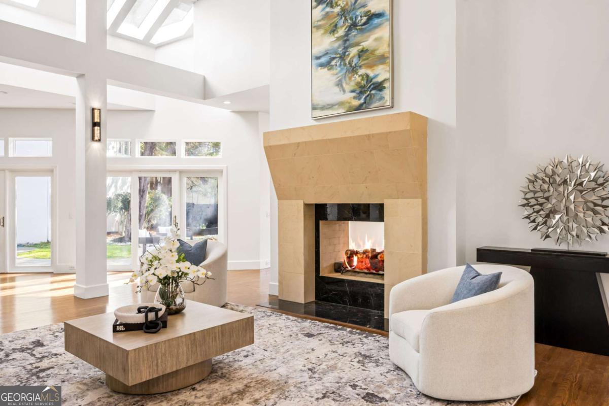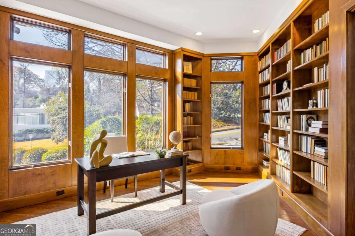 Incredible opportunity to own a spacious and unique residence in Ansley Park, one of Atlanta's most established and desirable neighborhoods. Situated on a rare over half-acre corner lot, this property offers approximately 8,000 square feet of living space with convenient access to Midtown, Buckhead, and major highways. The main level features a two-story living room with floor-to-ceiling windows providing abundant natural light. The open floor plan flows into a renovated kitchen with a large granite island, custom cabinetry, stainless steel appliances, and a separate breakfast/bar area. A double-sided fireplace connects the main living and dining areas. Also on the main level is a library/office with built-ins, closet, and access to a full bathroom, offering flexibility for use as an additional bedroom. Upstairs, the owner's suite includes a sitting area, vaulted ceiling, fireplace, private balcony with morning bar, and an en-suite bathroom with dual vanities, walk-in shower, and whirlpool tub. Two additional ensuite bedrooms and a loft area complete the upper level. The property includes two separate guest suites, each with private entrances: a carriage house above the garage with full kitchen, living area, bedroom, and bathroom, and a terrace-level suite with full kitchen, living area, bedroom, and bathroom. The backyard is flat and private, offering space for outdoor living and potential future improvements such as a pool or outdoor kitchen. Conveniently located near parks, shopping, dining, and Atlanta's cultural amenities.