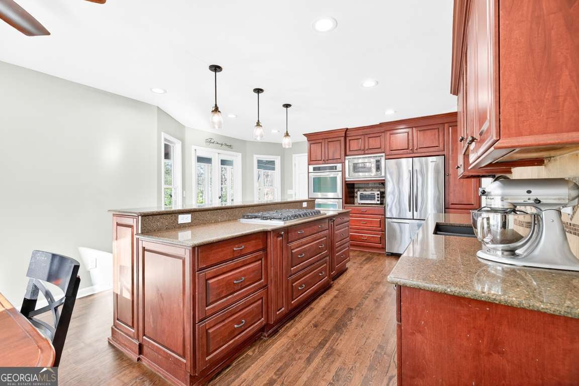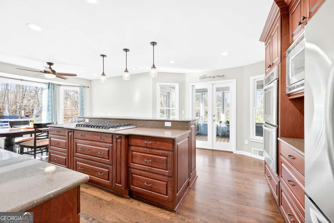 - AppliancesCooktop, Dishwasher, Double Oven, Gas Water Heater, Microwave, Oven (Wall), Refrigerator, Stainless Steel Appliance(s)