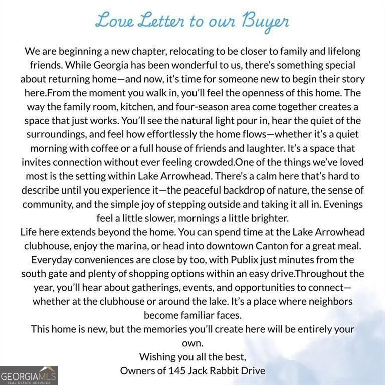 NEW CONSTRUCTION RANCH || READY MID-APRIL || GATED LAKE COMMUNITY || OPEN-CONCEPT ONE-LEVEL LIVING || 540-ACRE SPRING-FED LAKE || RESORT-STYLE AMENITIES || MOUNTAIN + WOODED SETTING || FROM THE OWNERS: We are beginning a new chapter, relocating to be closer to family and lifelong friends. From the moment you walk in, you'll feel the openness of this home. The family room, kitchen, and four-season area flow together in a way that feels natural and easy, with light coming in and a quiet setting all around. What we've loved most is the calm of Lake Arrowhead-the natural surroundings, the sense of community, and the ability to step outside and enjoy it daily. Whether at the clubhouse, marina, or heading into Canton for dining and shopping, everything is accessible while still feeling removed from the pace of everyday life. This home is new, but the memories you'll create here will be entirely your own. FROM THE LISTING AGENT: This home represents a combination of new construction, one-level living, and access to a gated lake community that is difficult to replicate without extended build timelines. The value is supported by the structure of Lake Arrowhead, the scale of its amenities, and the positioning within a private, maintained environment. A compiled "Life at 145 Jack Rabbit Drive" property summary is available for review and includes the owner's perspective, documented improvements and maintenance history, neighborhood insights, and answers to KEY BUYER QUESTIONS designed to help buyers evaluate the home with clarity and confidence.