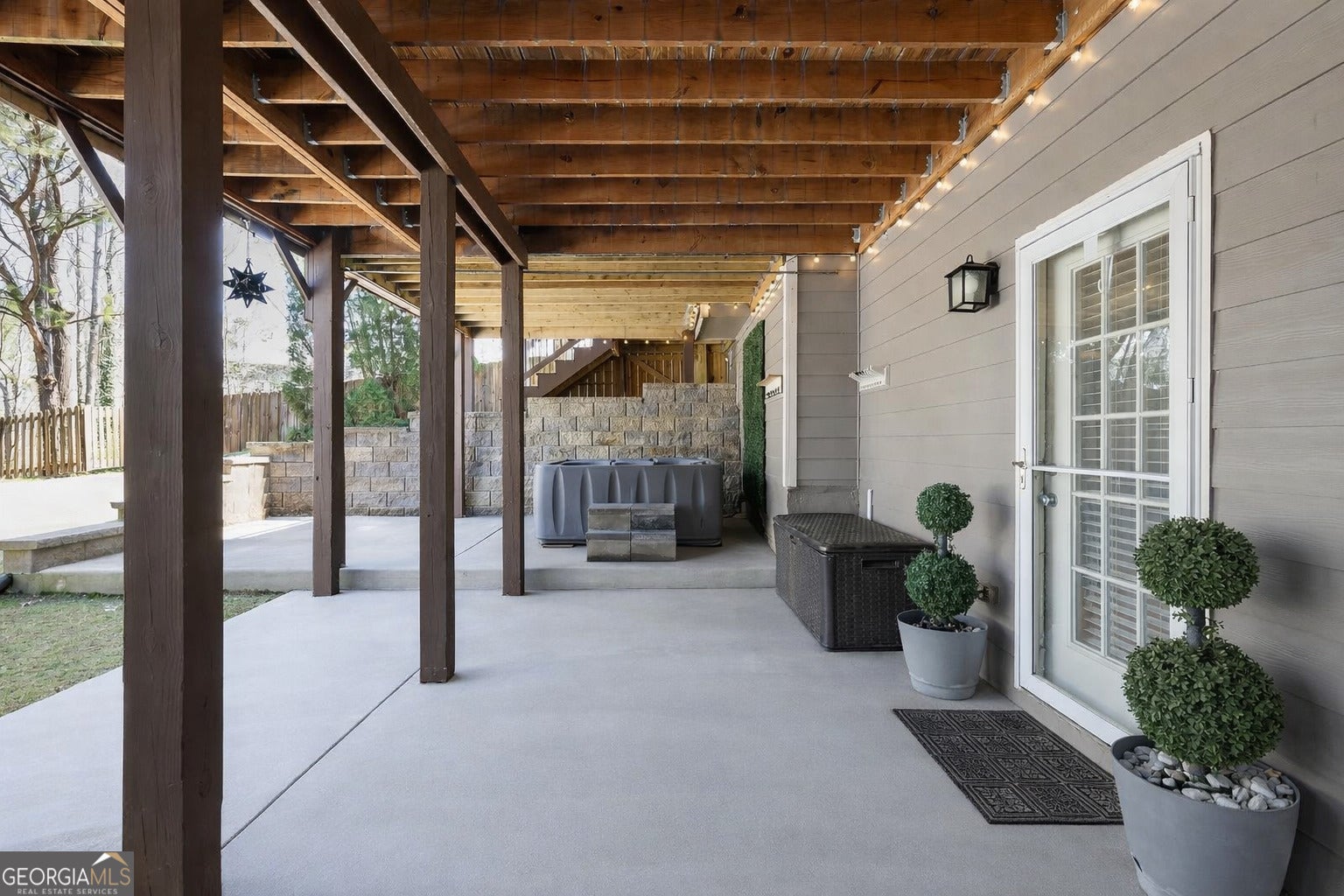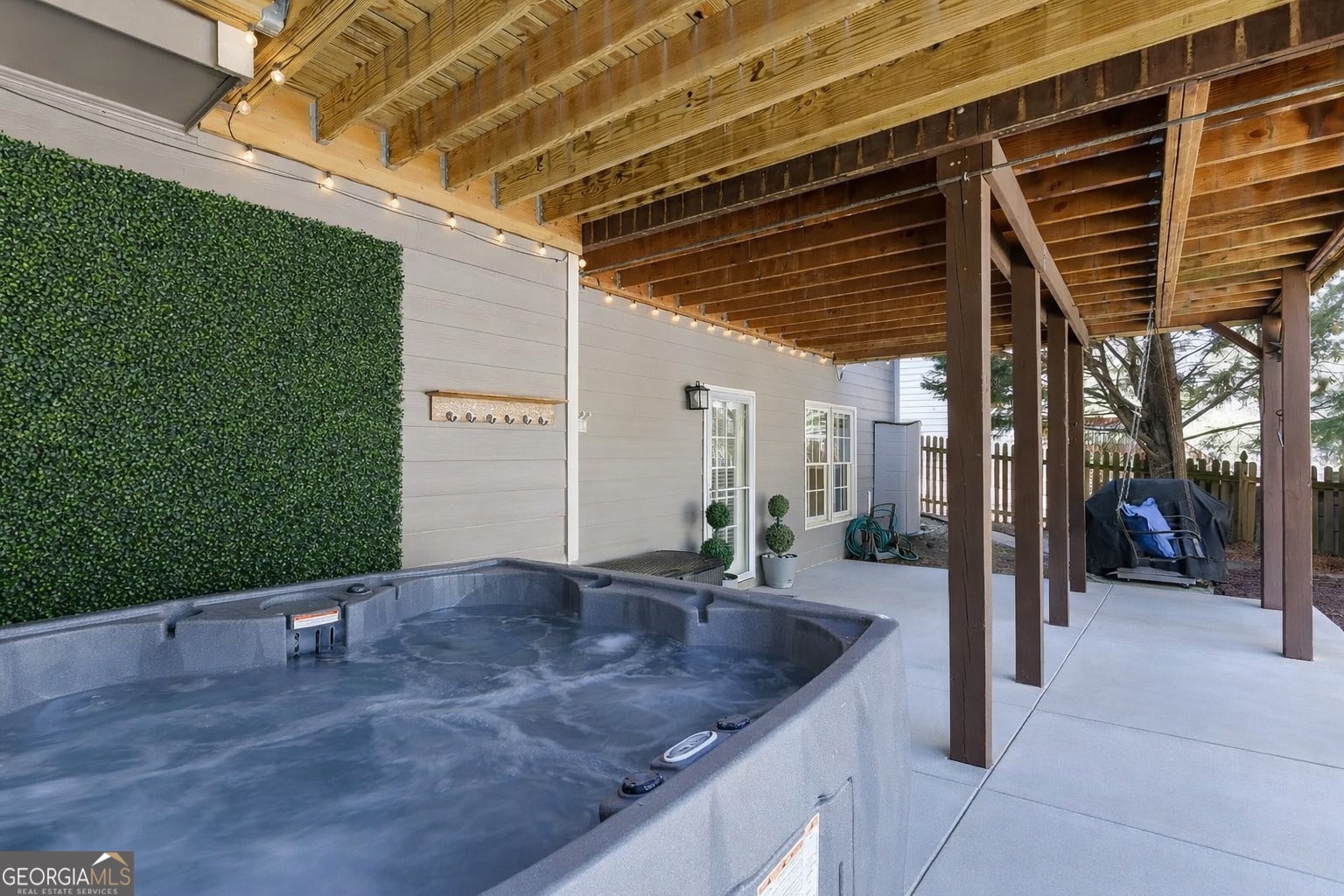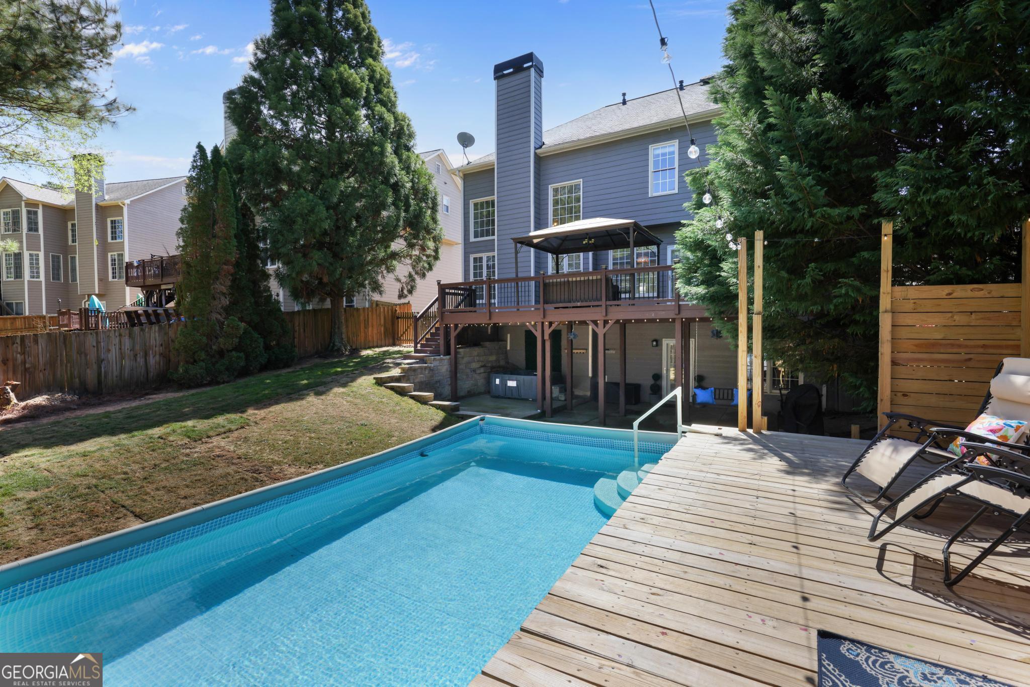 Welcome to your own RETREAT within the sought-after Retreat at Old Vinings Lake. Step into one of the most desirable backyards in the neighborhood and a home designed for both entertaining and everyday living. The outdoor experience is truly a standout, featuring a saltwater pool surrounded by a beautifully finished pool deck, perfect for lounging and enjoying warm days. Just off the main level, the upper deck offers a covered pergola, cafe lighting, and a comfortable lounge area ideal for relaxing or hosting. Below, the lower outdoor living space creates an additional retreat with a covered patio, jacuzzi, and a cozy porch swing, perfect for unwinding year-round. The backyard has also been refreshed with newly added sod and is fully fenced, backing to a private wooded lot that offers both beauty and added privacy. All outdoor furnishings and features remain with the home, offering a turnkey outdoor lifestyle from day one. Inside, this 4-bedroom, 3.5-bath home offers a functional layout with thoughtful updates throughout, including fresh interior paint on the main and upper levels, refinished flooring on the main level, and new carpet on the upper level. The kitchen offers a view to the two-story great room filled with natural light, creating an open and inviting space for everyday living and entertaining. Upstairs, you'll find a spacious primary suite with a walk-in closet, along with three additional bedrooms and a full bath, offering both comfort and functionality. The finished basement expands your living space with a dedicated theater room featuring theater seating that remains with the home, plus a wet bar, two additional rooms, and a full bath, ideal for guests, a home office, gym, or flex space. The garage remains fully functional for two car parking, while also offering a versatile flex space perfect for a home gym or workshop! Located in a resort-style community featuring a pool, 14-acre lake with walking trail, sidewalks, tennis and pickleball courts, and playground. Location can't be beat! Just 20 minutes to downtown Atlanta, Hartsfield-Jackson Airport, Truist Park, and The Battery.