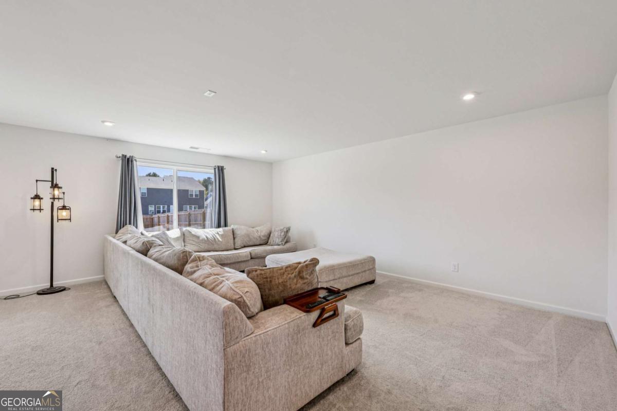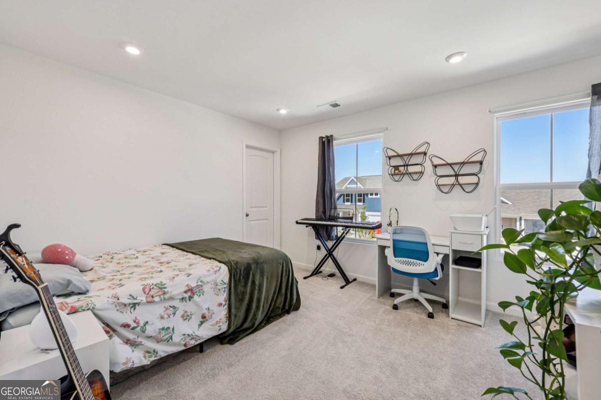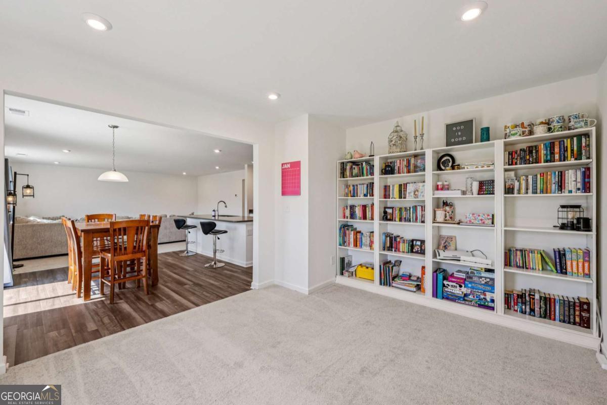 This like-new, beautifully maintained home boasts thoughtful upgrades and a flexible layout tailored for modern living. Key features include a bright, airy living room filled with natural light and an on-trend kitchen equipped with granite countertops, stainless steel appliances, a breakfast bar, ample cabinet and prep space, and a sunny breakfast room overlooking peaceful fenced backyard views. An upgraded flex room adjacent to the kitchen offers versatile use as a home office, cozy sitting area, or second living space. The main level also includes a bedroom and full bath, ideal for guests. Upstairs, a generous loft serves as a perfect media or hangout room. The spacious primary suite is a true retreat with an en-suite bath featuring dual sinks, a garden tub, separate shower, and a large sliding window that brightens the space with natural light. Three additional bedrooms, a full bath, and an upstairs laundry room complete the upper level. Outside, enjoy a level, fully fenced backyard with plenty of green space and a 12x14 concrete patio perfect for grilling and entertaining. Additional conveniences include a hardwired electric vehicle charger in the garage and direct sidewalk access to a local park. Community amenities such as walking trails, access to ball fields and a central mailbox station are just moments away, enhancing your lifestyle in this exceptional home.