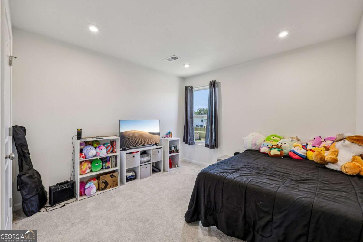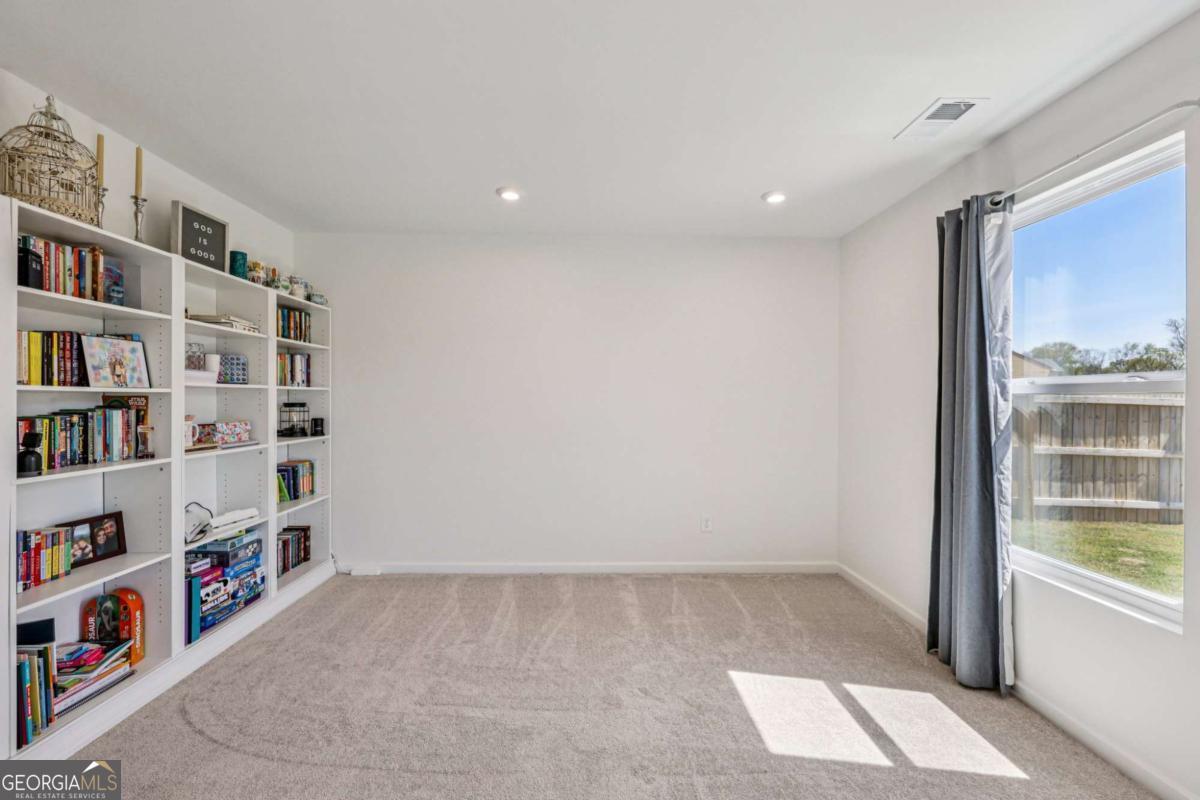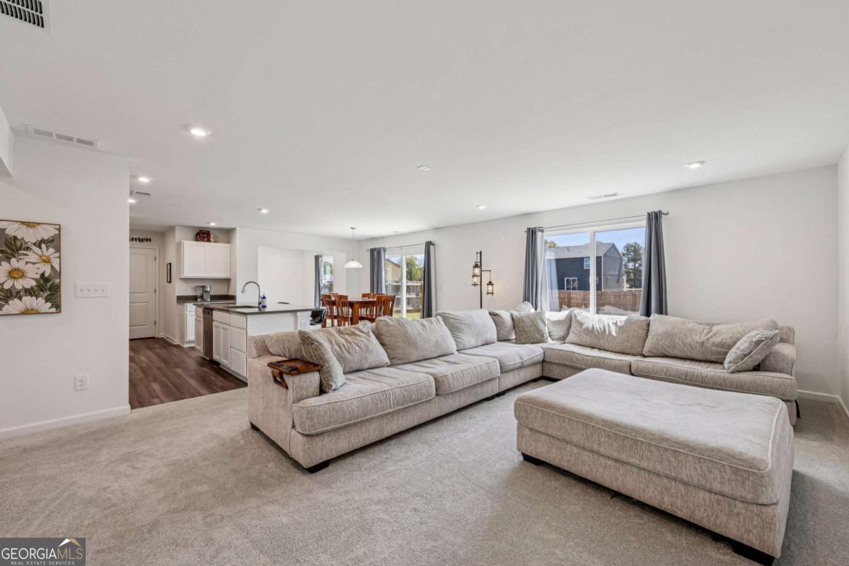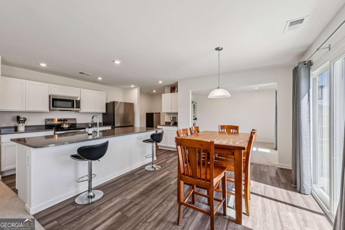 This like-new, beautifully maintained home boasts thoughtful upgrades and a flexible layout tailored for modern living. Key features include a bright, airy living room filled with natural light and an on-trend kitchen equipped with granite countertops, stainless steel appliances, a breakfast bar, ample cabinet and prep space, and a sunny breakfast room overlooking peaceful fenced backyard views. An upgraded flex room adjacent to the kitchen offers versatile use as a home office, cozy sitting area, or second living space. The main level also includes a bedroom and full bath, ideal for guests. Upstairs, a generous loft serves as a perfect media or hangout room. The spacious primary suite is a true retreat with an en-suite bath featuring dual sinks, a garden tub, separate shower, and a large sliding window that brightens the space with natural light. Three additional bedrooms, a full bath, and an upstairs laundry room complete the upper level. Outside, enjoy a level, fully fenced backyard with plenty of green space and a 12x14 concrete patio perfect for grilling and entertaining. Additional conveniences include a hardwired electric vehicle charger in the garage and direct sidewalk access to a local park. Community amenities such as walking trails, access to ball fields and a central mailbox station are just moments away, enhancing your lifestyle in this exceptional home.