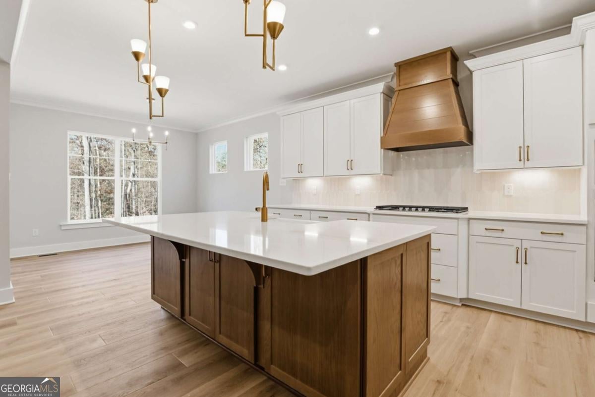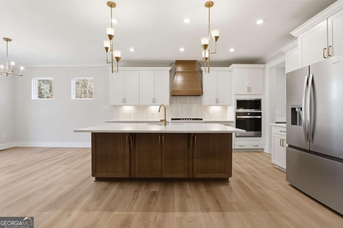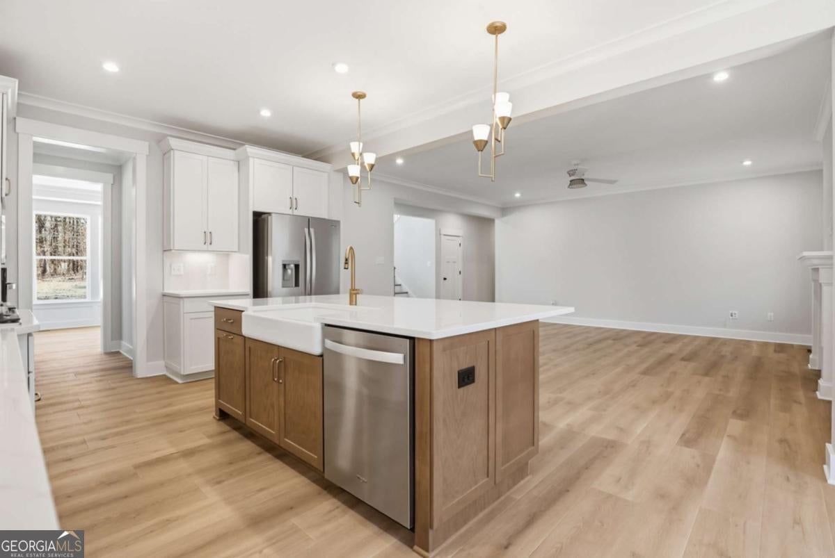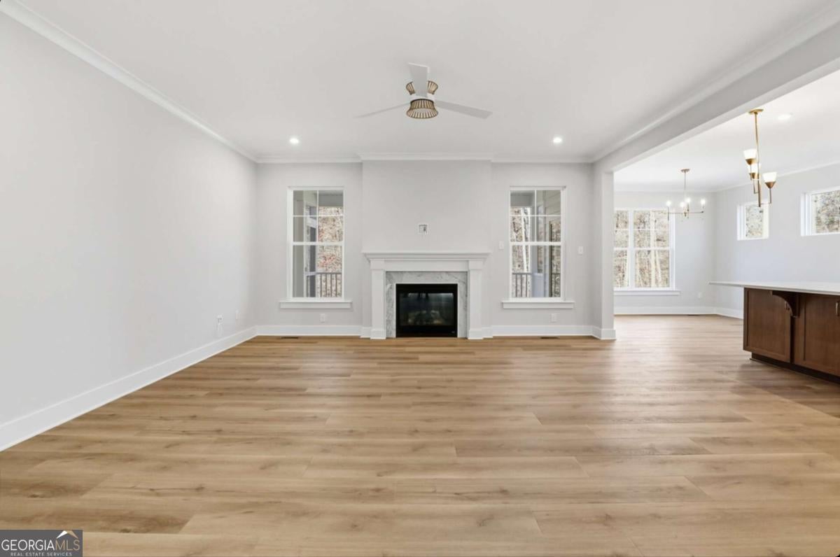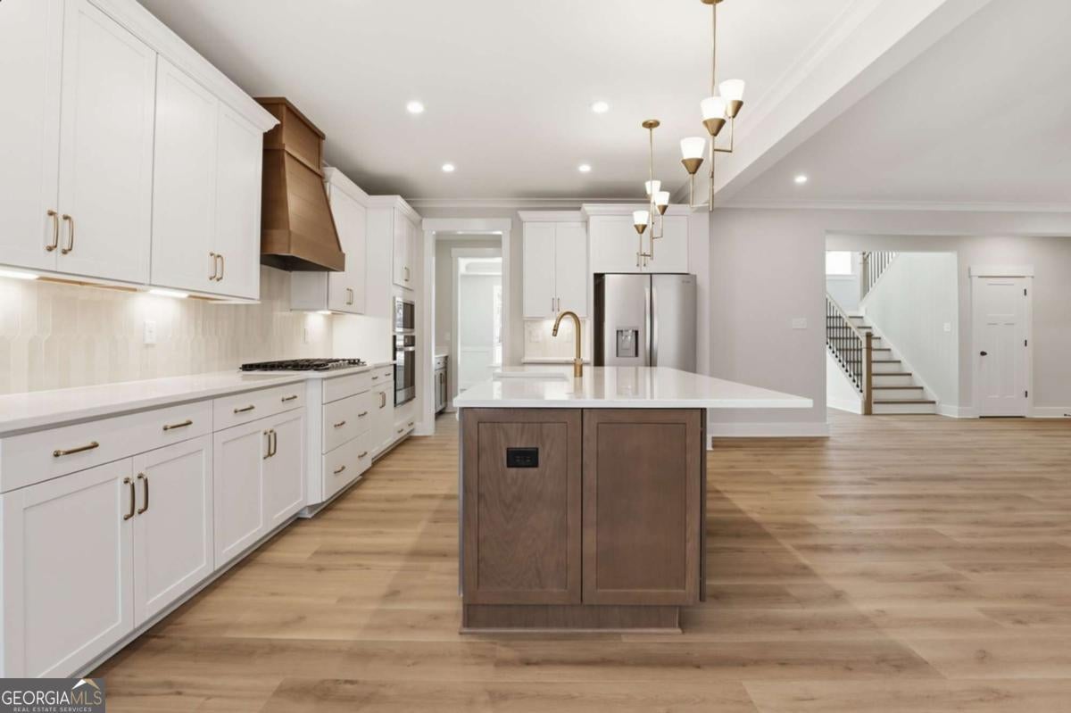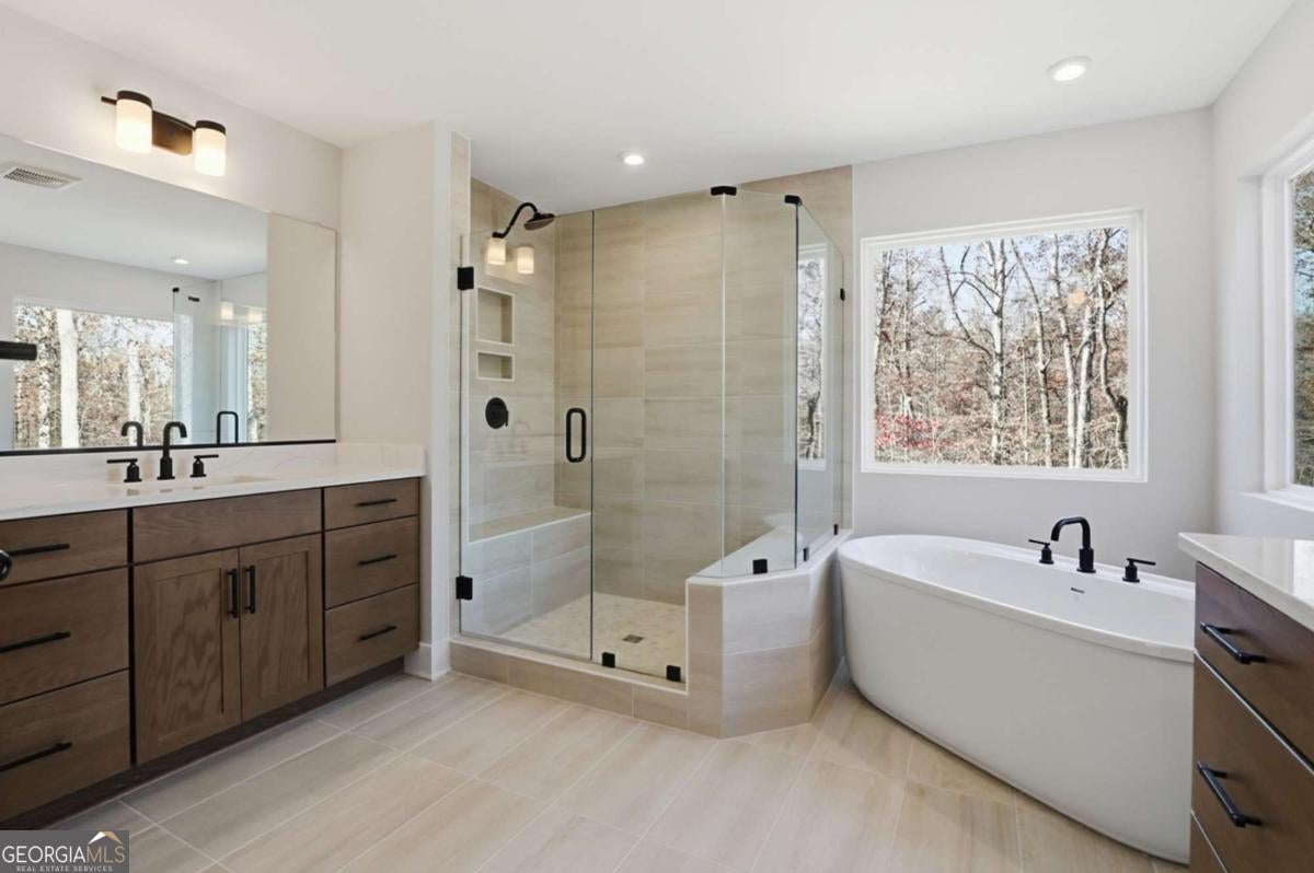 Designed for both everyday living and entertaining, this Waverly offers a guest suite and private office on the main level, a wooded backyard with an expansive patio, and a striking two-story foyer that makes an immediate impression. Tucked into the Arbor West community in Dawsonville, this beautifully designed home blends space, style, and thoughtful functionality from the moment you arrive. A soaring two-story foyer with an open stairwell welcomes you in, leading to an oversized dining space connected to the kitchen through a butler's pantry-perfect for hosting. The main living area is open and inviting, centered around a shiplap fireplace with a cedar mantel. The designer kitchen features warm brown cabinetry complemented by a contrasting white island, creating a timeless and elevated look. Step outside to enjoy the expansive back patio overlooking a wooded backdrop, offering a peaceful and private setting, while the long front driveway adds to the home's presence and convenience. The main level is thoughtfully laid out with a private office tucked away from the living areas-ideal for working from home-along with a separate guest suite for added flexibility. Upstairs, a spacious loft provides additional living space, while the primary suite offers dual closets and a spa-inspired bath complete with a freestanding soaking tub, large shower, and separate vanities. Located just minutes from downtown Dawsonville, Arbor West offers the perfect balance of quiet surroundings and everyday convenience.