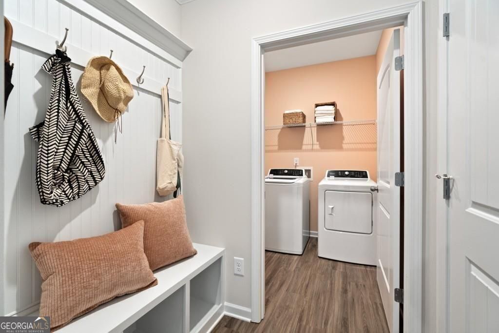 Move-in ready July! The Crawford plan in the Allen Manor community by Smith Douglas Homes.This thoughtfully designed ranch ideal for today's lifestyle, featuring single-level living with an open, airy layout that maximizes space, comfort, and functionality. If you are searching for new construction homes in Hoschton GA, near Braselton, in Jackson County, this home checks every box. From the moment you enter, you'll appreciate the spacious open floorplan with 9-foot ceiling heights and abundant natural light from additional windows throughout the home. The heart of the home is the stunning kitchen, complete with elegant white quartz countertops, a huge center island ideal for entertaining or casual dining, and beautiful evergreen cabinetry with 42-inch upper cabinets that provide exceptional storage. The kitchen flows seamlessly into the family room, creating an ideal space for gatherings, relaxing evenings, and everyday living. Upgraded luxury vinyl plank flooring runs throughout the main living areas, offering durability, style, and easy maintenance. The private primary suite is generously sized and provides a peaceful retreat, while two additional secondary bedrooms offer flexibility for guests, a home office, or hobbies. A conveniently located laundry room and a functional mudroom just off the garage entry add to the home's thoughtful design. Step outside to enjoy the rear patio and private tree lined backyard, perfect for outdoor dining, morning coffee, or unwinding after a long day. Located in Hoschton, GA, Allen Manor offers convenient access to nearby shopping, dining, schools, and major highways, making commuting to Braselton, Jefferson, and surrounding areas easy. Photos are representative of the Crawford floor plan and not the actual home. Incentives are available with the use of the seller's preferred lender.