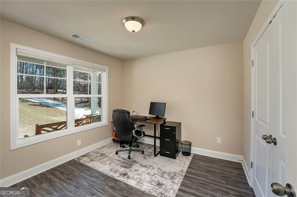 Enjoy the serenity of Lake Arrowhead in this ready to move in home. As you drive up you will enjoy the large front yard from the relaxing front porch. Enter the home to find a nice size bedroom that is currently used as an office with its own bath. You'll then enter the open floor plan featuring a large great room, kitchen with granite countertops, stained cabinetry and a walk-in pantry. Plenty of area to serve your guest from the dining area and the breakfast island. The main floor is finished off with a private primary suite with a nice size primary bath and closet. Upstairs you will find another bedroom, bath and an optional bedroom/bonus that would be perfect for a private getaway. Enjoy the wooded backyard from the covered porch great for those relaxing evening.