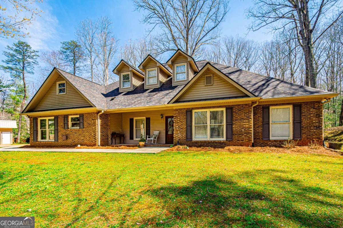 Down a winding concrete drive completely shielded from view, sits this spacious and stately all brick residence with space for everything anyone could need. Built in 2007 and situated on over three wooded acres, this Traditional American Lifted Ranch boasts a list of attributes too numerous to complete. Highlights include a new roof in 2024, renovated master bath, stacked stone fireplace and built-in shelving in the living room, a bright and cheerful sun room, versatile floor plan includes tons of flex space including craft or game room area upstairs & keeping room or dining room between the oversized kitchen and sun filled foyer. A free standing shop with power, a sprawling carport, and a separate lawn and garden equipment shed can all be found on the grounds. Six bedrooms (four down, two up) and three and a half baths ensure plenty of space for family, friends and guests in this wooded escape located in wine country mere minutes from downtown Dahlonega.
