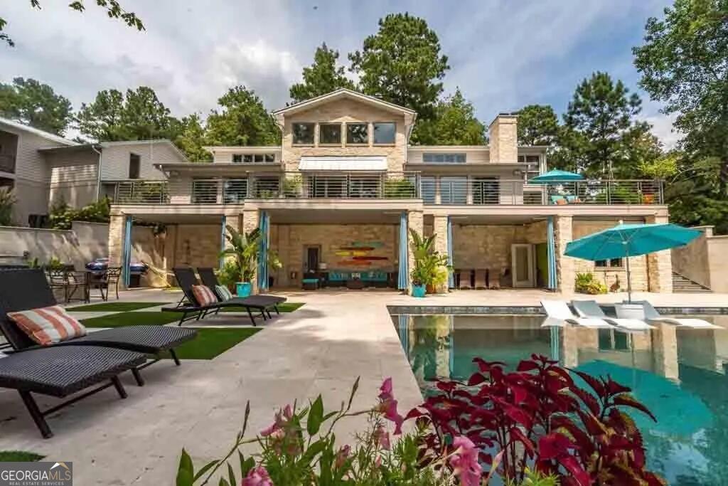 Pristine, 5 bedroom, 5 full baths and 2 half baths, showcase home featuring an infinity pool and sweeping open water views of Lake Harding. The living room spans the entire width of the home with amazing lake views. It has three separate areas for entertaining and includes a full wet bar with ice maker, refrigerator, custom cabinets with ebony granite. Chefs kitchen includes mirrored sill stone counters, huge island, top of the line Thermador appliances including separate full size frig, freezer and wine cooler, six burner gas stove with griddle, oven and steam oven. Oversized master suite has an upscale, resort like bathroom, free standing tub with amazing water views as well a screened in porch overlooking the lake which is great for relaxing. Four additional bedrooms and bathrooms all have custom cabinets and rainfall shower heads. These bathrooms feature a steam shower and sauna as well. Additional rooms over the 3 car garage is a living room, bedroom and bathroom with a balcony overlooking the lake. Partially covered pool deck includes an overlarge negative edge resort style infinity pool with a detached jacuzzi and covered bar area. Brand new rebuilt 2-story boat dock with composite decking and oversized wrap around wharf. Furniture negotiable!