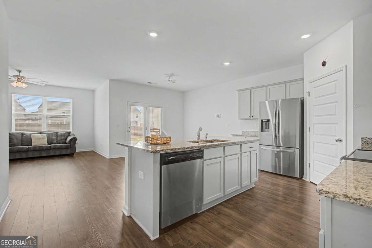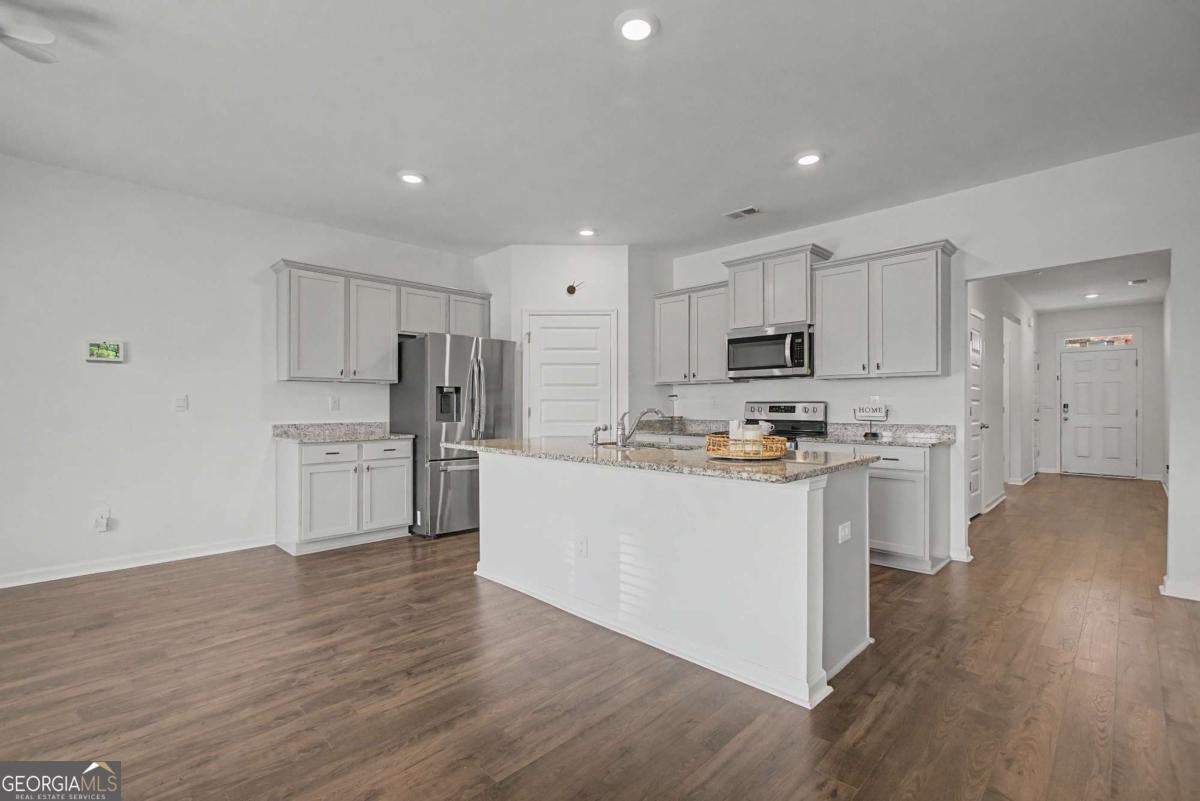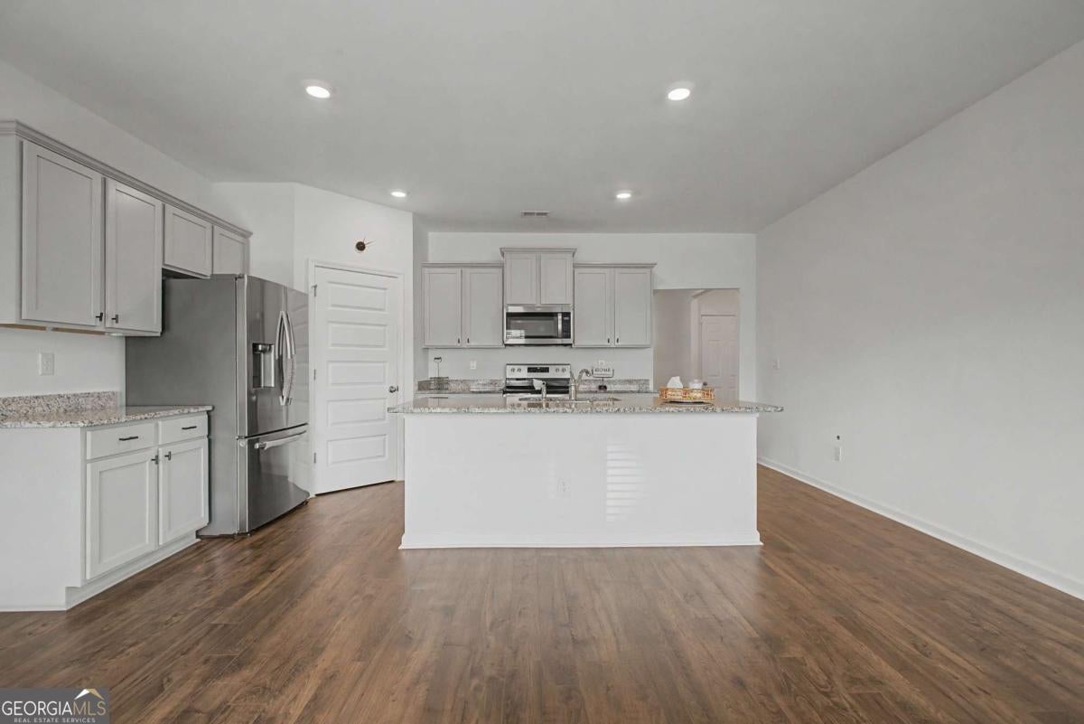 Welcome to this stunning ranch in the desirable Summerwind community, zoned for top-rated Dacula High School. This bright, open-concept home features gorgeous LVP flooring, abundant natural light, and a chef's kitchen with stainless steel appliances, a large island, and granite countertops flowing into the dining and family areas-ideal for entertaining or everyday living. The private owner's suite includes a spa-inspired bath with dual vanities, a soaking tub, and a walk-in shower. Two secondary bedrooms at the front of the home share a full bath with double vanities, and an additional versatile room is perfect for guests or a home office. Enjoy easy one-floor living with no steps, a level driveway and yard, and a covered backyard patio for outdoor relaxation and entertaining. Community amenities include a junior Olympic-sized pool, pickleball courts, a cabana/pool house, and a playground. Convenient to shopping and dining (5-10 minutes) with quick access to Hwy 316, Sugarloaf Parkway, and I85.