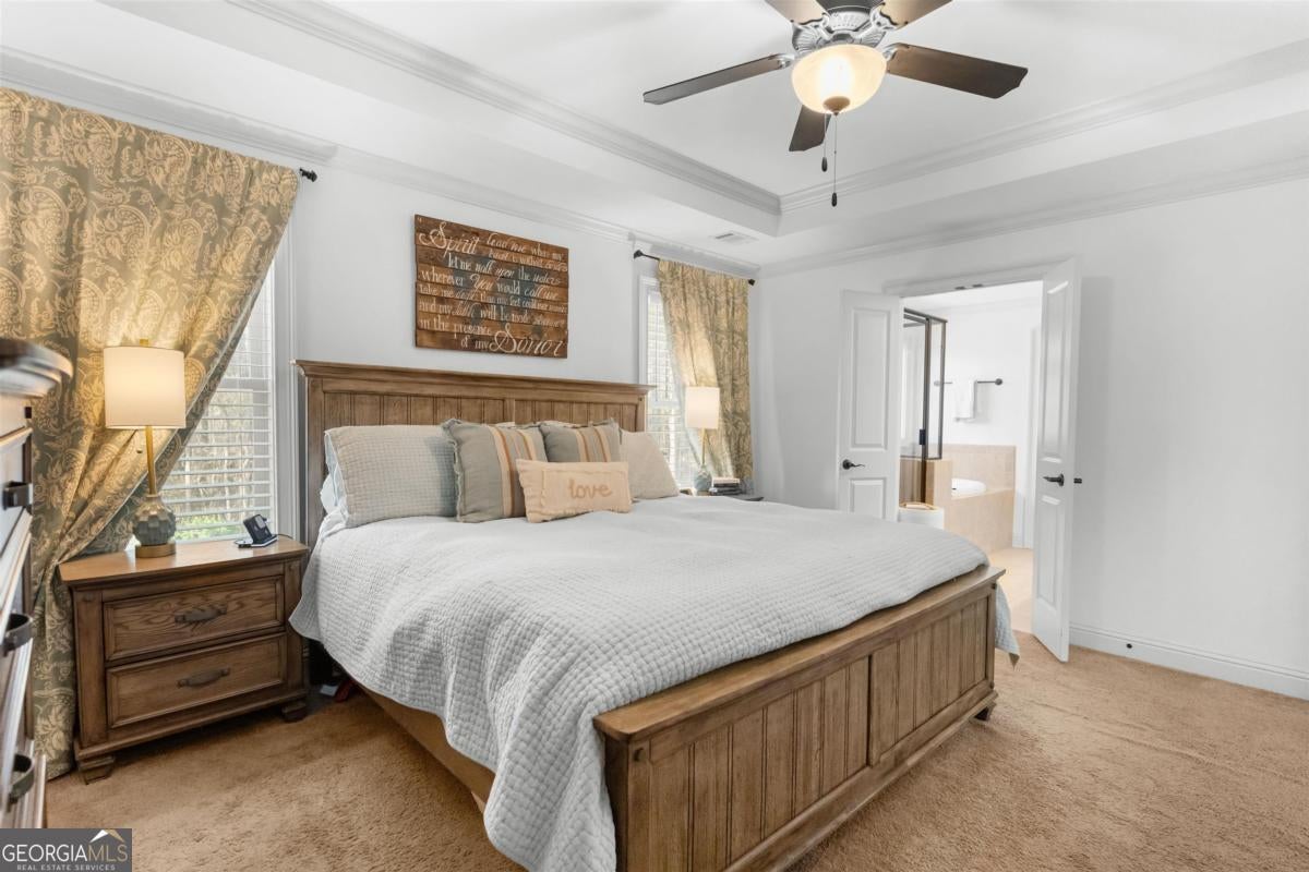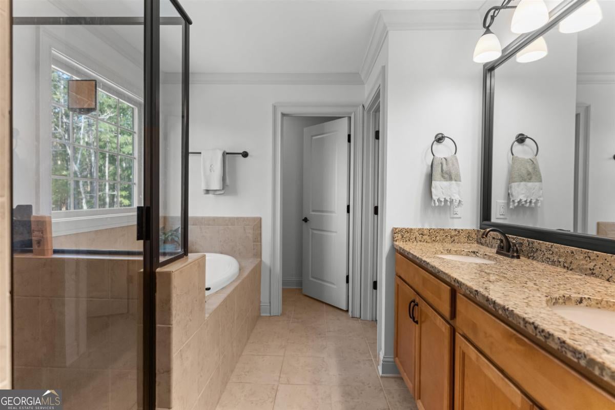 - Interior FeaturesDouble Vanity, Pulldown Attic Stairs, Separate Shower, Soaking Tub, Tray Ceiling(s), Walk-In Closet(s)