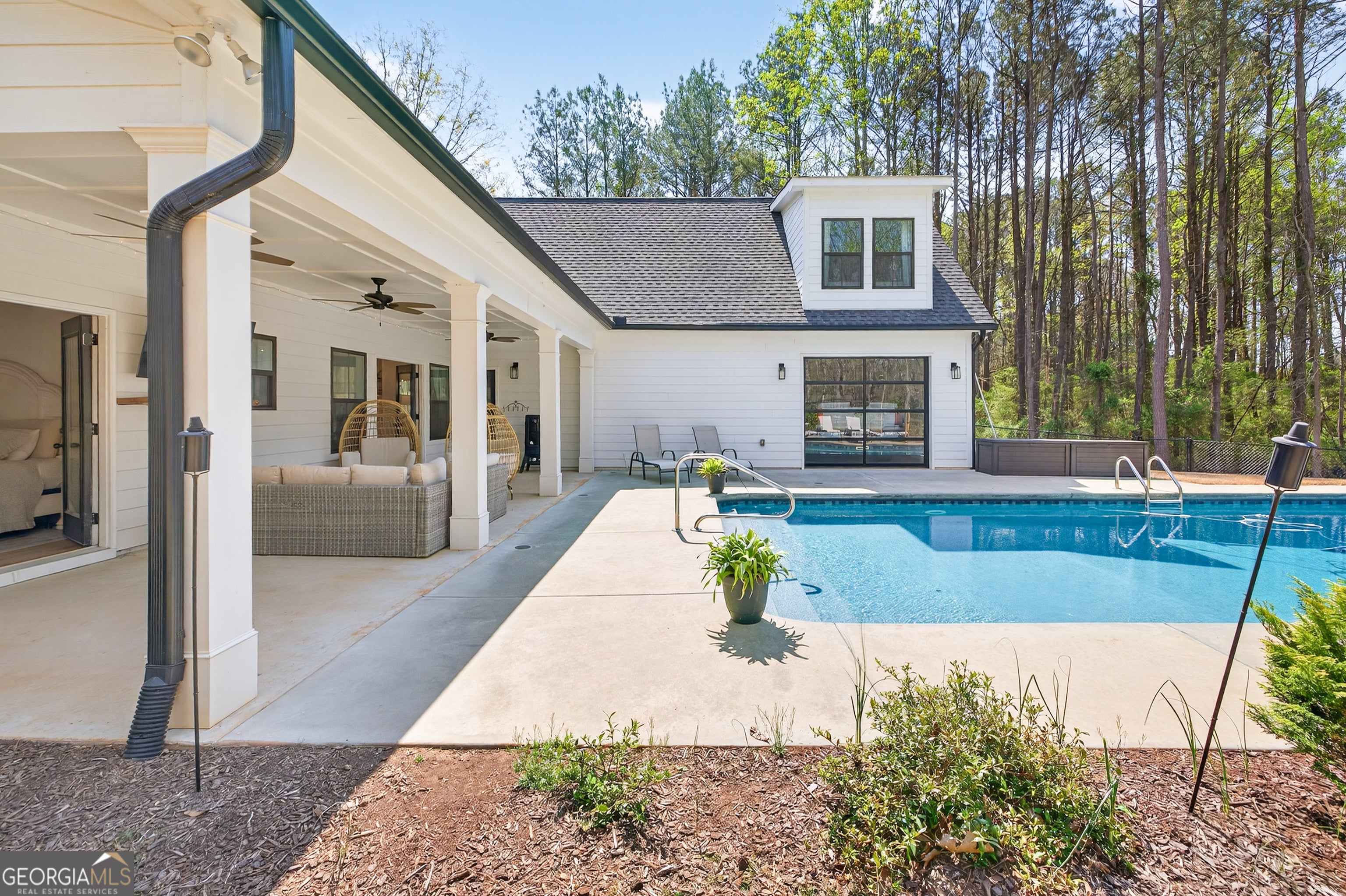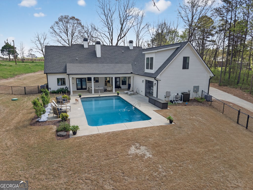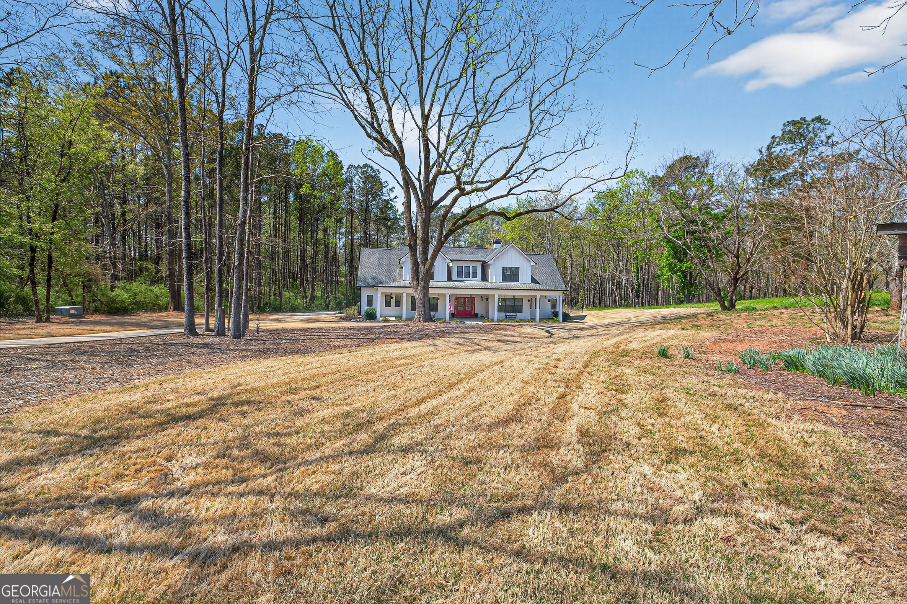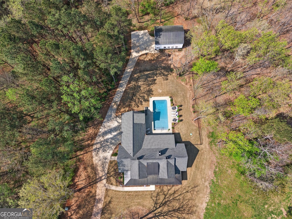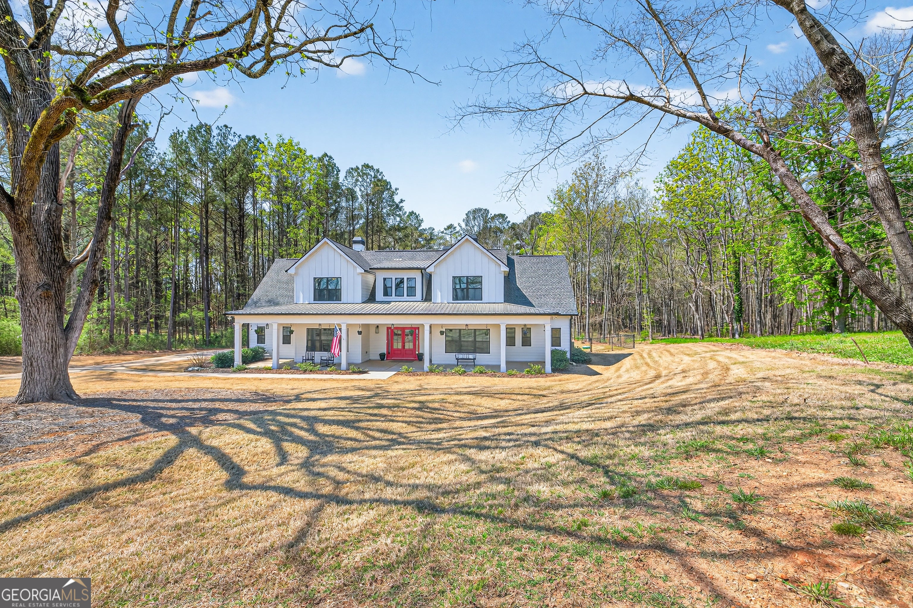 Finding a private estate that balances high-end architectural design with the expansive freedom of a rural landscape in Monroe, Georgia, often forces a choice between modern luxury and homestead versatility. This property serves as the definitive solution, situated on two scenic acres of partially wooded, level land that offers a rare, non-HOA environment. Tucked away on a quiet street at 4746 Bentley Road, this masterpiece of modern design is located just ten minutes from the boutique shopping and family-owned dining of Bethlehem and the local stores of downtown Monroe. This residence provides immediate access to area landmarks like George Walton Academy and Monroe Area High School. The home's interior is a masterclass in open-concept living, centered around a light-filled great room featuring a floor-to-ceiling brick fireplace with a reclaimed timber mantel and custom shiplap accents. The great room opens to a chef's kitchen, perfect for hosting gatherings of any size, and showcases white shaker cabinetry, champagne gold hardware, and a professional-grade island with a dark, textured countertop. The main level is thoughtfully designed for longevity and flow, featuring a dedicated home office, a mudroom, and a primary suite that serves as a true sanctuary. This primary suite features direct access to the outdoor living area and a spa-like bathroom with a soaking tub and walk-in shower. Outdoor amenities define the exterior experience, featuring an in-ground saltwater pool surrounded by generous front and rear porches that create a premier environment for entertaining. An oversized detached workshop and garage includes both power and water, offering an ideal space for automotive pursuits, RV storage, or DIY projects. This Royal Oaks Design floor plan maximizes natural light through black-framed French doors and features modern tray ceilings, a playroom, and a large upper-level loft. Whether enjoying the sunrises over the neighboring tree farm or exploring the balance of grassy openness and natural woods, this property offers the privacy you crave without sacrificing convenience.
