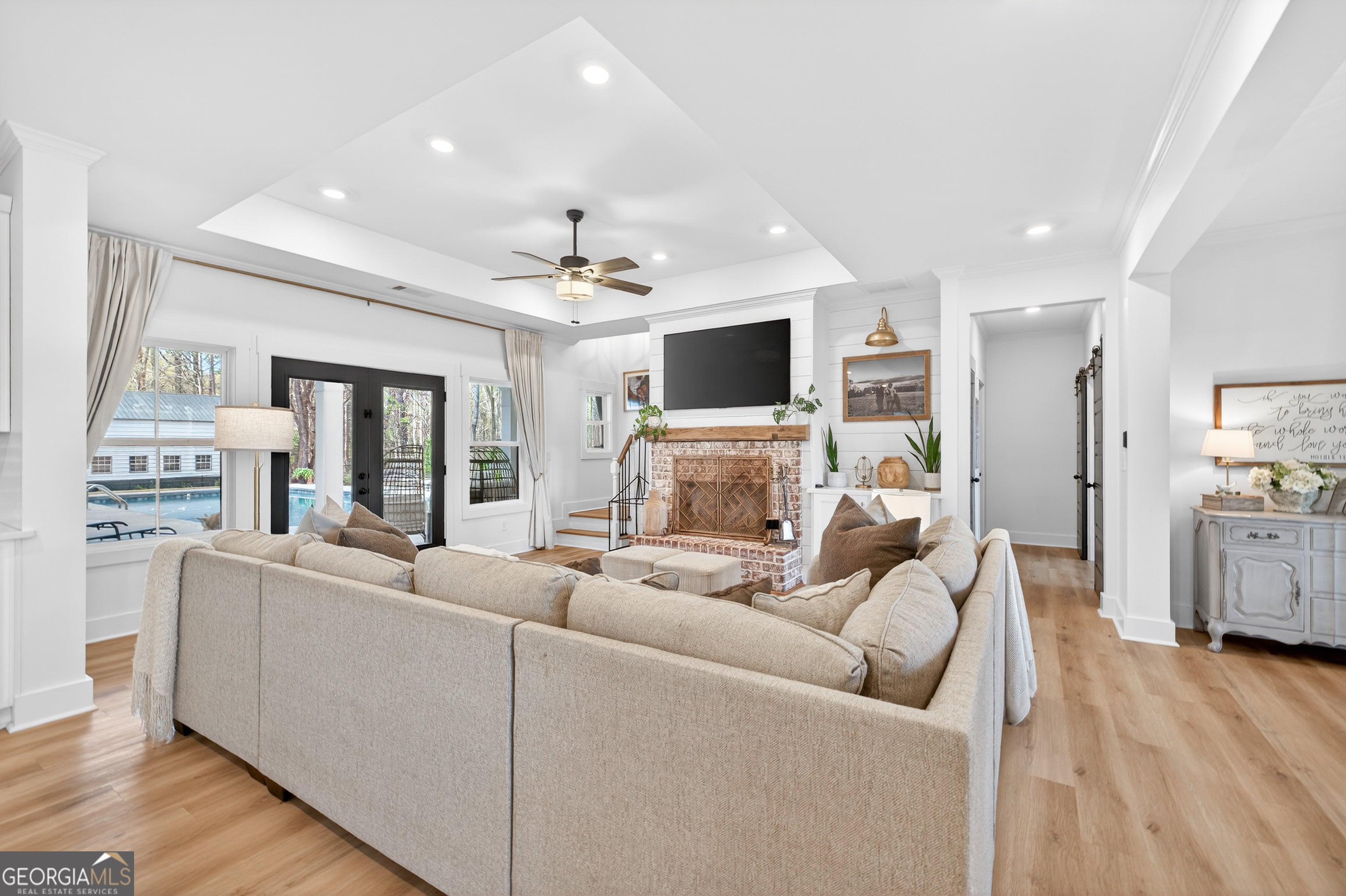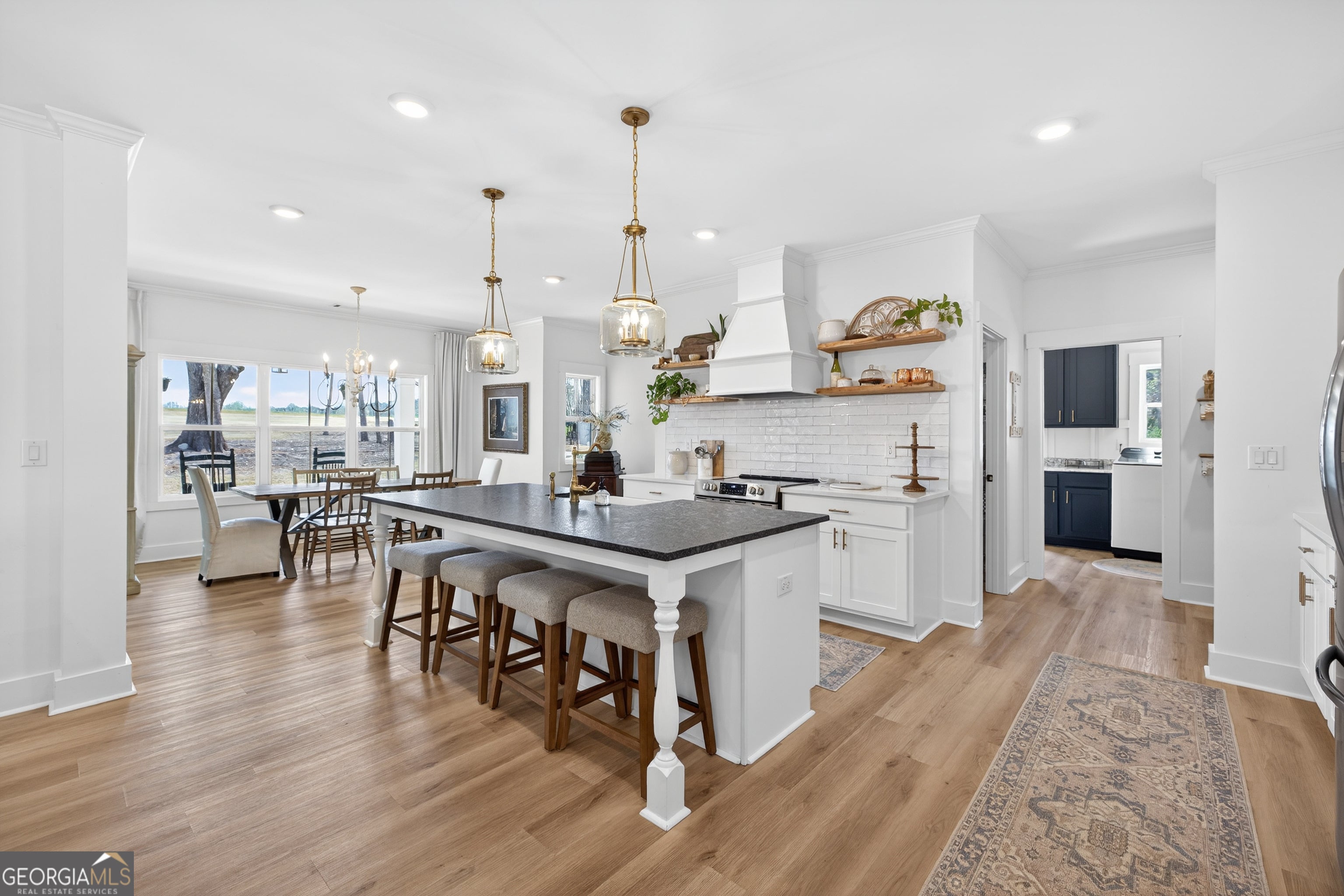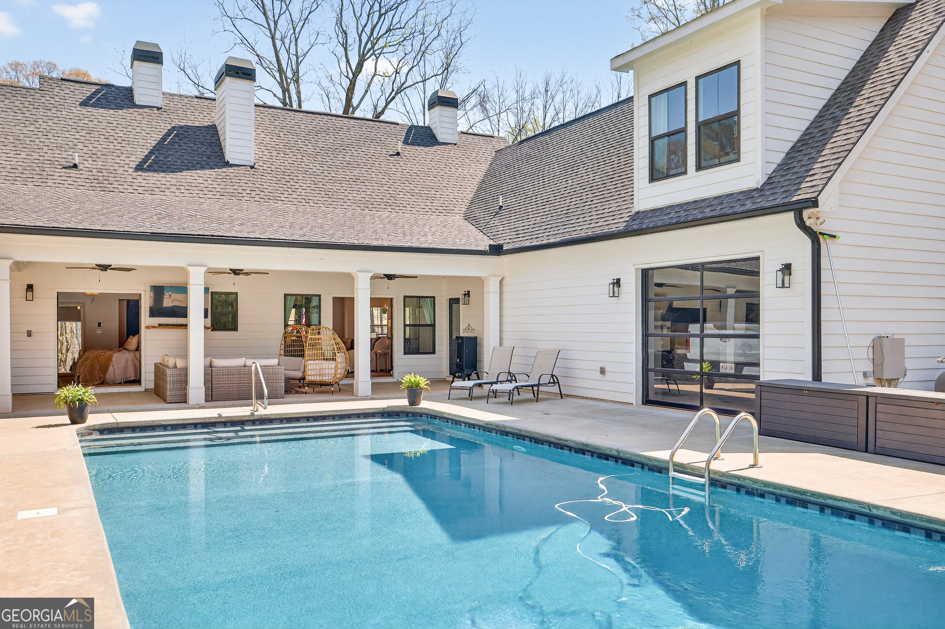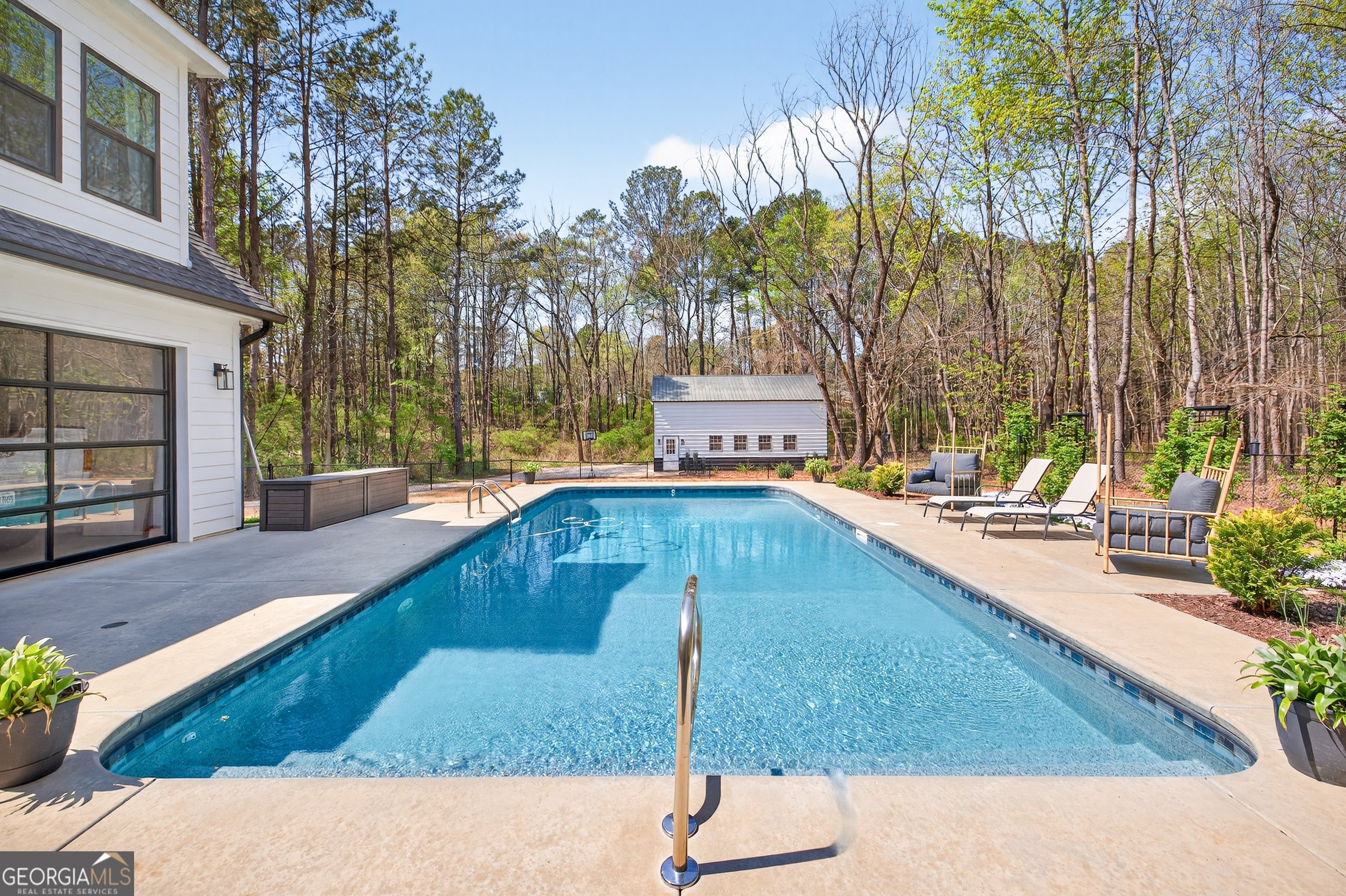 Finding a private estate that balances high-end architectural design with the expansive freedom of a rural landscape in Monroe, Georgia, often forces a choice between modern luxury and homestead versatility. This property serves as the definitive solution, situated on two scenic acres of partially wooded, level land that offers a rare, non-HOA environment. Tucked away on a quiet street at 4746 Bentley Road, this masterpiece of modern design is located just ten minutes from the boutique shopping and family-owned dining of Bethlehem and the local stores of downtown Monroe. This residence provides immediate access to area landmarks like George Walton Academy and Monroe Area High School. The home's interior is a masterclass in open-concept living, centered around a light-filled great room featuring a floor-to-ceiling brick fireplace with a reclaimed timber mantel and custom shiplap accents. The great room opens to a chef's kitchen, perfect for hosting gatherings of any size, and showcases white shaker cabinetry, champagne gold hardware, and a professional-grade island with a dark, textured countertop. The main level is thoughtfully designed for longevity and flow, featuring a dedicated home office, a mudroom, and a primary suite that serves as a true sanctuary. This primary suite features direct access to the outdoor living area and a spa-like bathroom with a soaking tub and walk-in shower. Outdoor amenities define the exterior experience, featuring an in-ground saltwater pool surrounded by generous front and rear porches that create a premier environment for entertaining. An oversized detached workshop and garage includes both power and water, offering an ideal space for automotive pursuits, RV storage, or DIY projects. This Royal Oaks Design floor plan maximizes natural light through black-framed French doors and features modern tray ceilings, a playroom, and a large upper-level loft. Whether enjoying the sunrises over the neighboring tree farm or exploring the balance of grassy openness and natural woods, this property offers the privacy you crave without sacrificing convenience.