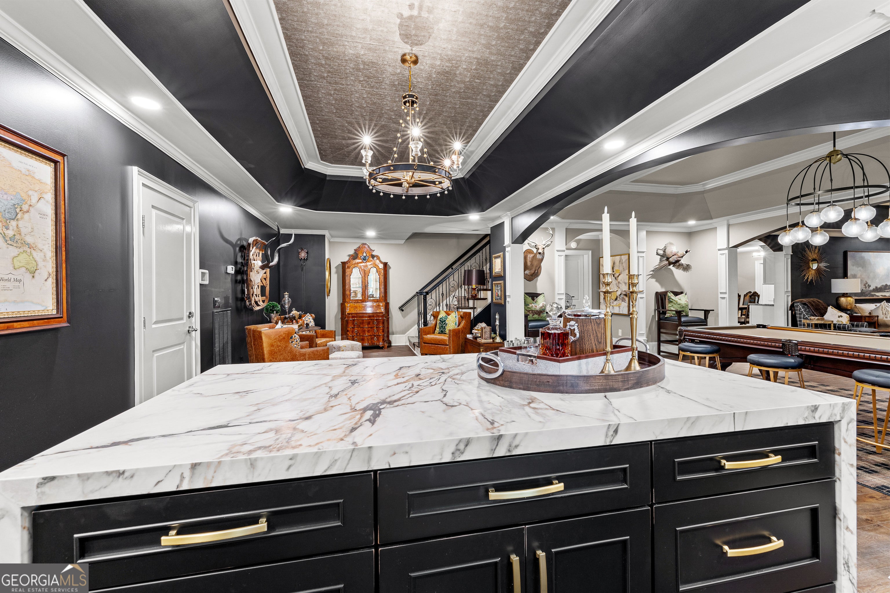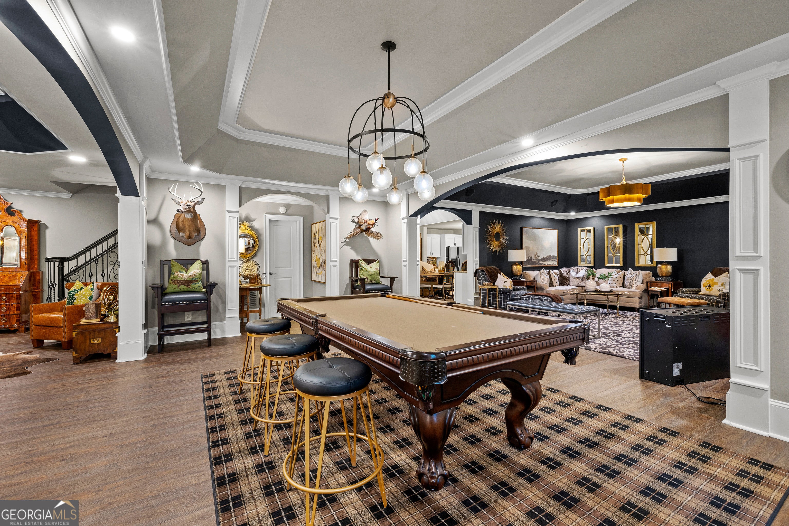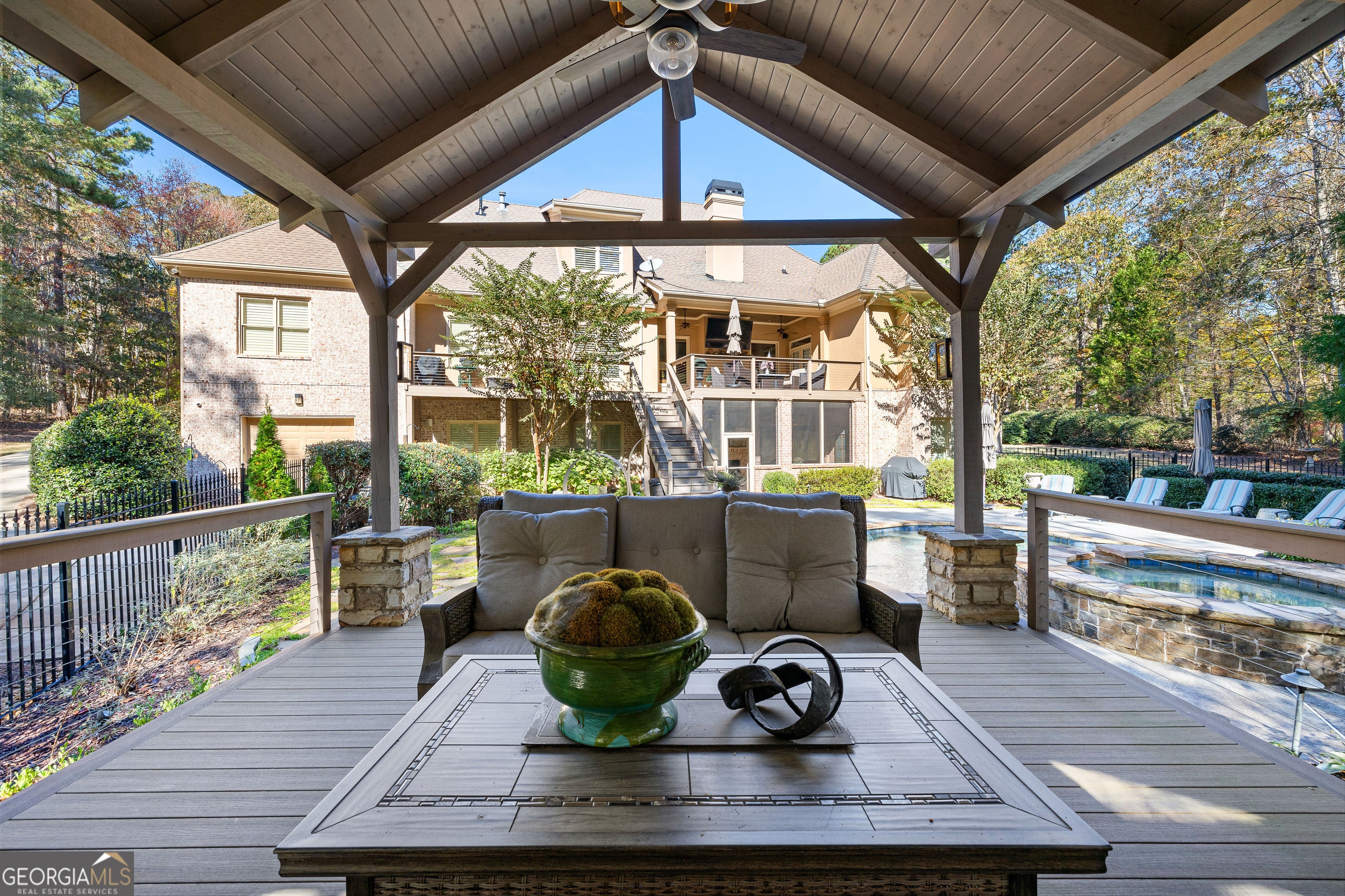 Welcome to an extraordinary 8,500 sq ft estate set on five private acres, where timeless elegance meets exceptional functionality. This seven bedroom, five full bath, three half bath residence was thoughtfully designed for both grand-scale entertaining and refined everyday living. Step through the impressive foyer showcasing custom inlaid stone flooring and immediately experience the craftsmanship throughout - from extensive custom moldings to expertly crafted coffered ceilings and european stone mantle in oversized living room. A large executive office and formal dining flank the formal foyer offering sophistication and versatility. The chefs kitchen is a true showpiece, featuring high- end finishes, stunning quartz countertops and double islands with waterfall edge. Expansive eat-in breakfast area and keeping room with stone fireplace and built in bookshelves. A stunning mini bar and tucked away half bath enhances this homes entertaining appeal. Oversized owners suite on main level offers a luxurious, private retreat with a spa inspired bath, whirlpool soaking tub, seperate shower, and massive custom walk in closet. Two additional bedrooms, jack and jill bath, laundry room and half bath complete the main floor. Upstairs, enjoy a fully equipped home cinema complete with tiered seating and AV system, large flex space ideal for kids hangout area, two additional bedrooms and two full baths. The terrace level lives as a completely seperate residence - ideal for multi- generational living or long term guests. Featuring a full secondary kitchen, custom built bar with waterfall quartz countertops and built in shelving, expansive living area, oversized bedroom with ensuite full bath, an additional half bath, private entrance, screened in porch, and it's own garage. Outdoors, the property transforms into a private retreat with fenced backyard, stunning gunite pool complete with waterfall spa hot tub, recently built outdoor entertaining area with soaring vaulted ceilings and fireplace and upgraded deck with lifetime composite decking. Designed for uninterrupted living, this home features a 22KW generator for complete peace of mind. Every detail has been thoughtfully curated. A rare, one-of-a-kind private estate defined by privacy, unparalleled luxury, versatility, and grand scale entertaining, with the added benefit of two homes under one roof!!