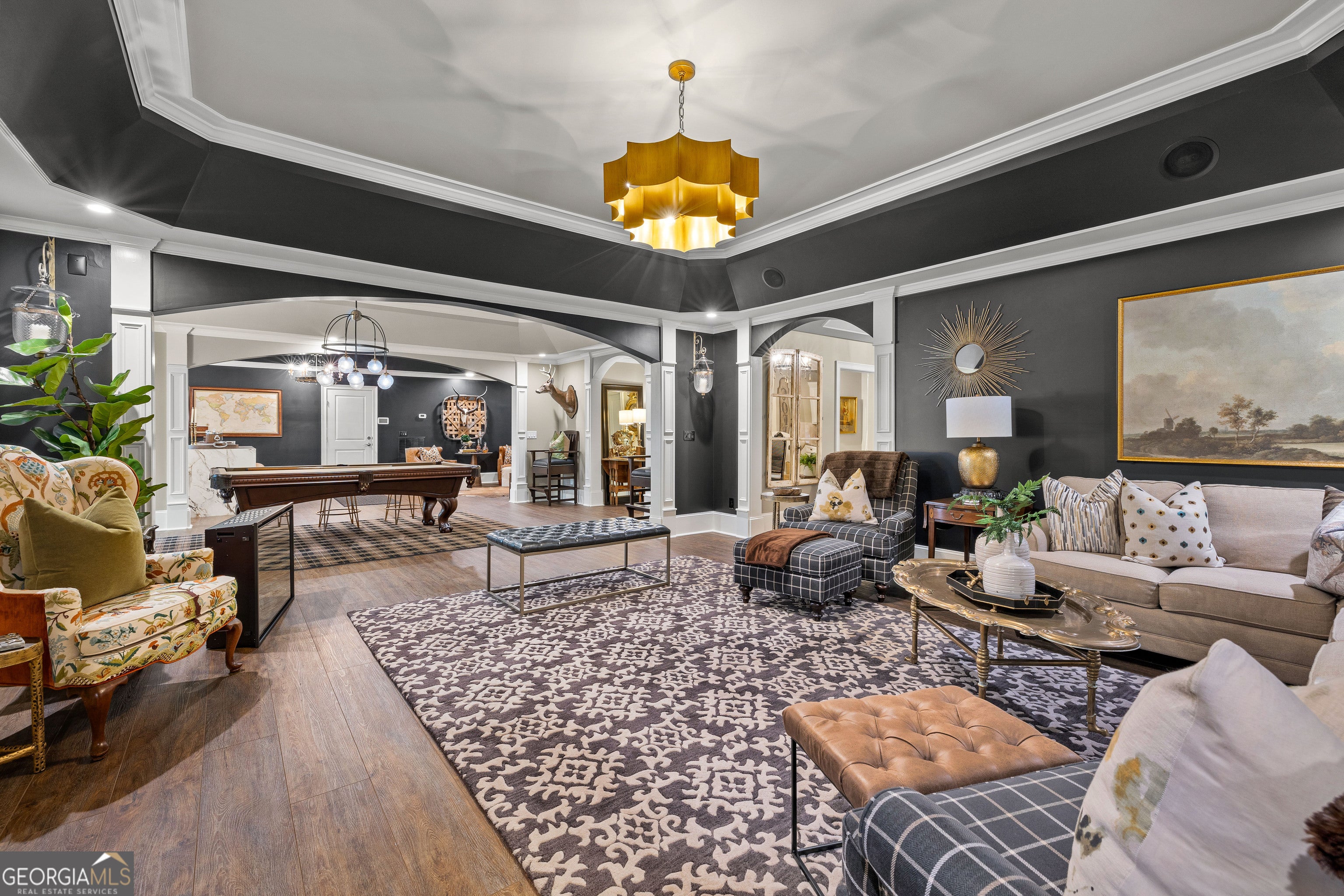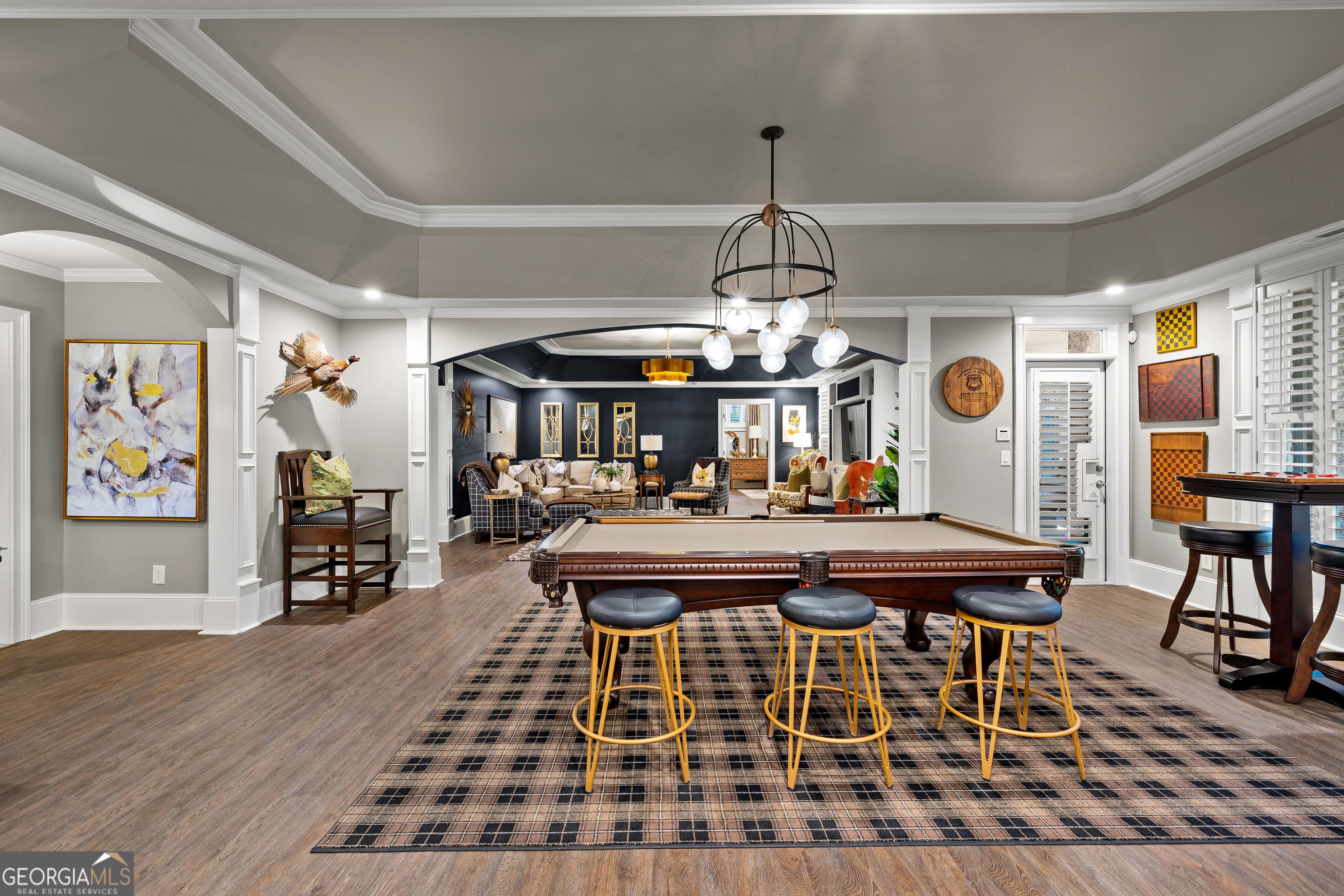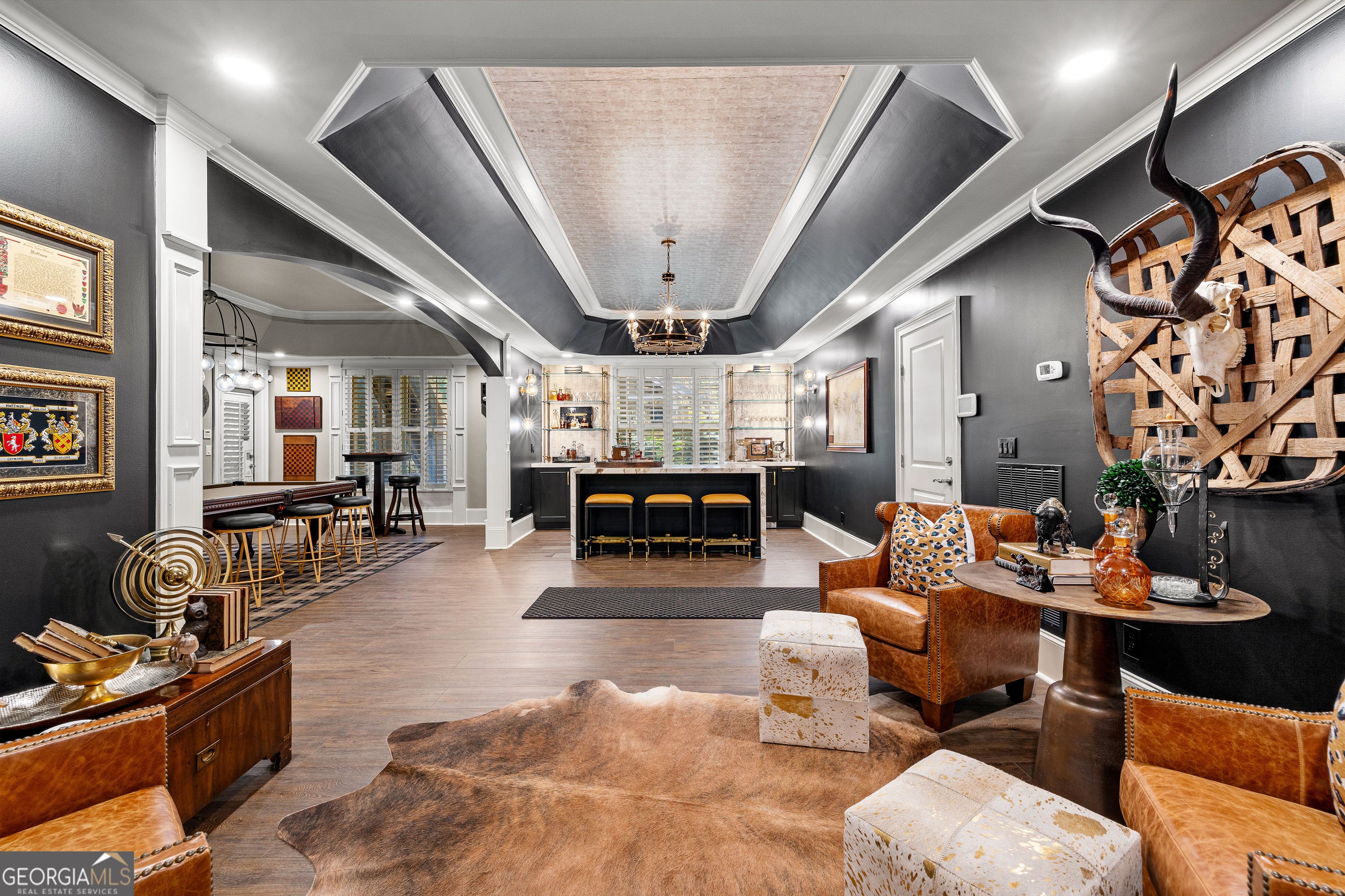 Welcome to an extraordinary 8,500 sq ft estate set on five private acres, where timeless elegance meets exceptional functionality. This seven bedroom, five full bath, three half bath residence was thoughtfully designed for both grand-scale entertaining and refined everyday living. Step through the impressive foyer showcasing custom inlaid stone flooring and immediately experience the craftsmanship throughout - from extensive custom moldings to expertly crafted coffered ceilings and european stone mantle in oversized living room. A large executive office and formal dining flank the formal foyer offering sophistication and versatility. The chefs kitchen is a true showpiece, featuring high- end finishes, stunning quartz countertops and double islands with waterfall edge. Expansive eat-in breakfast area and keeping room with stone fireplace and built in bookshelves. A stunning mini bar and tucked away half bath enhances this homes entertaining appeal. Oversized owners suite on main level offers a luxurious, private retreat with a spa inspired bath, whirlpool soaking tub, seperate shower, and massive custom walk in closet. Two additional bedrooms, jack and jill bath, laundry room and half bath complete the main floor. Upstairs, enjoy a fully equipped home cinema complete with tiered seating and AV system, large flex space ideal for kids hangout area, two additional bedrooms and two full baths. The terrace level lives as a completely seperate residence - ideal for multi- generational living or long term guests. Featuring a full secondary kitchen, custom built bar with waterfall quartz countertops and built in shelving, expansive living area, oversized bedroom with ensuite full bath, an additional half bath, private entrance, screened in porch, and it's own garage. Outdoors, the property transforms into a private retreat with fenced backyard, stunning gunite pool complete with waterfall spa hot tub, recently built outdoor entertaining area with soaring vaulted ceilings and fireplace and upgraded deck with lifetime composite decking. Designed for uninterrupted living, this home features a 22KW generator for complete peace of mind. Every detail has been thoughtfully curated. A rare, one-of-a-kind private estate defined by privacy, unparalleled luxury, versatility, and grand scale entertaining, with the added benefit of two homes under one roof!!