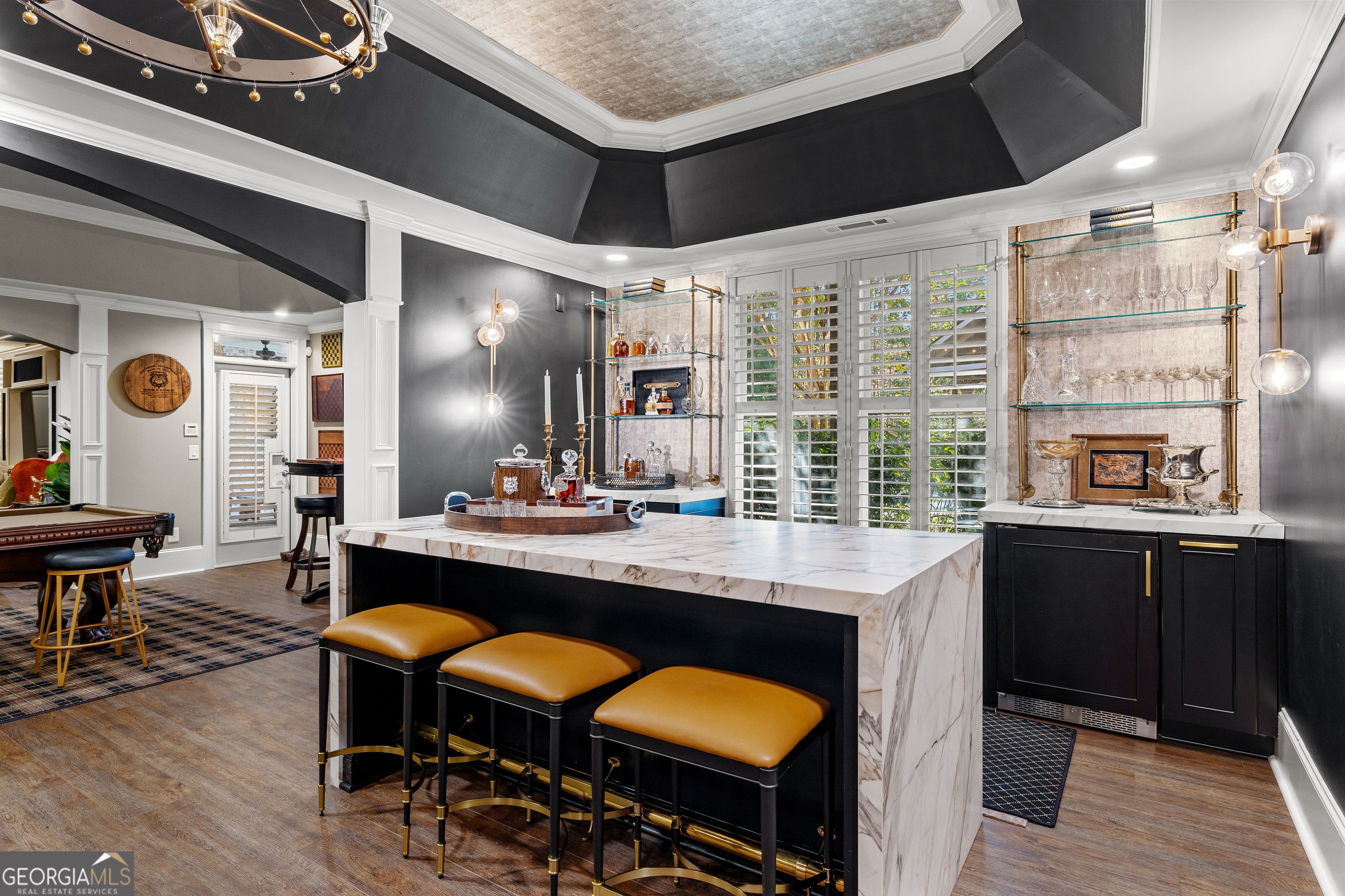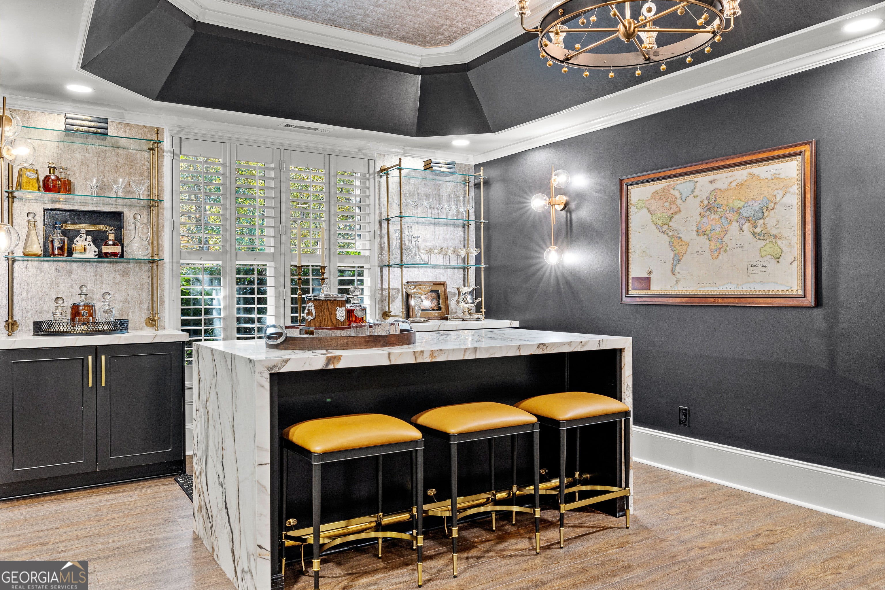 - Interior FeaturesBookcases, Double Vanity, Master On Main Level, Rear Stairs, Walk-In Closet(s), Wet Bar