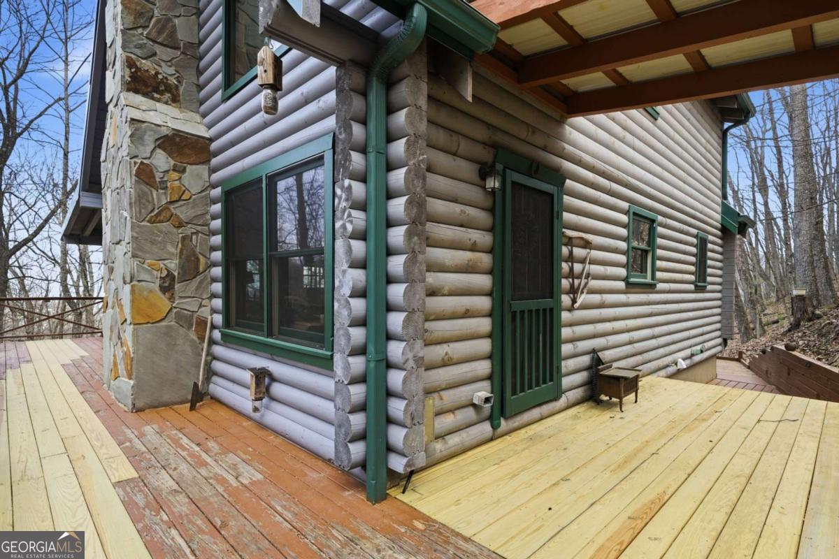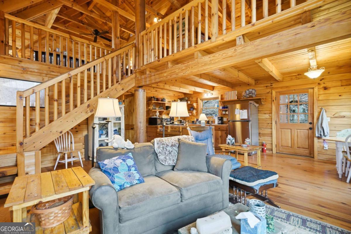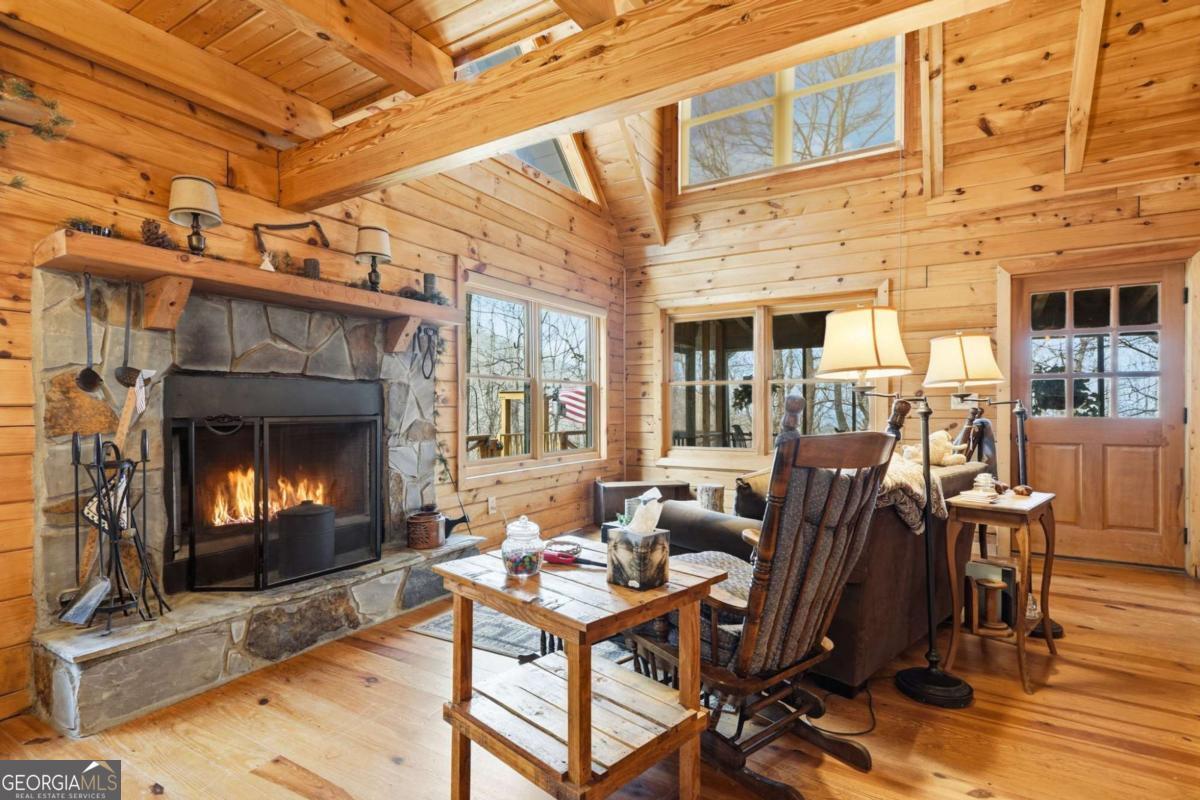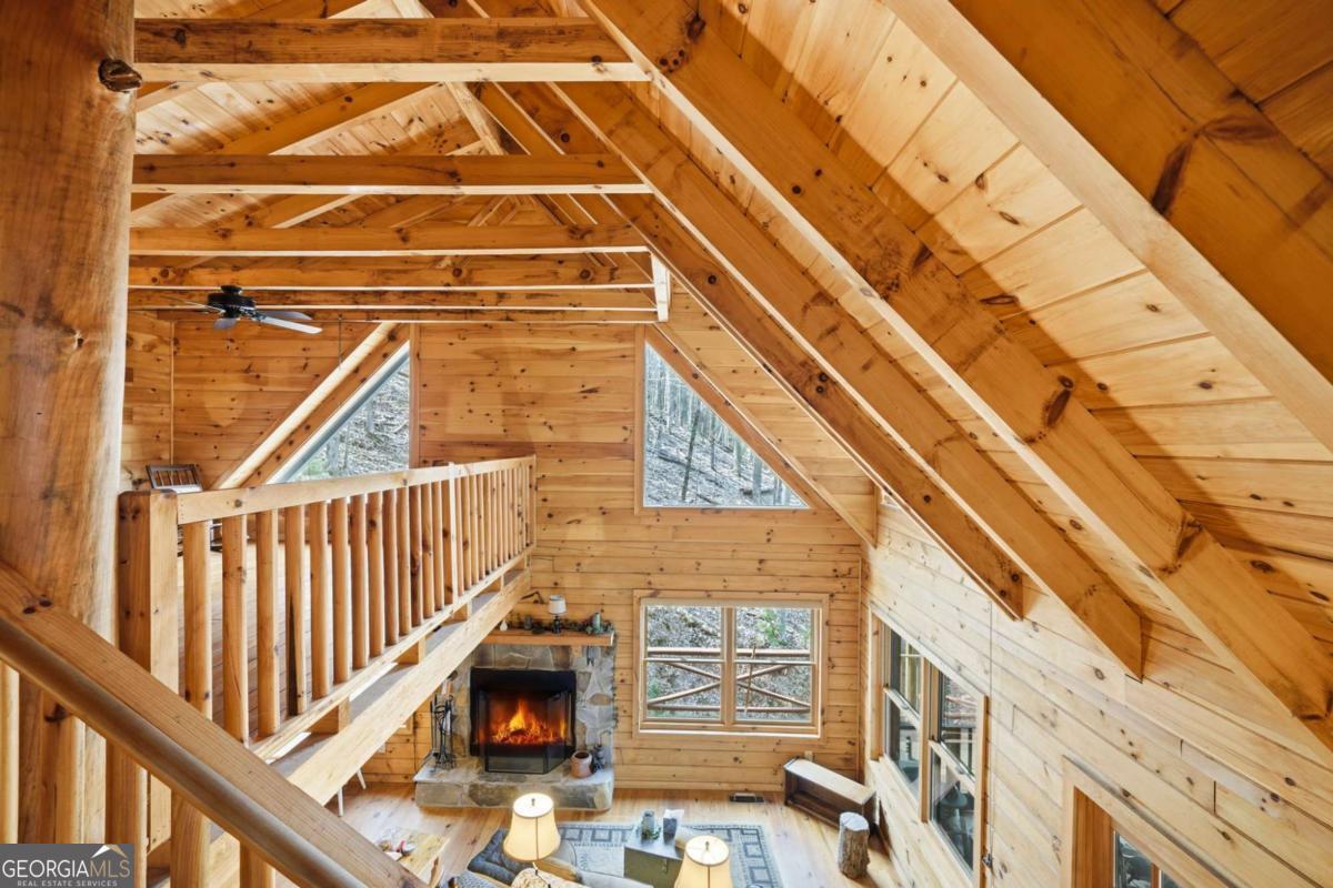 First time on the market since being lovingly built by the original owners, this authentic log cabin retreat is nestled in the mountains of Ellijay and located within the highly sought-after Walnut Mountain community-offering the perfect blend of rustic charm, privacy, and mountain lifestyle. Situated on a double lot surrounded by trees, this home is tucked into a peaceful setting and features expansive wraparound decking and multiple outdoor living spaces-ideal for morning coffee, evening gatherings, or simply enjoying the quiet beauty of North Georgia. A professional installed lift is located from the parking area to the deck to allow for easy access! Inside, you'll find a warm and inviting interior with vaulted ceilings, exposed beams, and a stone fireplace that anchors the main living space. The open-concept layout flows seamlessly into the kitchen and dining area, creating the perfect space for entertaining or relaxing after a day in the mountains. The flexible floor plan allows for primary living on either the main or upper level, with a bedroom and bath on the main floor and a private upper-level bedroom with its own bath. The loft bedroom overlooking the living room adds character and additional space for guests or a cozy retreat. Located within the gated Walnut Mountain community, residents enjoy a true mountain lifestyle with access to multiple private lakes, hiking trails, waterfalls, an Olympic-size pool, tennis courts, clubhouse, parks, and access to Turniptown Creek-creating the perfect blend of nature, recreation, and community that provides a true mountain lifestyle while still being convenient to downtown Ellijay's wineries, dining, and outdoor adventures. This is the kind of cabin buyers are actively searching for-true wood interior, mountain setting, outdoor living, and privacy-all in one of Ellijay's most desirable communities. Whether you're looking for a full-time residence, second home, or investment opportunity, this property checks all the boxes.
