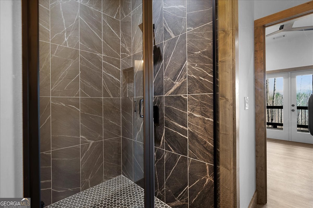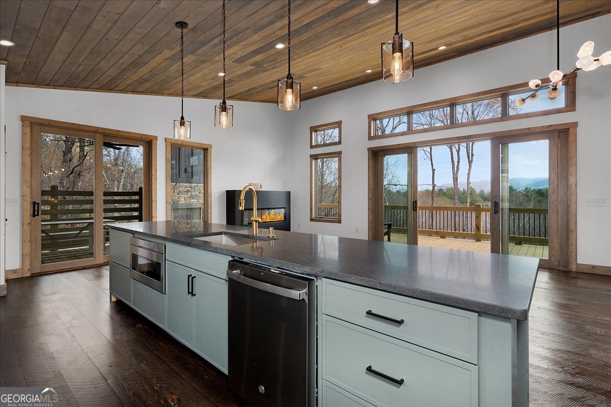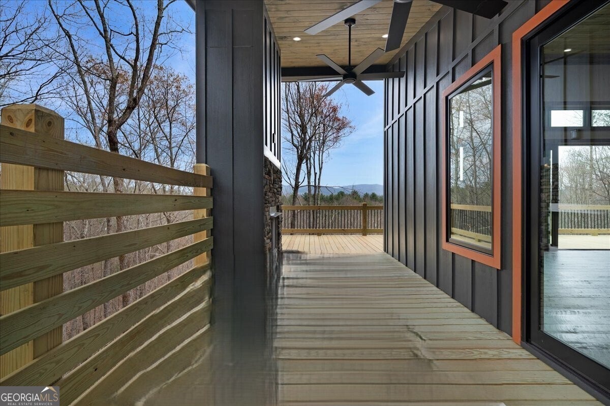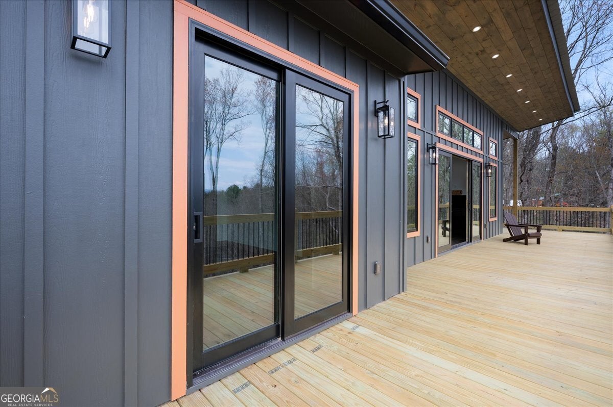 Entering the front door you immediately have a 180 degree breathtaking view of the Rich Mountain chain in North Georgia with some of the highest peaks in Georgia at over 4000 feet in elevation. Facing east, you have unbelievable sunrises in the morning shade on the large expansive deck in the afternoons and evenings. There's a covered porch off the kitchen, sporting a gas log fireplace and privacy while still hosting enhanced views the of the mountains. The interior of the home has large open spaces with vaulted ceilings with exposed wood appointments of the ceiling and walls with native white pine paneling from the local sawmills in the area. The floors upstairs are also rough- sawn yellow pine, including the stairs leading to the basement. On the main floor, a very open great room where the dining, living and kitchen combine for panoramic views of the Rich Mountain chain. A wall of floor to ceiling, doors and windows, reaching nearly 14 feet in height feature converging 8 feettall by 12 feet wide, sliding wood doors opening to the deck. Primary bedroom with en suite bath and double vanities are on main level. Downstairs a spacious gathering area with convenient mini kitchen and outside exits to the covered patio and walkway to a cozy fire pit. Two additional bedrooms are located downstairs each with en suite baths. The exterior is composite, James Hardty, cement vertical siding with board and batten, trim and appointments. Maintenance free and long lasting. No trouble of carpenter bees on this stuff. The landscaping is complete with plenty of natural ground coverings to add to the rustic charm of the property. Property has 2.16 acres of land and the bottom of the property there's a natural spring. This home is cozy and stylish without being pretentious. Located only about 3 miles from the downtown Ellijay Square, filled with restaurants and shops. An easy drive down Flat Branch Road from the property is the Ellijay mushroom farm and Roo Mountain Vineyards. Your perfect mountain getaway!