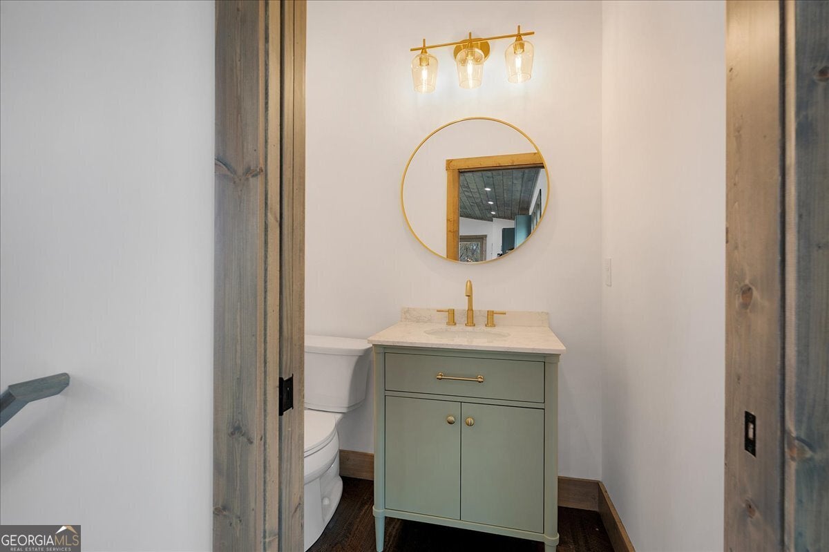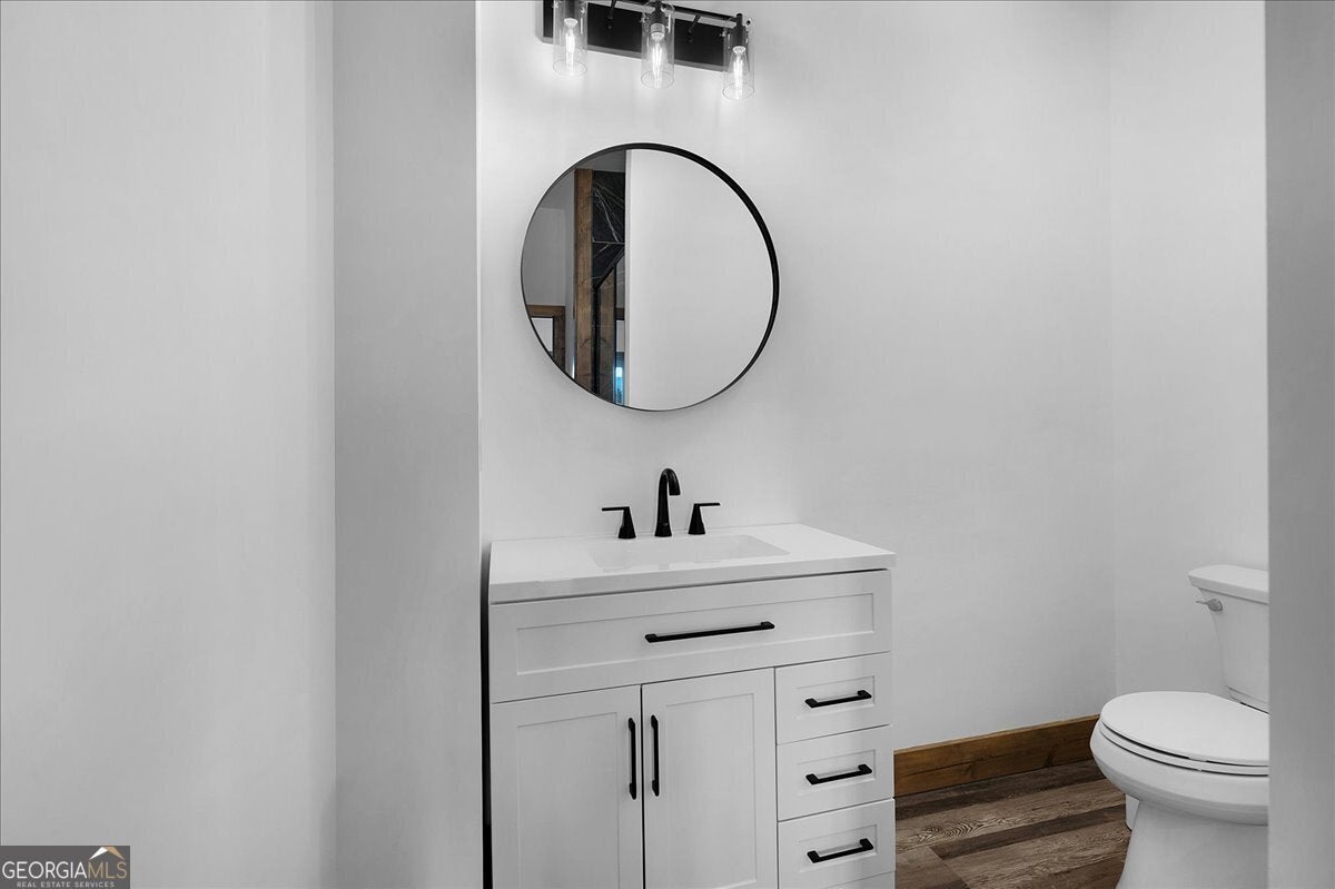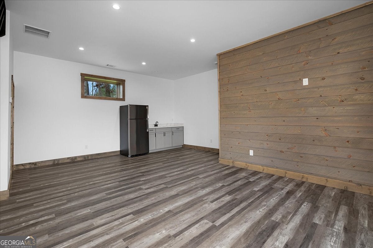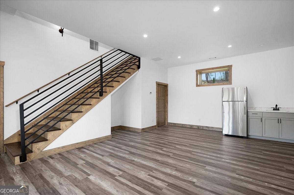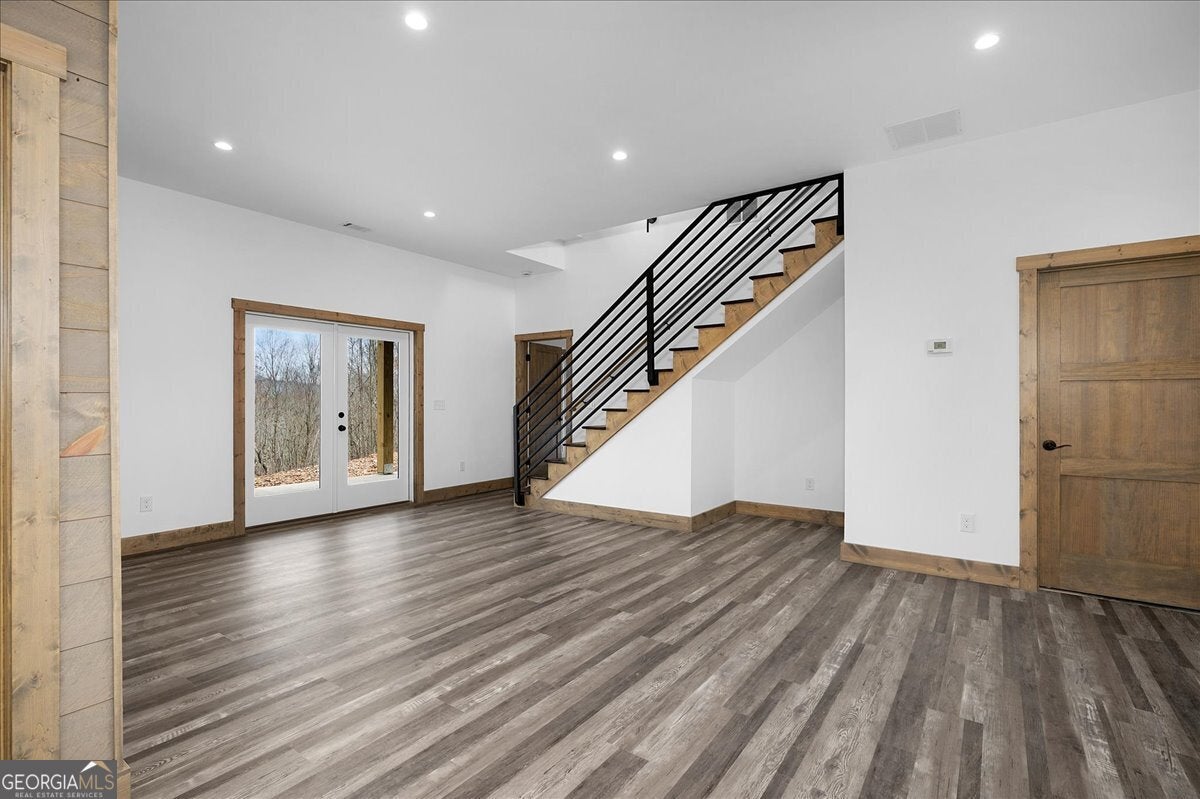 Entering the front door you immediately have a 180 degree breathtaking view of the Rich Mountain chain in North Georgia with some of the highest peaks in Georgia at over 4000 feet in elevation. Facing east, you have unbelievable sunrises in the morning shade on the large expansive deck in the afternoons and evenings. There's a covered porch off the kitchen, sporting a gas log fireplace and privacy while still hosting enhanced views the of the mountains. The interior of the home has large open spaces with vaulted ceilings with exposed wood appointments of the ceiling and walls with native white pine paneling from the local sawmills in the area. The floors upstairs are also rough- sawn yellow pine, including the stairs leading to the basement. On the main floor, a very open great room where the dining, living and kitchen combine for panoramic views of the Rich Mountain chain. A wall of floor to ceiling, doors and windows, reaching nearly 14 feet in height feature converging 8 feettall by 12 feet wide, sliding wood doors opening to the deck. Primary bedroom with en suite bath and double vanities are on main level. Downstairs a spacious gathering area with convenient mini kitchen and outside exits to the covered patio and walkway to a cozy fire pit. Two additional bedrooms are located downstairs each with en suite baths. The exterior is composite, James Hardty, cement vertical siding with board and batten, trim and appointments. Maintenance free and long lasting. No trouble of carpenter bees on this stuff. The landscaping is complete with plenty of natural ground coverings to add to the rustic charm of the property. Property has 2.16 acres of land and the bottom of the property there's a natural spring. This home is cozy and stylish without being pretentious. Located only about 3 miles from the downtown Ellijay Square, filled with restaurants and shops. An easy drive down Flat Branch Road from the property is the Ellijay mushroom farm and Roo Mountain Vineyards. Your perfect mountain getaway!