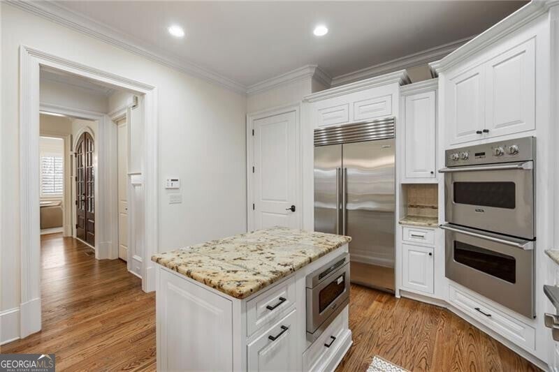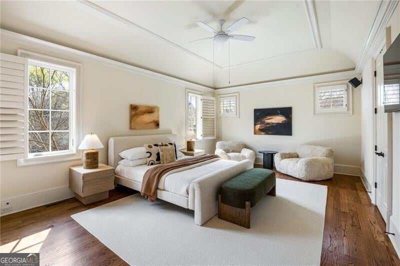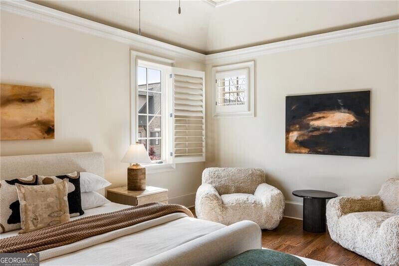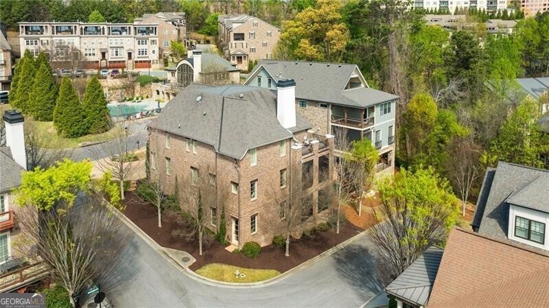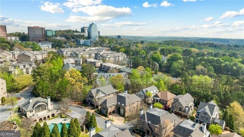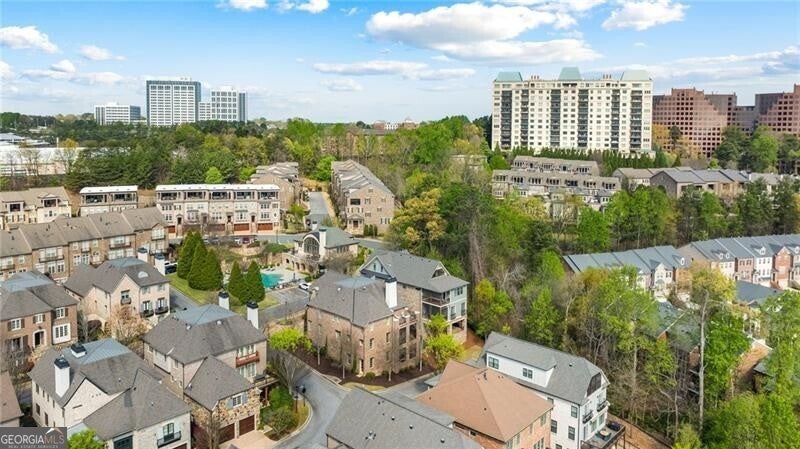 One of the original five homes built in gated Paces View, this single-family residence offers the privacy of a detached home with the convenience of community amenities in the heart of Vinings. The main level features 10-foot ceilings, hardwood floors, and an open layout with views from the kitchen to the fireside living room. Viking appliances, breakfast bar, and a large separate dining room make it ideal for everyday living and entertaining. Rarely found, the home offers two primary suites, one on the main level and one upstairs, along with 3 additional spacious en-suite secondary bedrooms and a second upstairs laundry. Enjoy three private terraces, two outfitted with $25K automatic screens, plus skyline views of downtown Atlanta from the upper level. Additional highlights include a two-car garage on the main level and a large unfinished basement ready for customization. Community amenities include gated entry, pool, fitness center, and clubhouse all minutes from Vinings Jubilee.