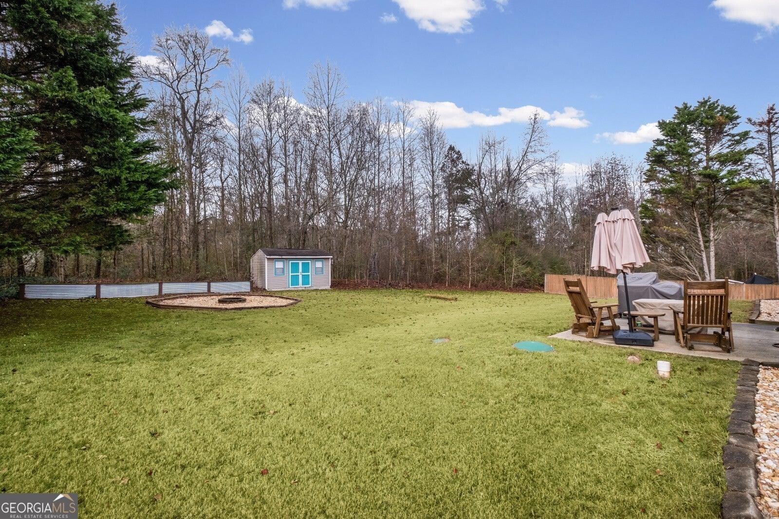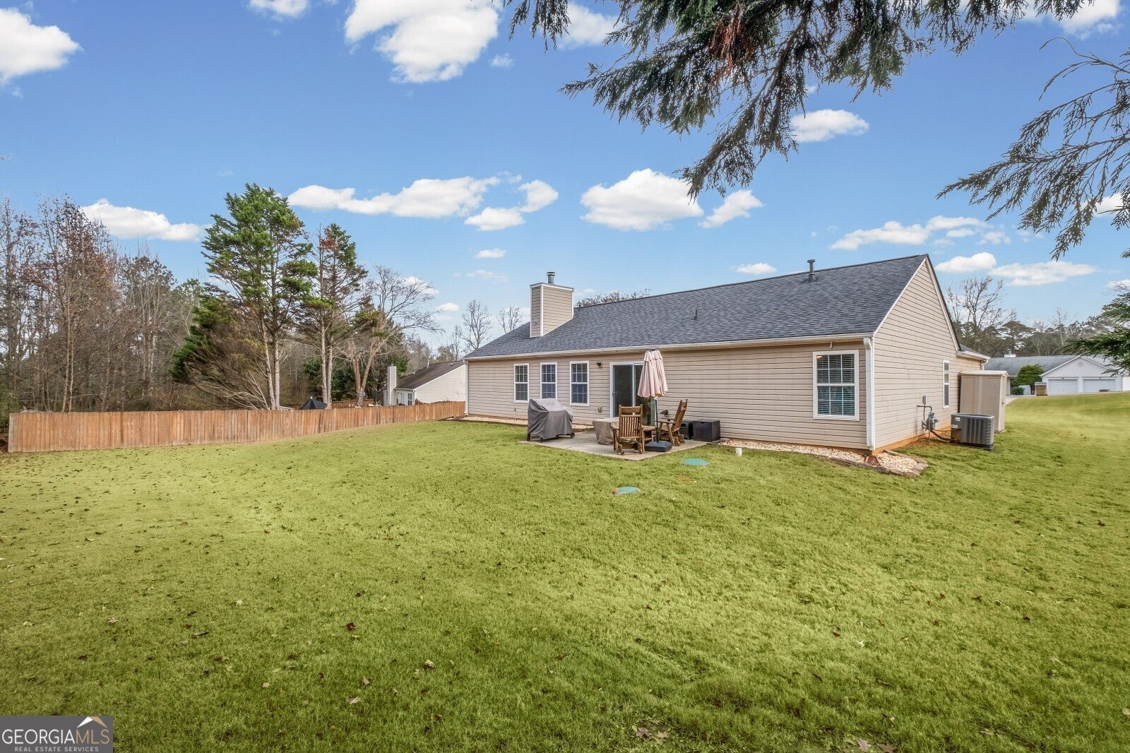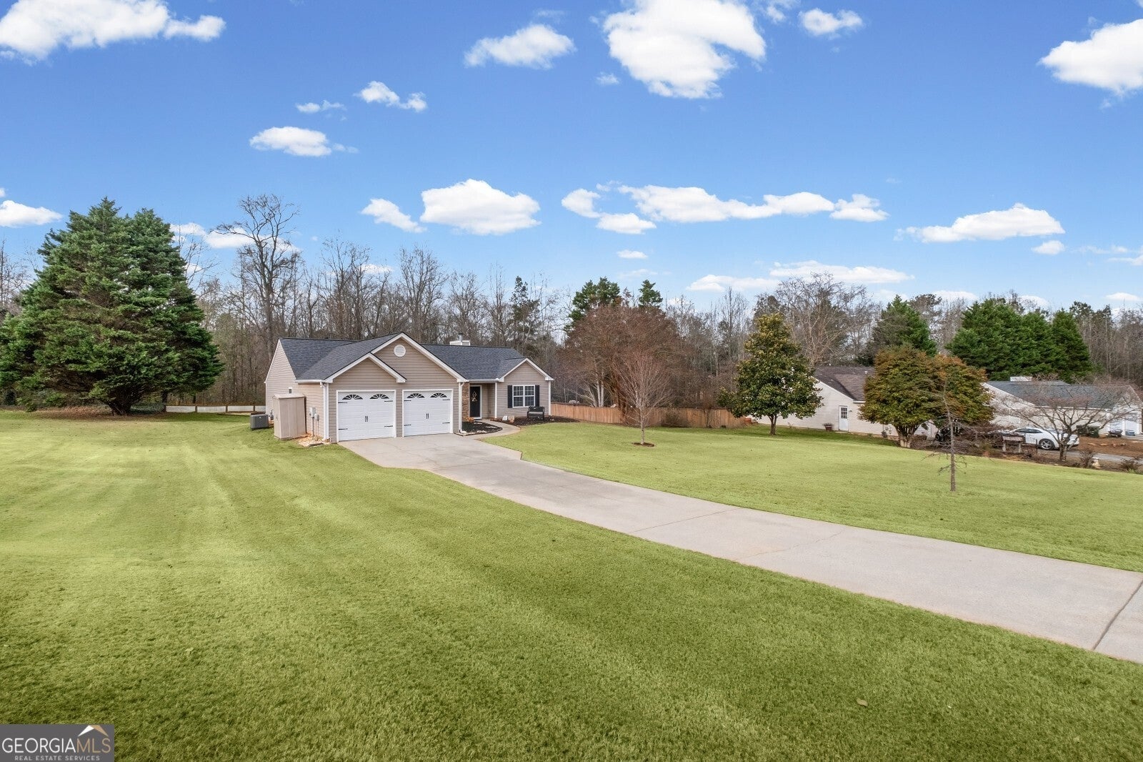 Welcome home to a well-kept, step-less ranch in a highly rated school district with parks, a new Publix shopping center, and quick access to GA-400 just minutes away. The sellers recently refreshed the interior with new paint, cleaned flooring throughout, and simple, low-maintenance finishes. Major updates include a 2023 HVAC system and exterior cleaning with a 2024 new roof, two installed brand new garage doors and openers. The layout is easy to live in, with the primary bedroom set apart from the other two bedrooms for extra privacy. The primary suite includes its own full bath and a spacious walk-in closet. The laundry room sits right off the interior hall and connects directly to the two-car garage, which includes electric openers and a small work area. The .71-acre lot is level from front to back, giving you a wide front yard and a quiet, wooded backdrop behind the home. The backyard is set up for both relaxation and projects with a fire-pit area, storage shed, and plenty of room for gardening or even adding a pool. The back patio offers a comfortable spot for grilling or enjoying the evening outdoors.
