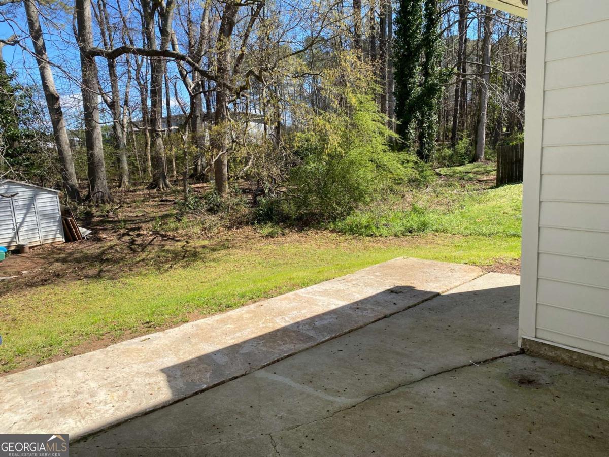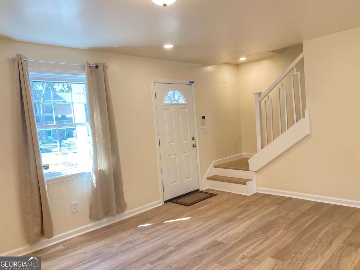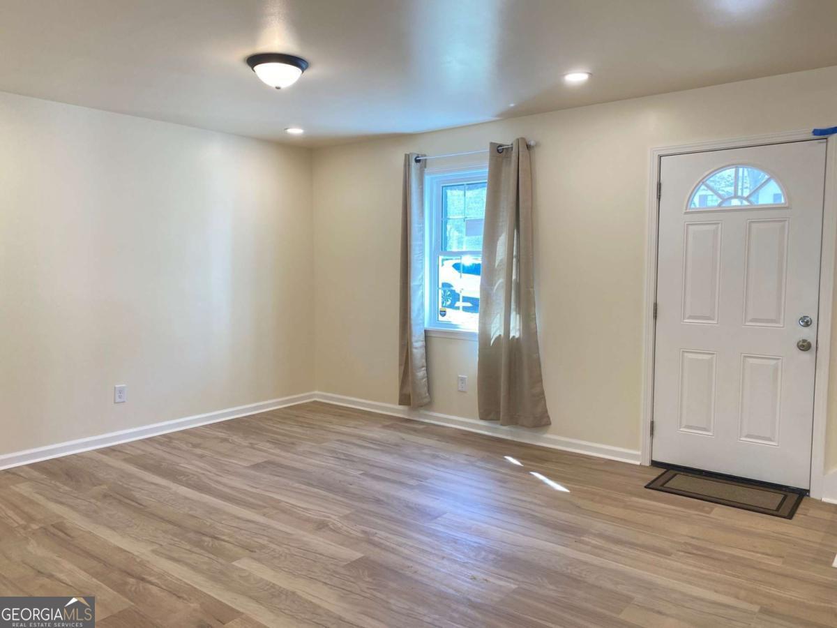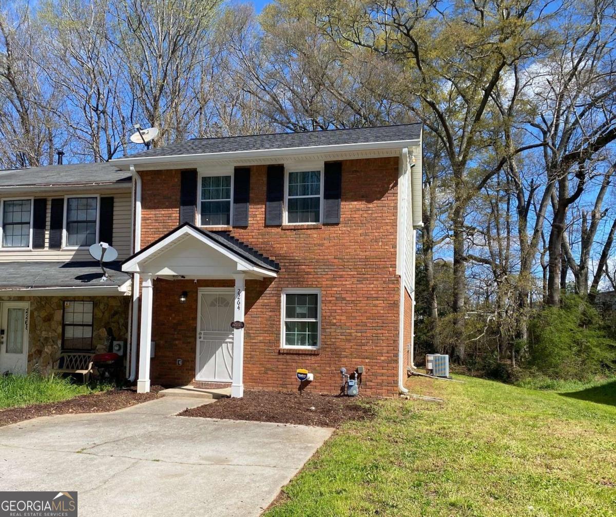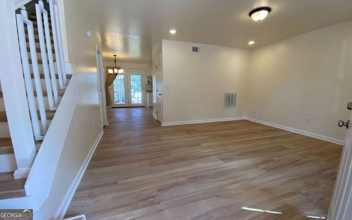Fully renovated end-unit townhome located in a desirable Austell community. This beautifully updated residence features a brick front and has been completely remodeled from top to bottom, including a new roof, drywall, paint, fixtures, windows, and appliances, offering a truly move-in-ready experience with modern, tasteful finishes throughout. The bright, white kitchen showcases solid surface countertops, stainless steel appliances, gas range and refrigerator. A generously sized pantry provides additional storage. Enjoy an open-concept dining area that flows seamlessly into a spacious living room, highlighted by a large picture window that fills the space with natural light. The home offers two generously sized bedrooms with ample closet space, along with a fully renovated bathroom featuring a new vanity and tub/shower combination. On site laundry hookup is set up for a stackable washer and dryer in the kitchen pantry. Step outside to a private back patio and take advantage of the additional outdoor storage. Lawn maintenance is included. The large backyard backs up to a peaceful wooded area, providing excellent privacy. Conveniently located with CobbLinc bus service at the front of the subdivision, and offering easy access to Veterans Memorial Highway, I-285, downtown Atlanta, and Hartsfield-Jackson Atlanta International Airport.