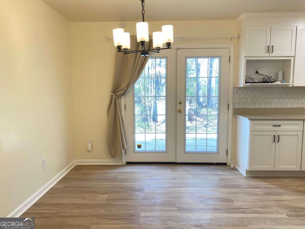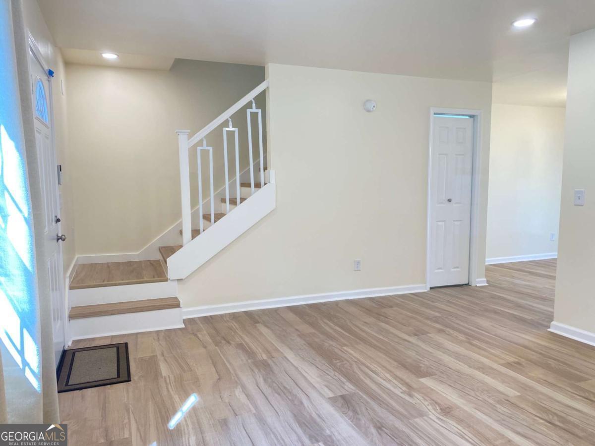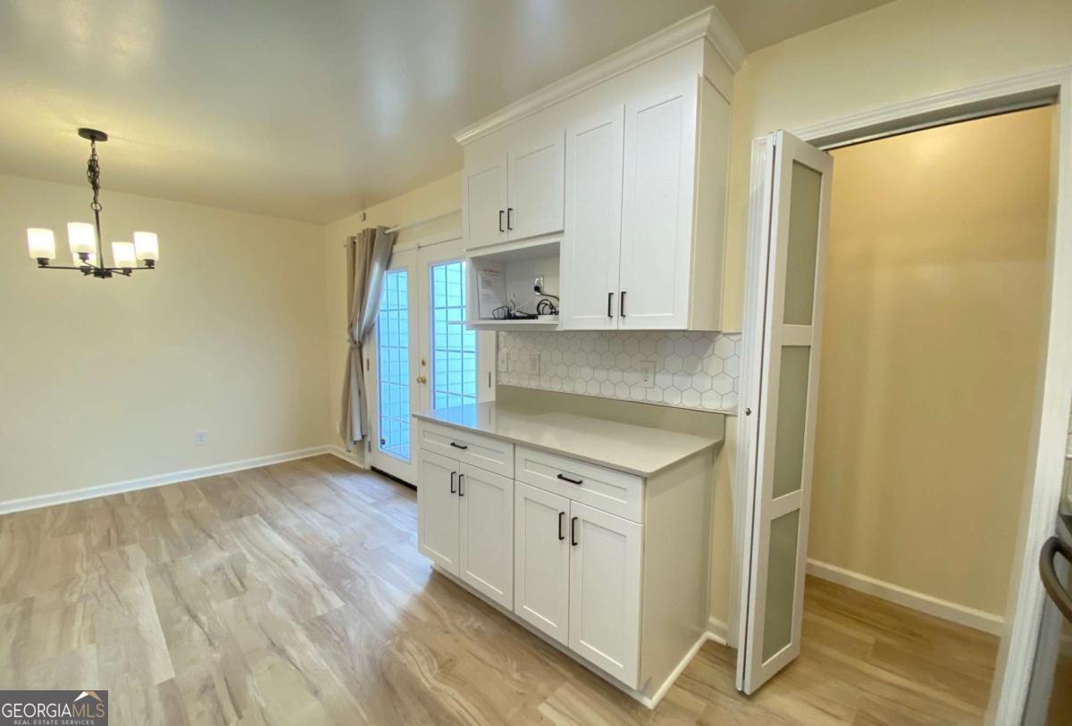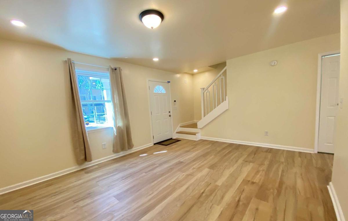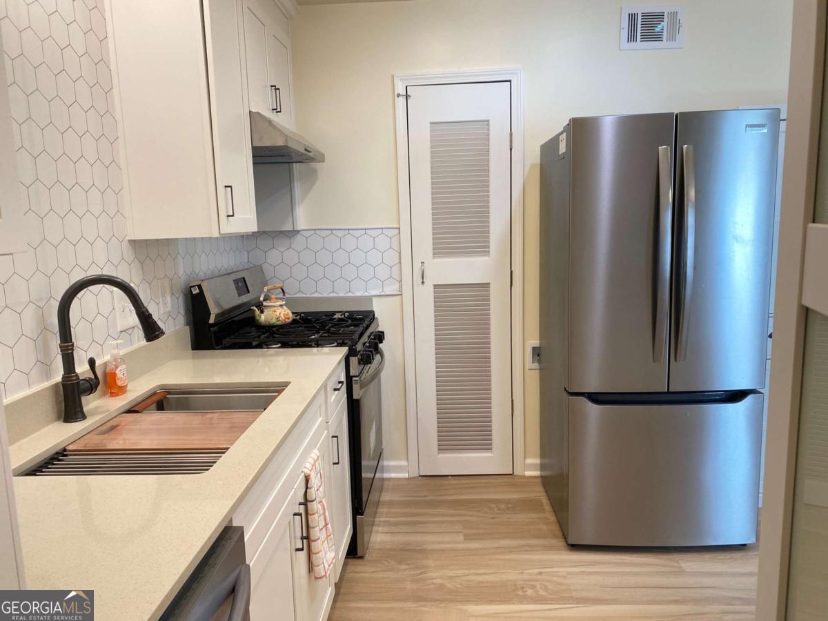 Fully renovated end-unit townhome located in a desirable Austell community. This beautifully updated residence features a brick front and has been completely remodeled from top to bottom, including a new roof, drywall, paint, fixtures, windows, and appliances, offering a truly move-in-ready experience with modern, tasteful finishes throughout. The bright, white kitchen showcases solid surface countertops, stainless steel appliances, gas range and refrigerator. A generously sized pantry provides additional storage. Enjoy an open-concept dining area that flows seamlessly into a spacious living room, highlighted by a large picture window that fills the space with natural light. The home offers two generously sized bedrooms with ample closet space, along with a fully renovated bathroom featuring a new vanity and tub/shower combination. On site laundry hookup is set up for a stackable washer and dryer in the kitchen pantry. Step outside to a private back patio and take advantage of the additional outdoor storage. Lawn maintenance is included. The large backyard backs up to a peaceful wooded area, providing excellent privacy. Conveniently located with CobbLinc bus service at the front of the subdivision, and offering easy access to Veterans Memorial Highway, I-285, downtown Atlanta, and Hartsfield-Jackson Atlanta International Airport.