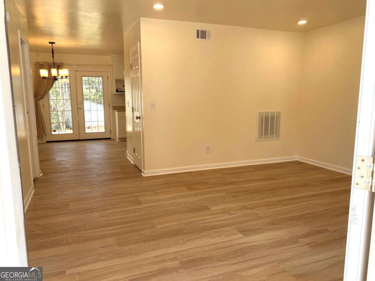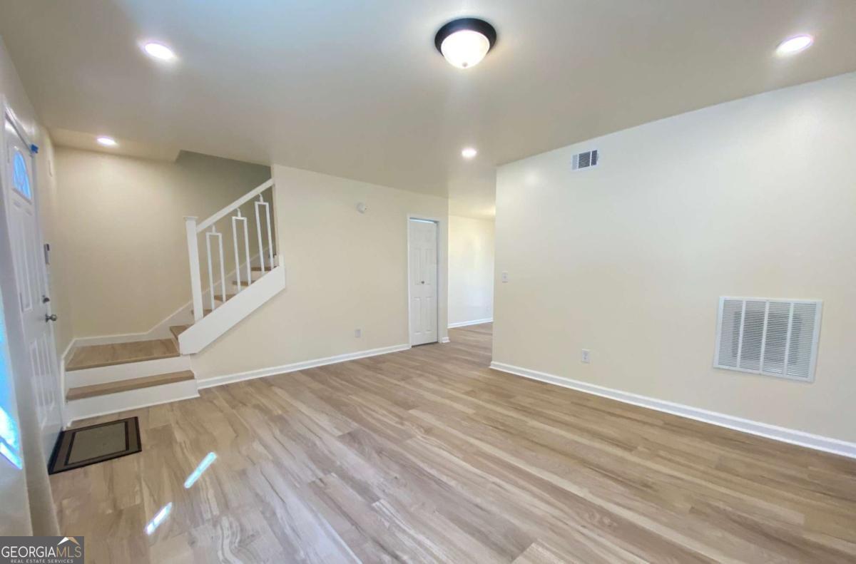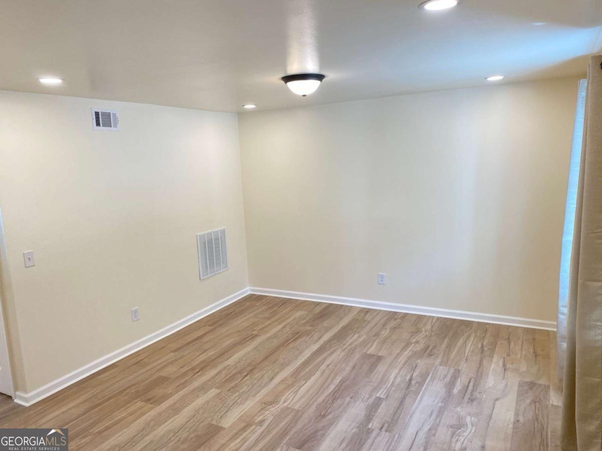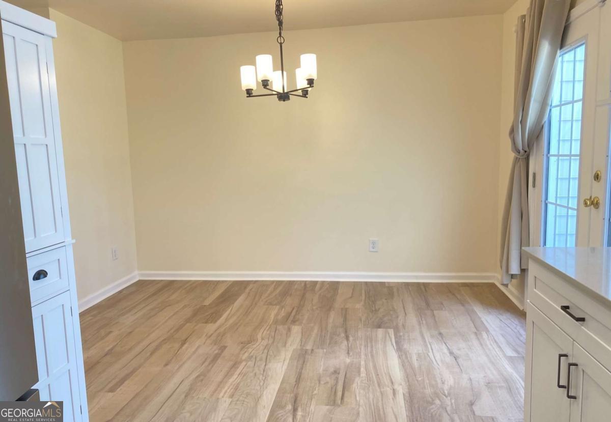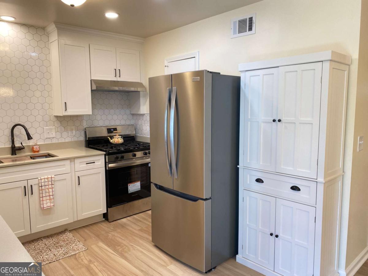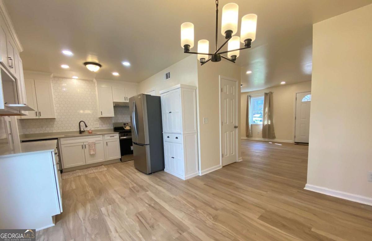 Fully renovated end-unit townhome located in a desirable Austell community. This beautifully updated residence features a brick front and has been completely remodeled from top to bottom, including a new roof, drywall, paint, fixtures, windows, and appliances, offering a truly move-in-ready experience with modern, tasteful finishes throughout. The bright, white kitchen showcases solid surface countertops, stainless steel appliances, gas range and refrigerator. A generously sized pantry provides additional storage. Enjoy an open-concept dining area that flows seamlessly into a spacious living room, highlighted by a large picture window that fills the space with natural light. The home offers two generously sized bedrooms with ample closet space, along with a fully renovated bathroom featuring a new vanity and tub/shower combination. On site laundry hookup is set up for a stackable washer and dryer in the kitchen pantry. Step outside to a private back patio and take advantage of the additional outdoor storage. Lawn maintenance is included. The large backyard backs up to a peaceful wooded area, providing excellent privacy. Conveniently located with CobbLinc bus service at the front of the subdivision, and offering easy access to Veterans Memorial Highway, I-285, downtown Atlanta, and Hartsfield-Jackson Atlanta International Airport.