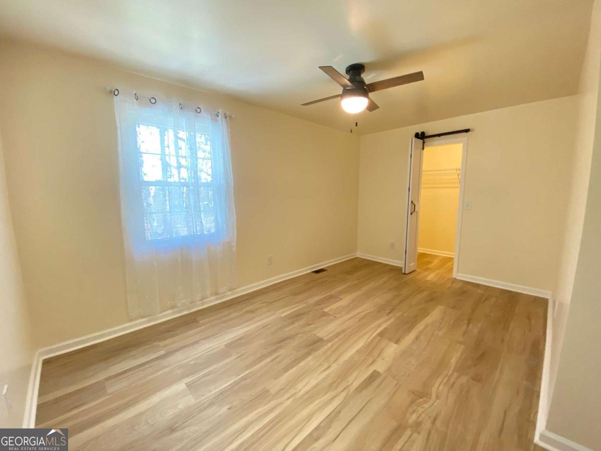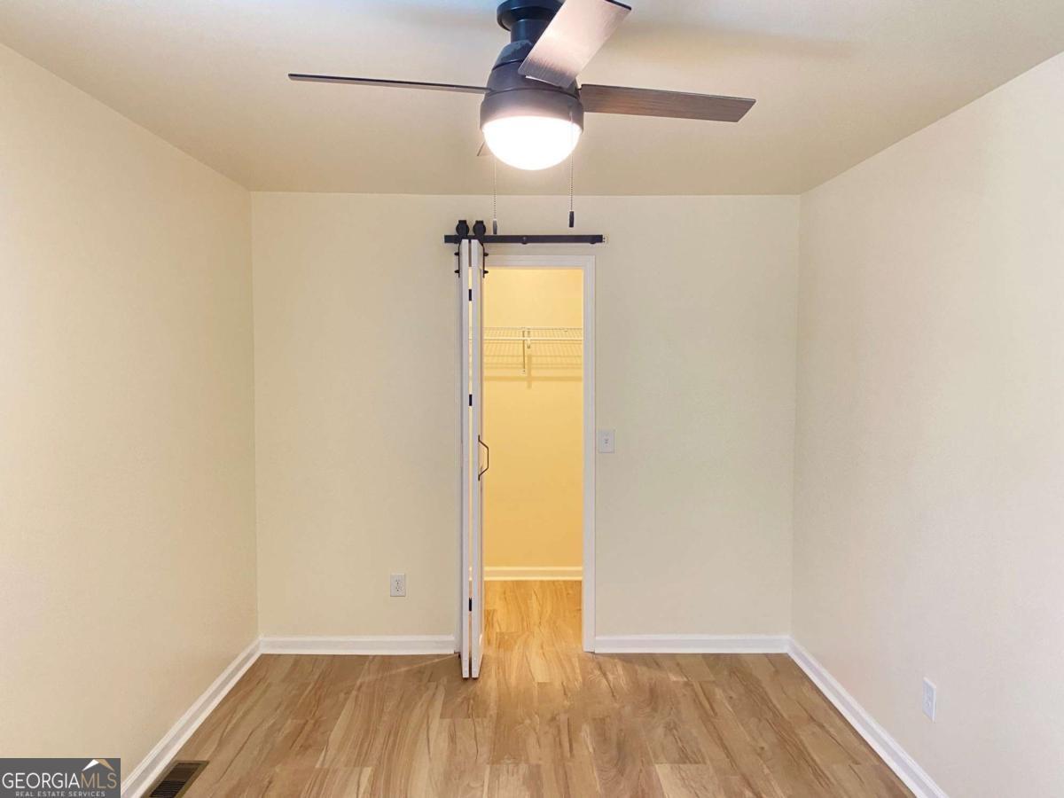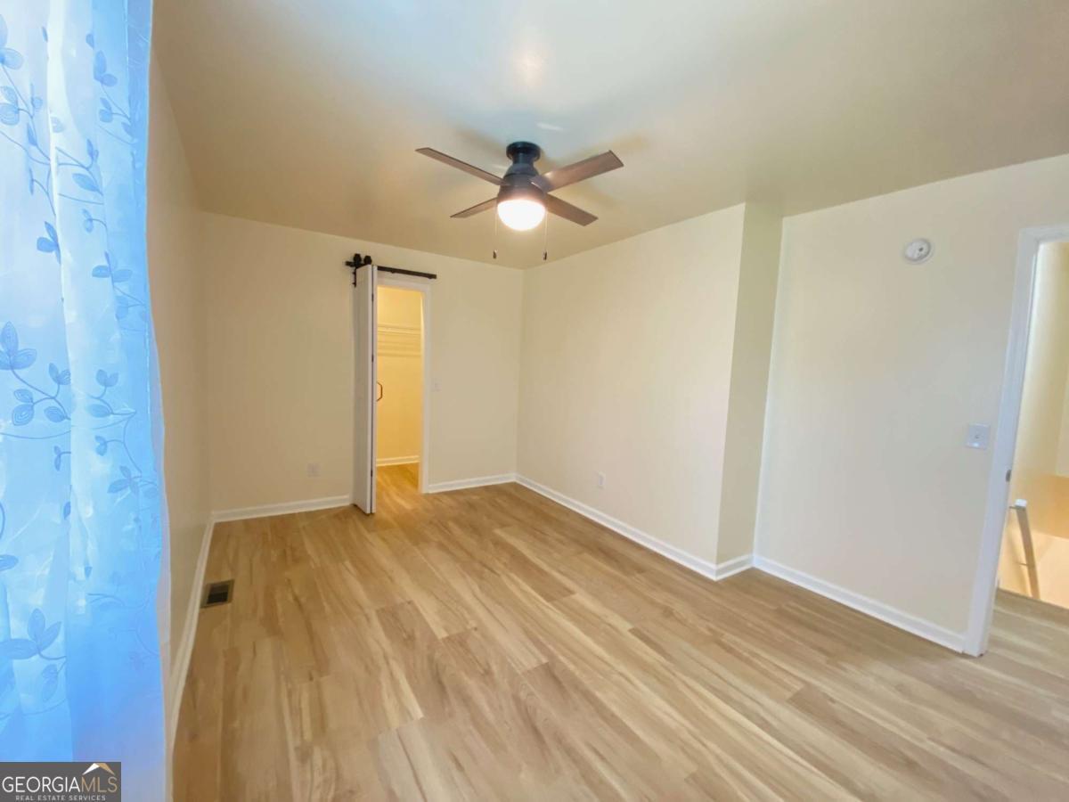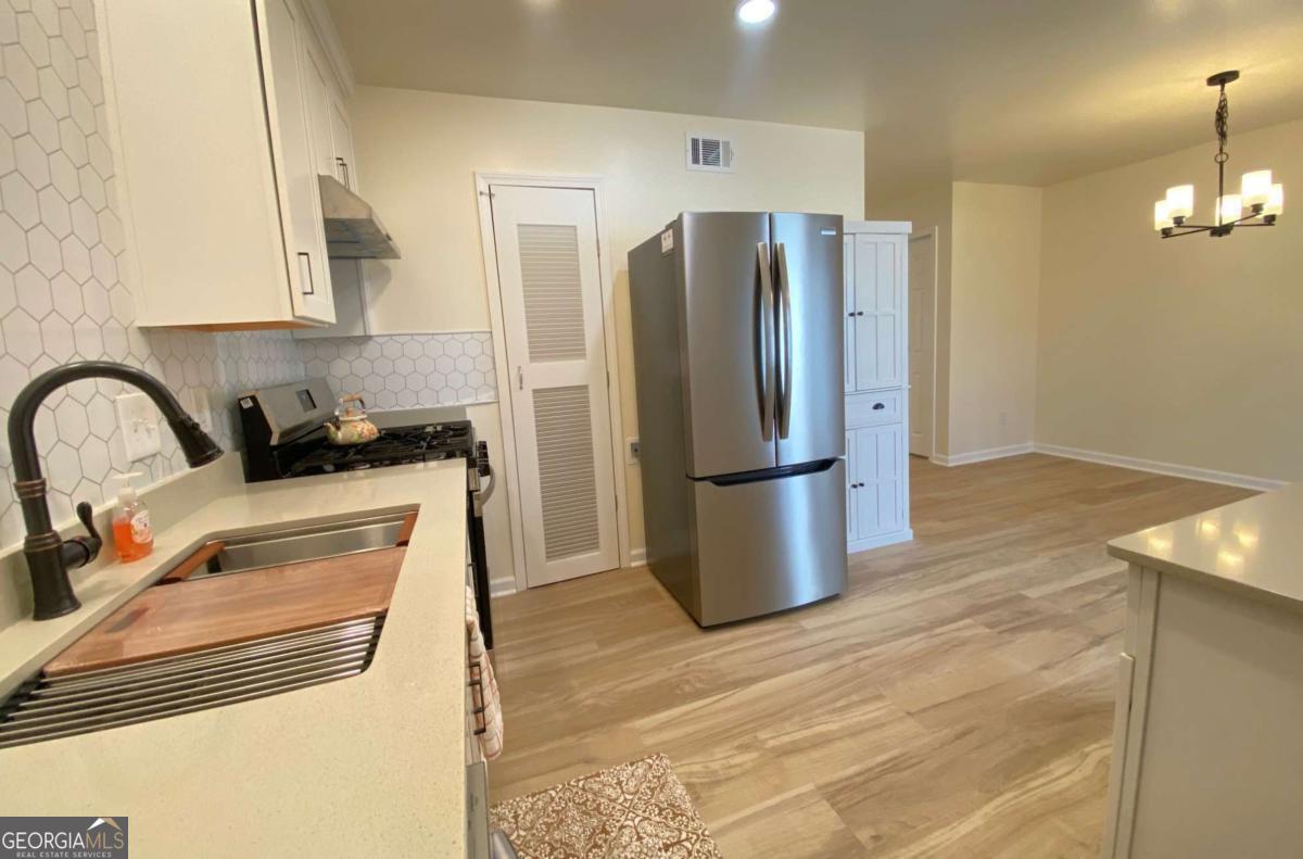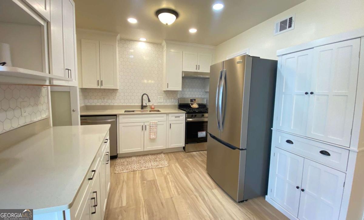 Fully renovated end-unit townhome located in a desirable Austell community. This beautifully updated residence features a brick front and has been completely remodeled from top to bottom, including a new roof, drywall, paint, fixtures, windows, and appliances, offering a truly move-in-ready experience with modern, tasteful finishes throughout. The bright, white kitchen showcases solid surface countertops, stainless steel appliances, gas range and refrigerator. A generously sized pantry provides additional storage. Enjoy an open-concept dining area that flows seamlessly into a spacious living room, highlighted by a large picture window that fills the space with natural light. The home offers two generously sized bedrooms with ample closet space, along with a fully renovated bathroom featuring a new vanity and tub/shower combination. On site laundry hookup is set up for a stackable washer and dryer in the kitchen pantry. Step outside to a private back patio and take advantage of the additional outdoor storage. Lawn maintenance is included. The large backyard backs up to a peaceful wooded area, providing excellent privacy. Conveniently located with CobbLinc bus service at the front of the subdivision, and offering easy access to Veterans Memorial Highway, I-285, downtown Atlanta, and Hartsfield-Jackson Atlanta International Airport.
