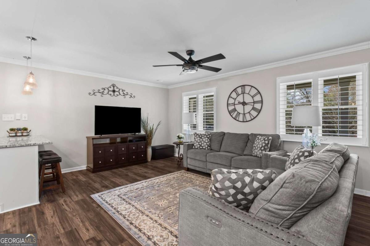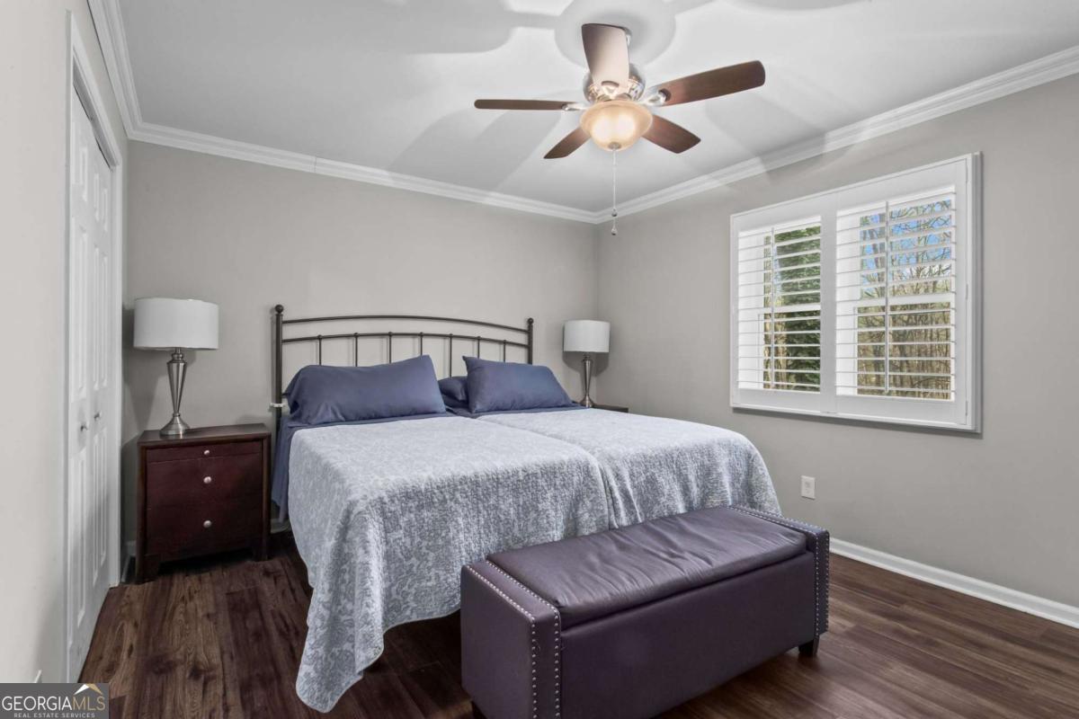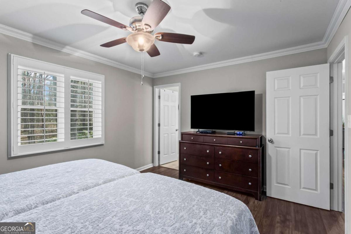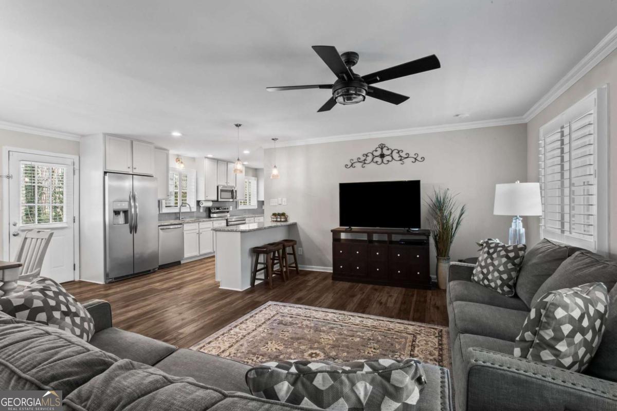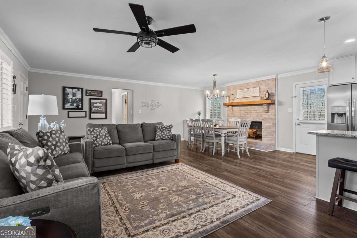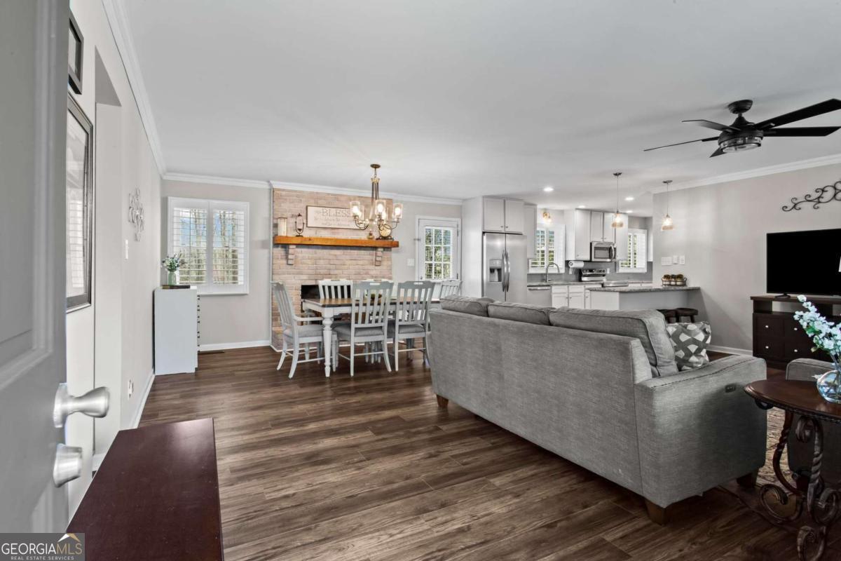 Beautifully-maintained 3 bedroom, 2 bathroom ranch offering 1,429 square feet of single-level living in Austell. Located on a quiet cul-de-sac, the property features a flat, private backyard surrounded by trees, along with a rear patio. The home offers a functional layout with an eat-in kitchen, open dining and living area, separate laundry room, and all bedrooms and bathrooms located down the main hallway. Interior finishes include a clean farmhouse-style aesthetic with custom plantation shutters installed throughout. Extensive updates have already been completed. In 2017, renovations included a new kitchen with granite countertops, updated bathrooms, LVP flooring throughout, new windows, water heater, and an encapsulated crawl space. In 2018, the carport was enclosed to create a 2-car garage, and additional improvements included a concrete walkway, expanded parking pad, crown molding, and plantation shutters. The HVAC heat pump was replaced in 2022, and the roof was replaced in 2023. No HOA. Connected to public water and sewer. Move-in ready with major systems and upgrades already addressed.
