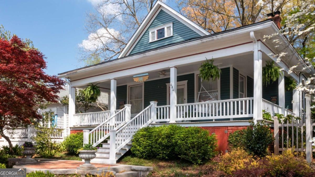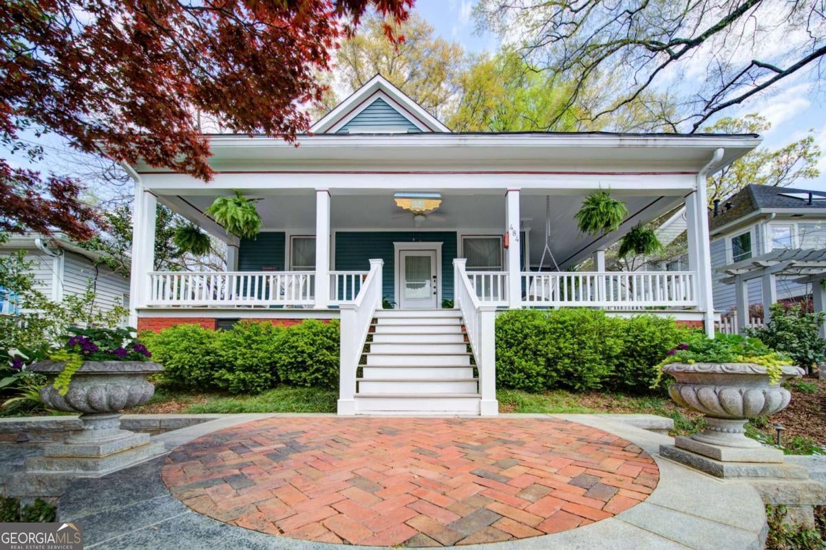 A gracious Victorian Bungalow in the heart of Historic Grant Park, with a thoughtfully curated renovation that has preserved much of the period charm of the original home. At the curb one is greeted by an elegant set of custom cut Elberton Granite stairs, which wind their way around a mature Bloodgood Japanese Maple to an inviting Landing of Herringbone Brick, bordered with curving granite capstone, and topped with matching Elberton Granite planters. From its elevated perch a warm and inviting wrapped front porch provides commanding views of sunsets to the West and the Atlanta skyline to the North. Inside one finds a gorgeous Living Room with soaring 10+ ceilings, period heart pine flooring, custom dental molding, and a working fireplace with original tile, mantle, and coal basket-one of four located throughout the house. A set of original working pocket doors leads from the Living Room to a lavishly appointed Dining Room, also with original heart pine flooring and working fireplace. The Dining Room opens to a generously scaled Den and Study (also with working fireplace), as well as a large, well-appointed eat-in Kitchen with stainless appliances, cork flooring, and Breakfast Nook. A guest bedroom, hall bath with period claw foot tub, and primary suite with large walk-in closet, full en suite bath, and French doors leading out to a private Terrace complete the downstairs. The soaring 10' ceilings continue upstairs, in an artfully arranged 2nd story addition featuring built-in period linen closet, full bath, two large bedrooms with full closets, and ample attic space. Don't miss this opportunity to make this warm and welcoming Grant Park Bungalow your very own home!