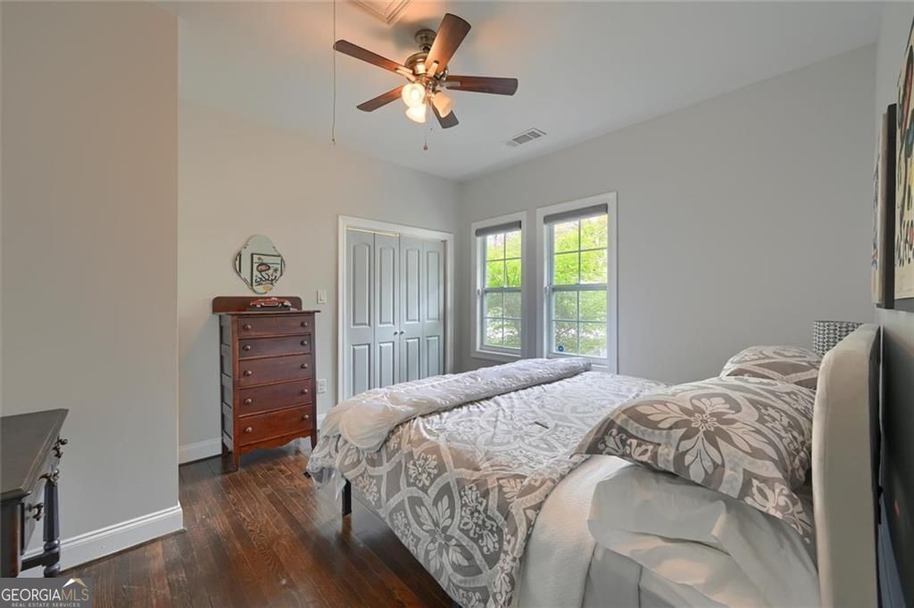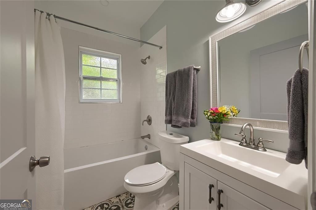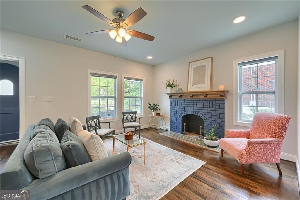 This beautifully renovated 1930s Storybook-style home, listed on the National Register of Historic Homes, is just steps away from Woodward Academy and Barrett Park. Relax on your charming front porch and soak in the vibrant atmosphere of College Park. As you enter through the classic front door you will be amazed by the open-concept design featuring a family room with a cozy brick fireplace and beautiful custom mantle, a dining area and a fabulous kitchen with quartz countertops, a large island, state-of-the-art stainless steel appliances, and shiplap accents. Original refinished hardwood floors run throughout the home, complemented by tile in both bathrooms. The spacious primary suite includes a modern ensuite bath with a double vanity, a separate soaking tub, and a walk-in closet. Every room is bright and airy, filled with natural light. Enjoy the 1930s charm and character while offering all the latest modern updates. Relax in your private, peaceful backyard oasis. There's plenty of storage and space in the unfinished basement for play or workout.