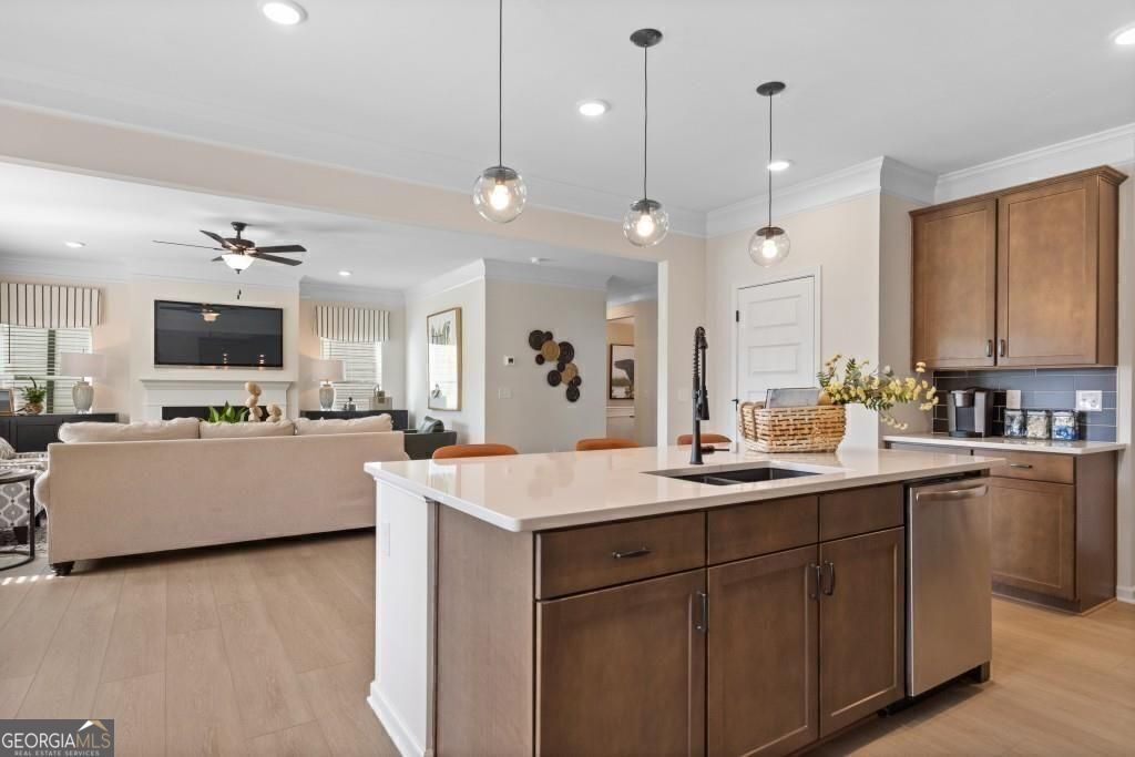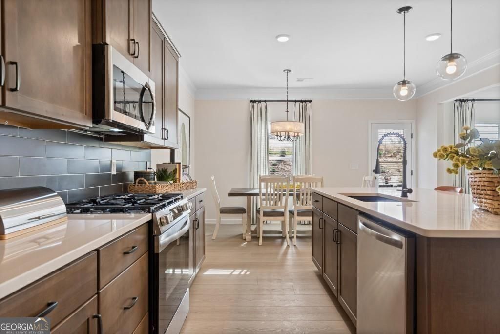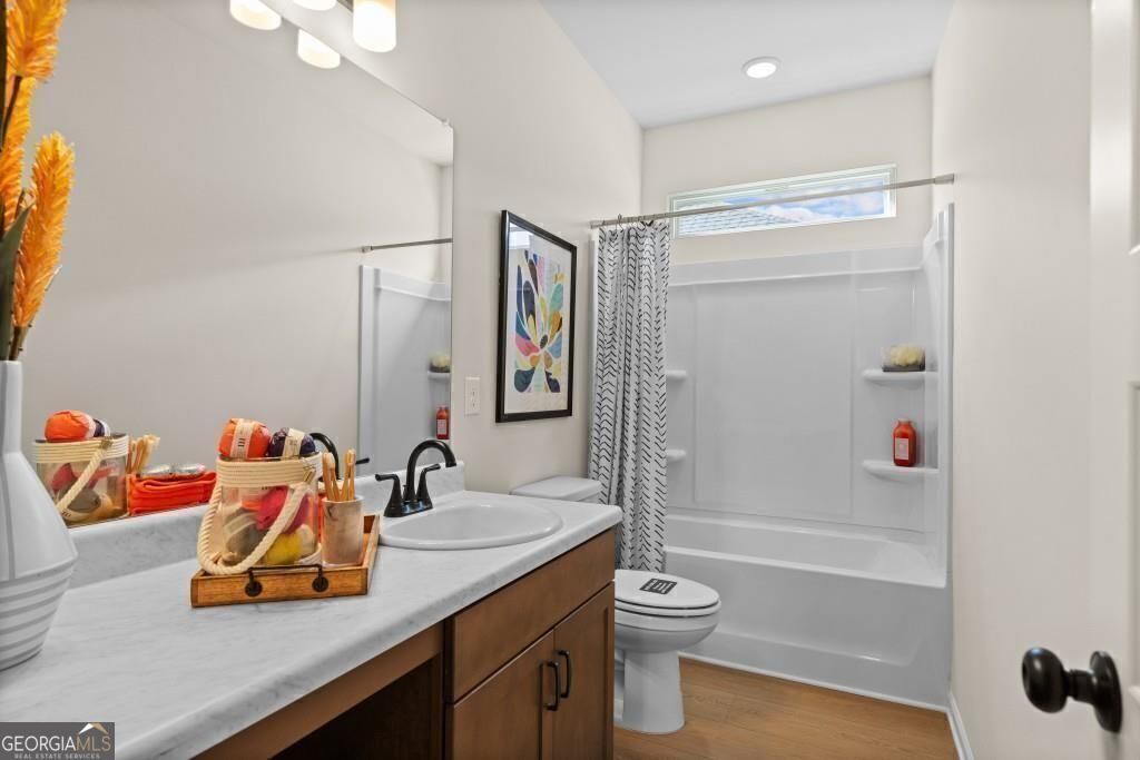 Move-In Ready July! The Harrington plan by Smith Douglas Homes delivers spacious two-story living with a layout designed for comfort, flexibility, and modern appeal. The main level offers an open-concept design with a bright family room, dining area, and private study-ideal for working from home or creating a quiet retreat. A cozy fireplace adds warmth and charm to the family room. The kitchen serves as the heart of the home, featuring a large center island, granite countertops, tile backsplash, 36" upper cabinets, and stainless-steel appliances. Step outside to the large rear patio, perfect for entertaining or relaxing outdoors. Upstairs, the oversized primary suite includes a sitting area and a spa-like bath with double marble vanities, and a large shower. Three additional bedrooms share a full bath, and the conveniently located upstairs laundry room adds everyday ease. With 9-foot ceilings throughout, this home offers an open, airy feel. Photos are representative of the floor plan and not the actual home. Seller incentives available with preferred lender-schedule your tour today.