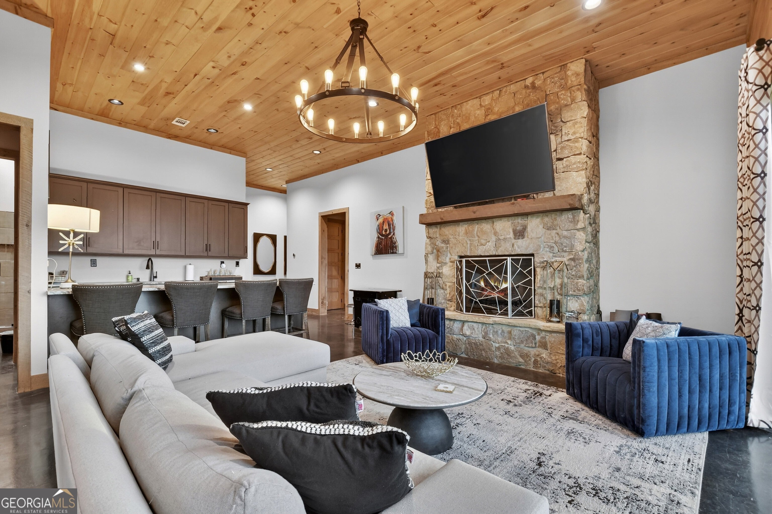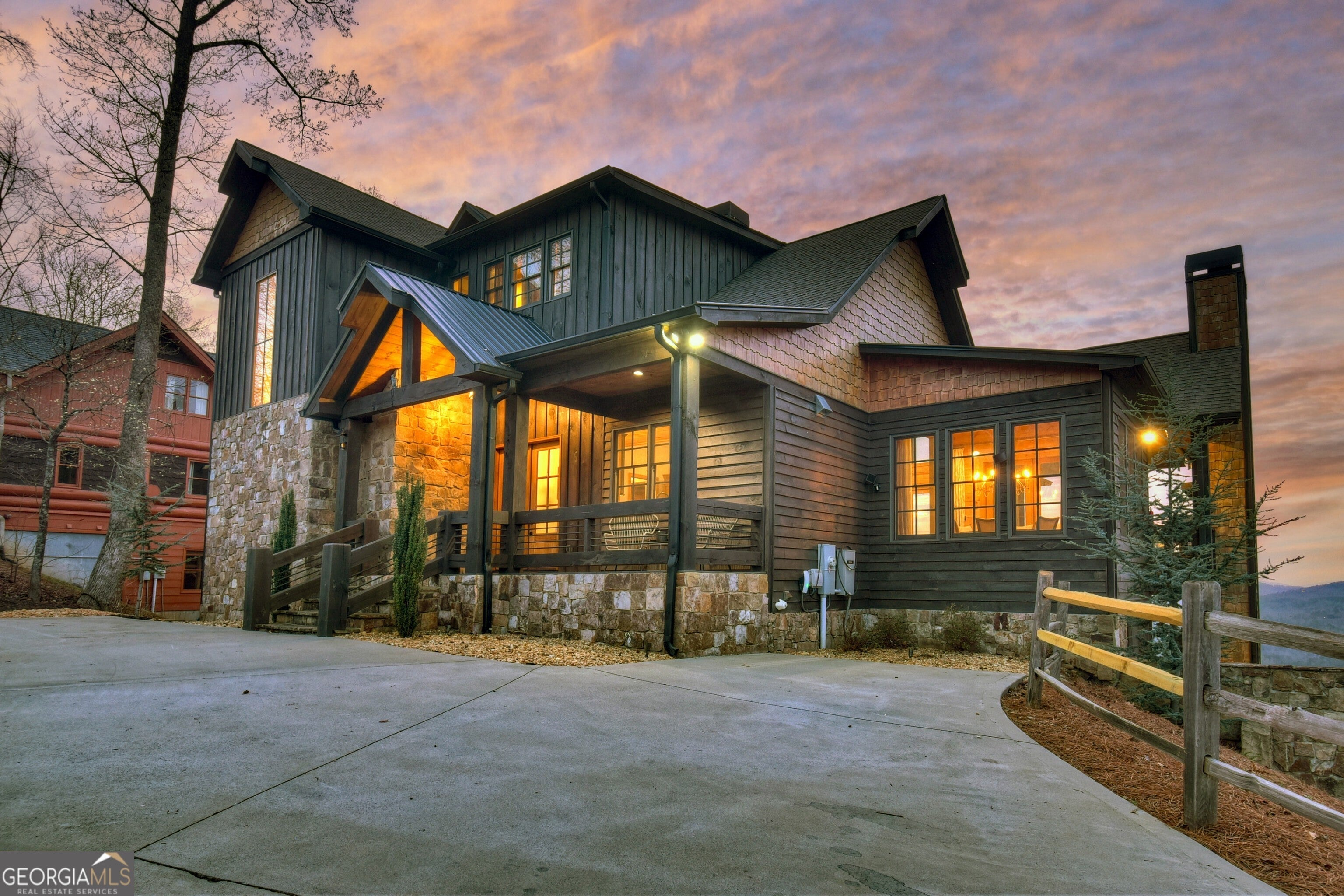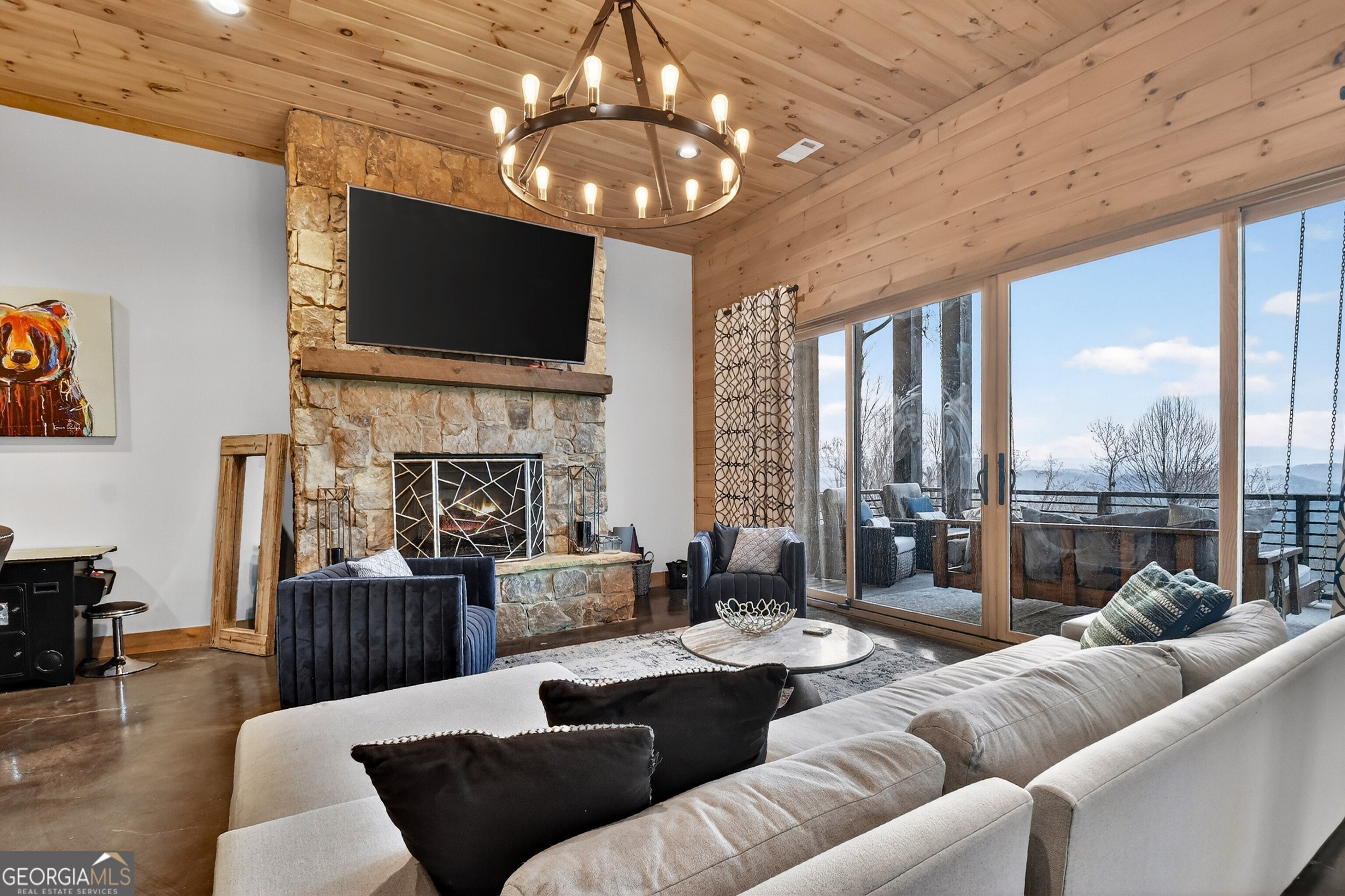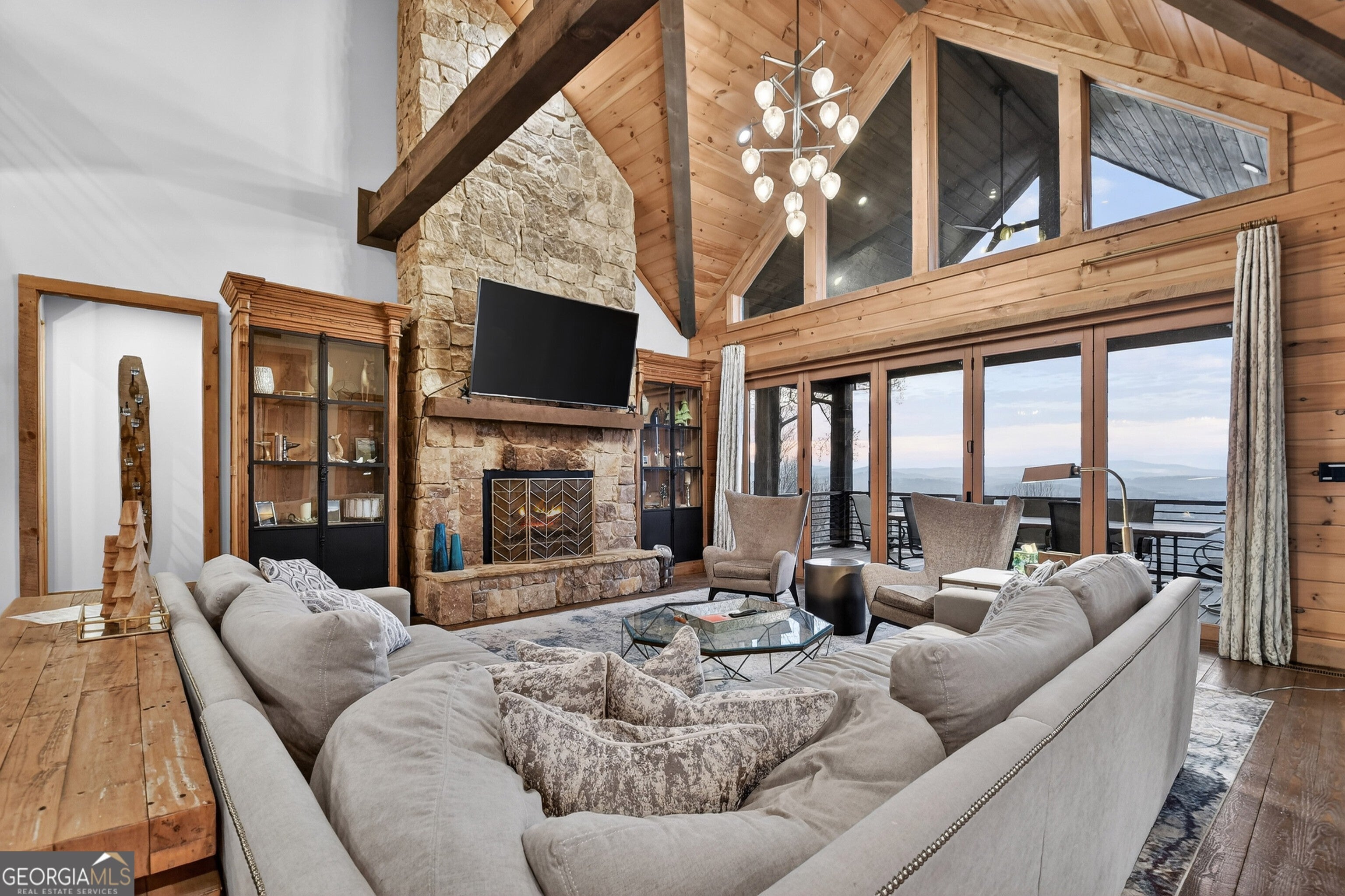 Experience unparalleled luxury at 472 Overlook Drive in the prestigious, gated Blue Ridge Heights community: a modern mountain masterpiece showcasing a rare tri-state panoramic view and a private, heated infinity pool that seamlessly meets the horizon. Designed to impress from the moment you step inside, this showpiece cabin is framed by soaring floor-to-ceiling glass that captures layered, postcard-perfect mountain vistas. The open-concept layout blends refined rustic finishes with upscale comfort, anchored by a dramatic great room and breathtaking natural light. The gourmet chef's kitchen is a true standout, complete with a 6-burner gas range, premium appliances, abundant workspace, and a large island perfect for gathering with family and friends, all set against an unforgettable mountain backdrop. Offering four full primary suites plus a bunk room and office, this home ensures every guest enjoys an equally luxurious retreat, each suite appointed with spa-style finishes and serene views. The terrace level is designed for entertainment and relaxation, featuring a stylish wet bar, expansive recreation room, and seamless walk-out access to the signature infinity-edge pool - your private front-row seat to awe-inspiring sunsets and sweeping three-state vistas. Whether as a full-time residence, second home, or high-performing luxury rental, this property delivers the ultimate Blue Ridge lifestyle with unmatched scenery, upscale amenities, and an unforgettable setting above the treetops.