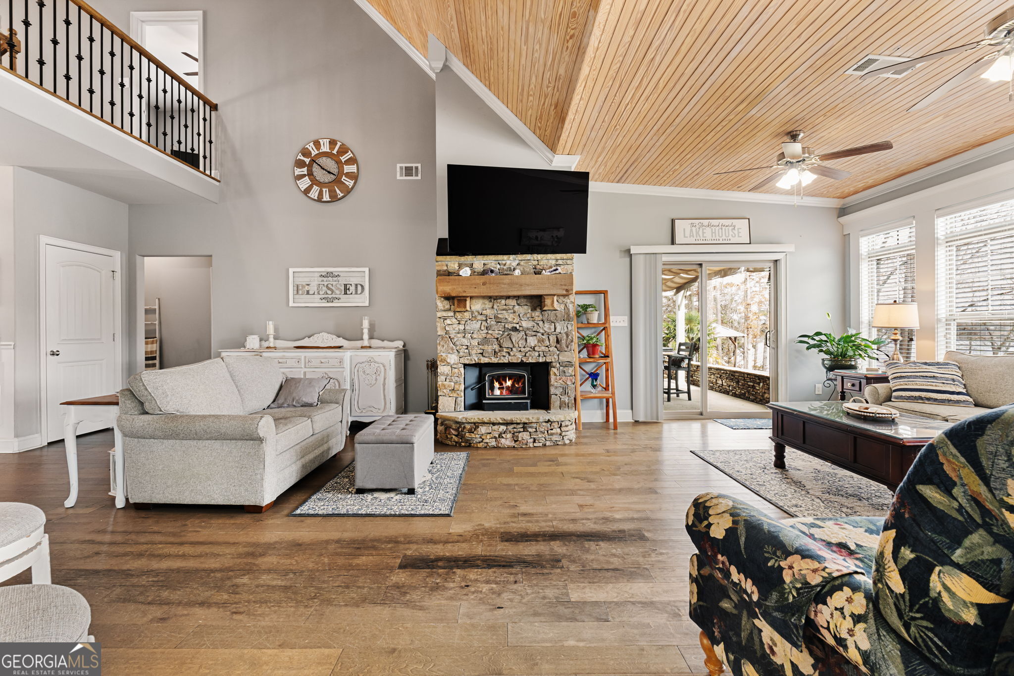 **Luxury Craftsman Lakefront Estate on Jackson Lake - A Rare Opportunity!** Welcome to your dream lakefront retreat in the highly sought-after River Point Subdivision on beautiful Jackson Lake! This stunning primary living space has 5 bedrooms with 4.5 bathrooms with 2 separate apartments above each garage making it a total of 7-bedrooms, 6.5-bathrooms. This luxury Craftsman home, built in 2017, is perfectly situated on a DEEDED 1.56 acre lot, offering unparalleled serenity, elegance, and breathtaking waterfront views. A dock is NOT allowed on this property due to 45 ft of waterfront, but a boat/jet skis are allowed to be anchored to seawall. From the moment you wind up the driveway, you'll be captivated by the charm of this exquisite property. Ample parking leads you to a rocking chair front porch, where you'll be greeted by a striking custom wood front door and tongue-and-groove ceilings that extend from the front entrance to the back of the home. Main Level Features: Spacious, open living room with a stone wood fireplace and picturesque lake views. Gourmet kitchen with granite countertops, stainless steel appliances, and an expanded walk-in pantry. Bright and airy breakfast area/dining room with bay windows and sliding glass doors leading to the screened-in porch overlooking the lake. Primary bedroom suite with sliding glass doors opening to the screened porch-wake up to peaceful water views every morning. Luxury en-suite bathroom with double granite vanity, large tile shower, and a soaking tub. Convenient laundry room and half bathroom near the foyer on the main level. Upper Level Features: Two oversized guest bedrooms with a shared full bathroom and oversized linen closet. Outdoor Oasis: Step onto the custom stone back patio, complete with a pergola and firepit, perfect for entertaining and relaxing by the lake. Partial fenced backyard, ideal for pets and children to play safely. Irrigation system sourced from the lake for both front and back yard. Gazebo with a swing, offering breathtaking waterfront views. Seawall and flat area designed for a bonfire and additional swings at the bottom of the property located next to the water. Dock Edge Dock Side Mooring Whips for securing your boat or jet skis. Bonus Living Spaces: This home features two detached two-car garages, each boasting a private 1-bedroom apartment with a full kitchen, living area, and full bathroom-ideal for guests, rental opportunities, or multi-generational living. With summer just around the corner, imagine waking up with your morning coffee on the porch, soaking in the peace and tranquility of Jackson Lake. Whether hosting family gatherings, enjoying water activities, or simply unwinding in nature, this luxurious lakefront estate offers the ultimate escape. Don't miss this rare opportunity-schedule your private showing today with your favorite Realtor!