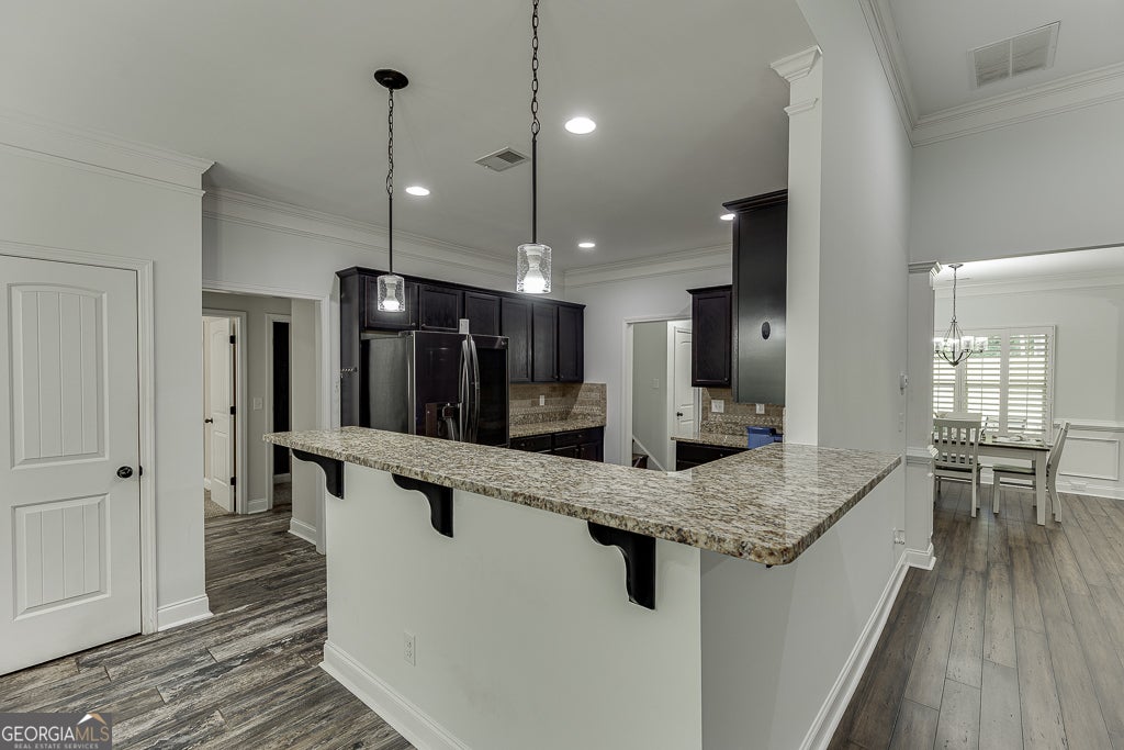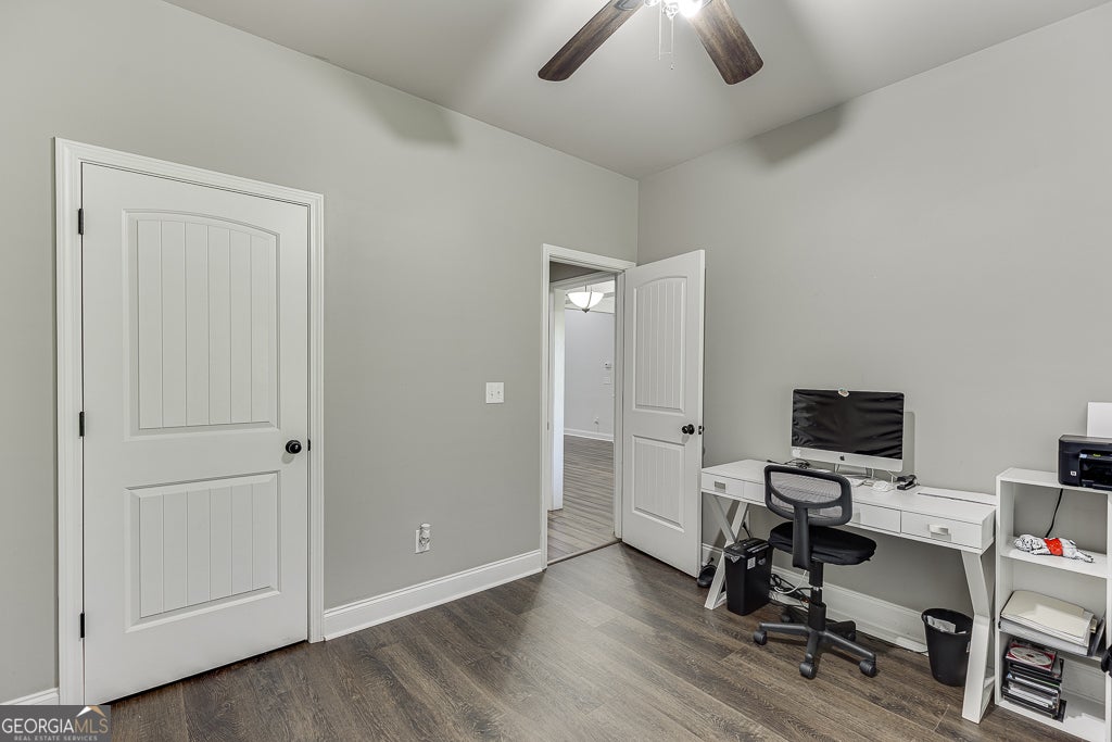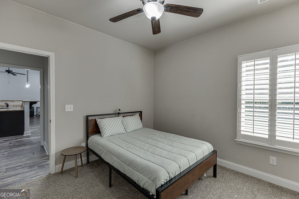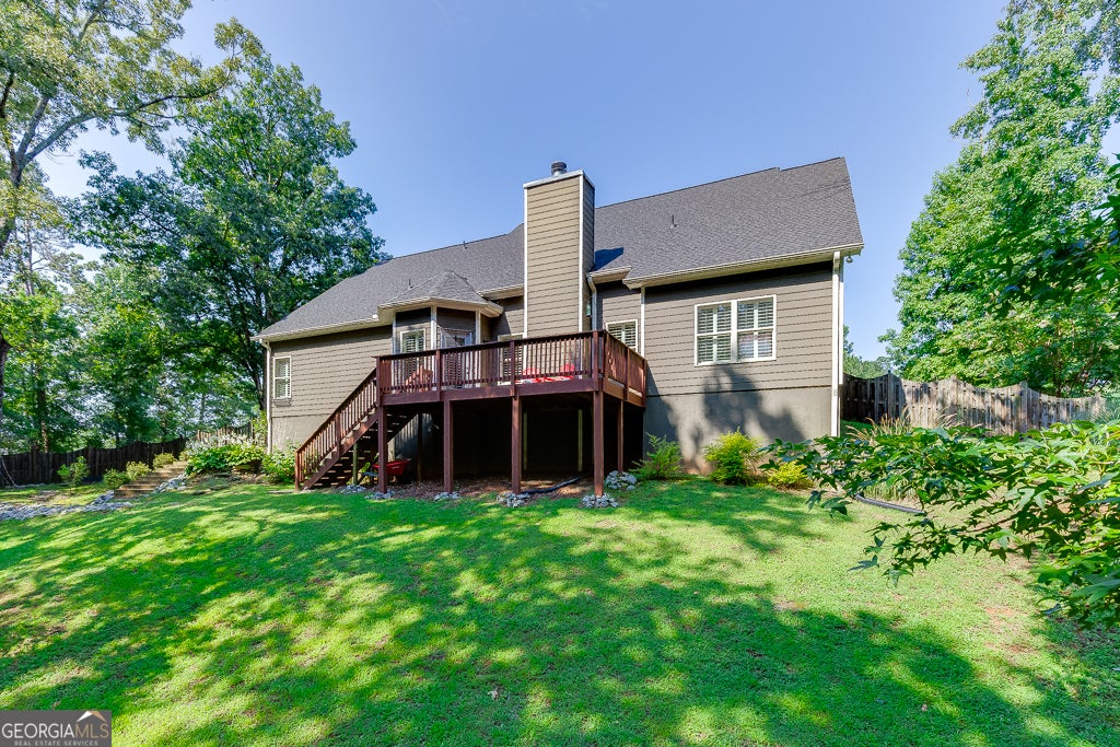 Freshly painted and move-in ready, this beautifully maintained ranch in Shadowstone Estates offers 5 bedrooms and 4 full baths on over 1.2 acres. Inside, you'll find an open layout featuring solid bamboo flooring in the foyer and great room, a spacious dining room, and a chef's kitchen with granite countertops, ceramic tile flooring, a breakfast area, bar seating, and stainless steel appliances. Upgrades include plantation shutters, newer carpet with upgraded padding in all bedrooms, and an oversized 5th bedroom/bonus room with a private bath-perfect for guests or a home office. The home also features a newer roof with architectural shingles. Enjoy the large back deck overlooking the private, wooded lot-complete with creek access and a waterfall feature. Located near parks, schools, and Chateau Elan with easy access to I-85.
