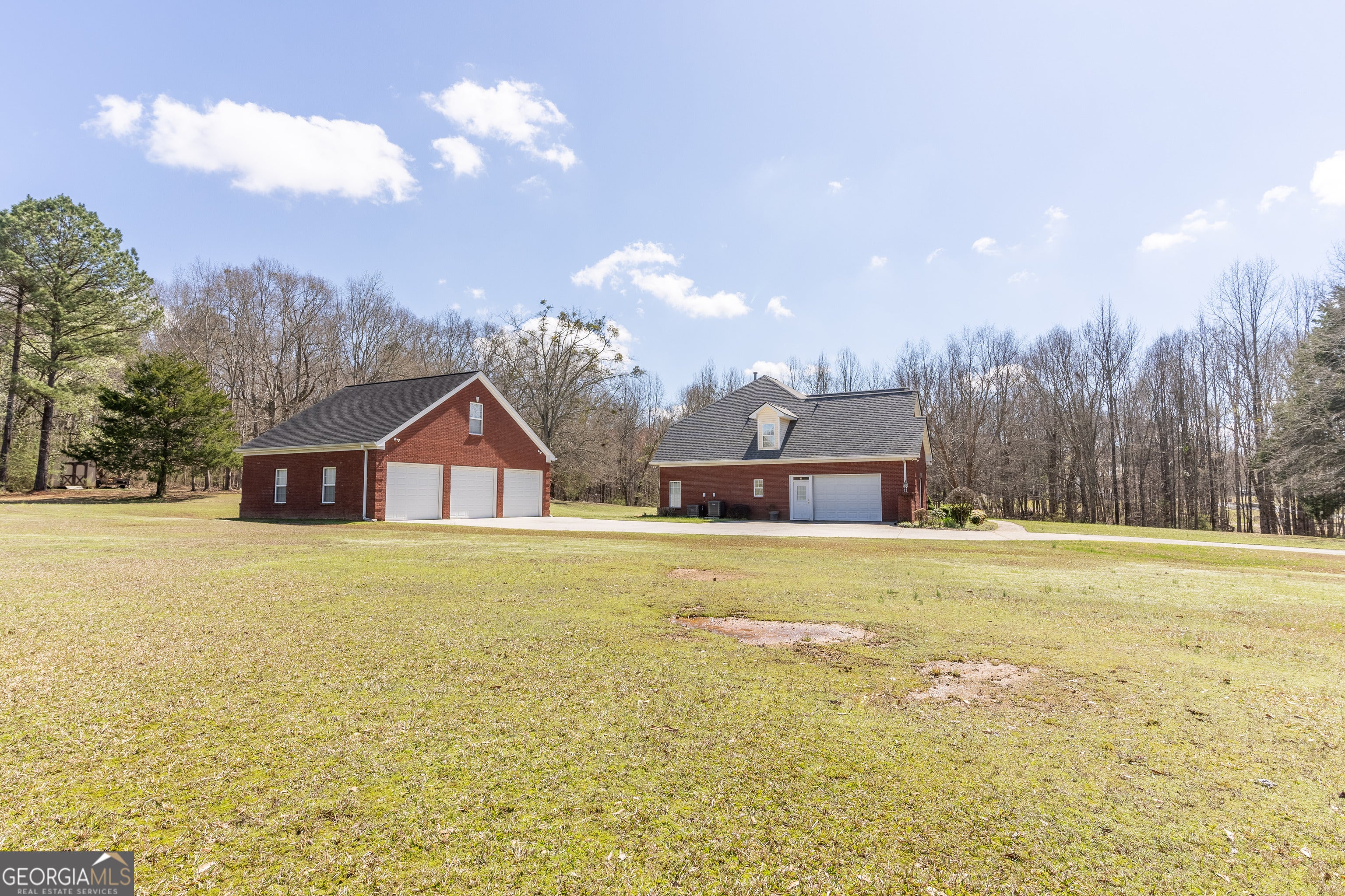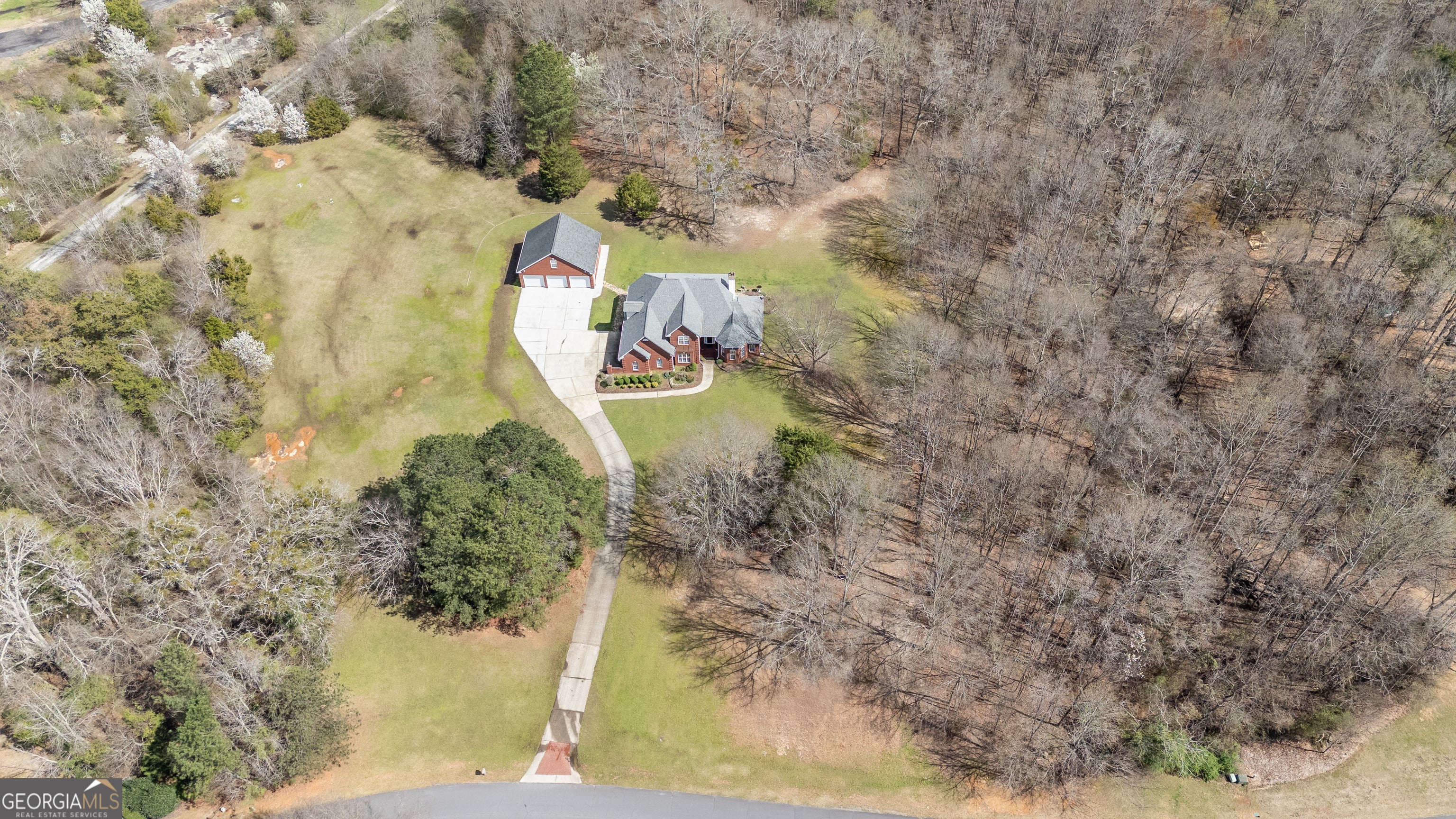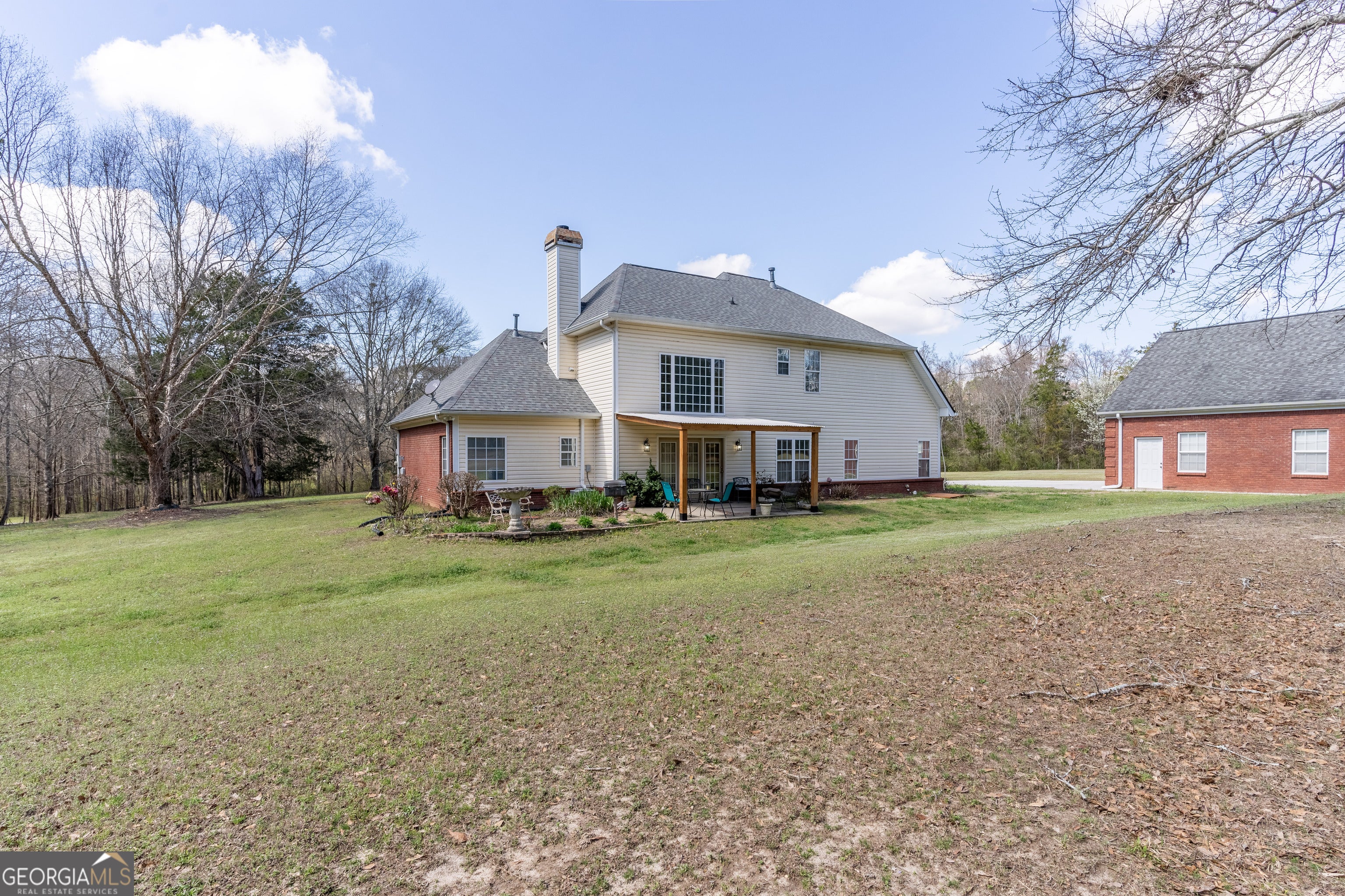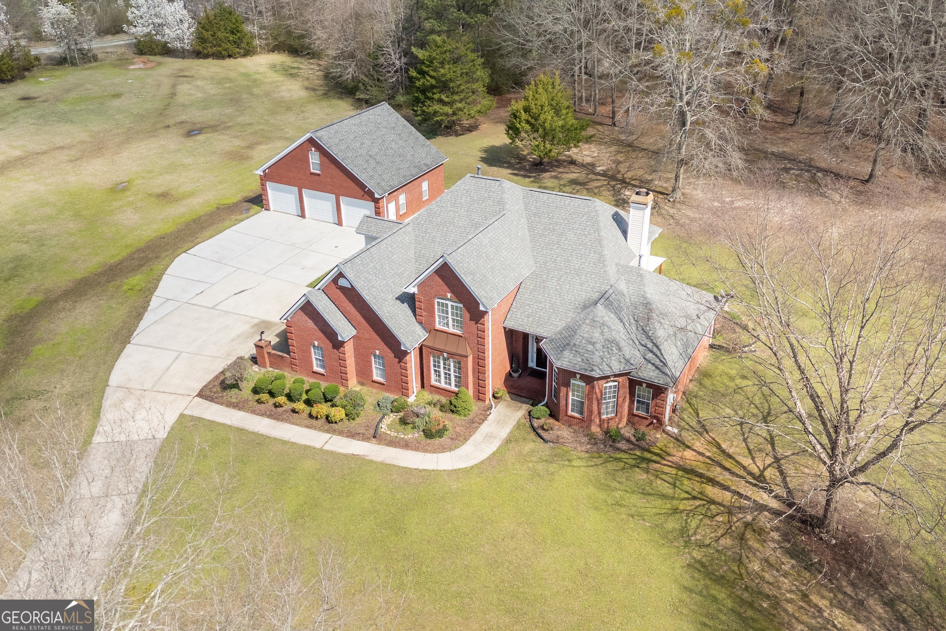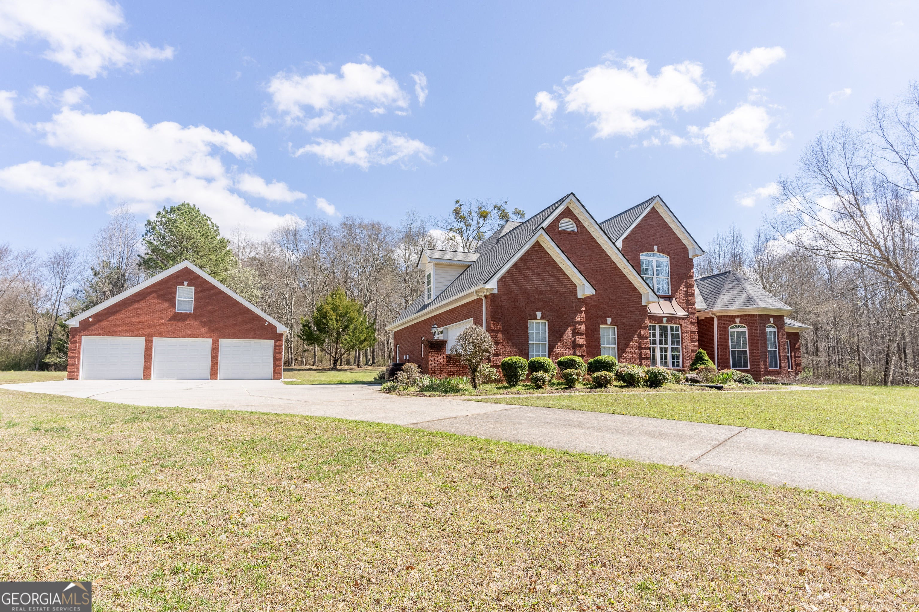 Welcome to this stunning 4 bedroom 3.5 bath home nestled on 5.6 partially wooded acres, offering privacy, space and timeless charm. This beautiful three sided brick home provides the perfect blend of comfort and functionality with room to relax, entertain and enjoy nature. The primary suite is conveniently located on the main level and features a relaxing sitting area in the bay window creating the perfect reading nook or peaceful retreat. The spacious primary bathroom includes a whirlpool tub, separate shower, double vanity and a large walk-in closet. The main level offers excellent living and entertaining space, including a separate dining room that comfortably seats 12+ guests, perfect for gatherings and holidays. The kitchen features granite countertops, range, microwave, refrigerator and a bright breakfast area, with the laundry room conveniently located nearby on the mail level. Just off the kitchen is a large den/entertainment room, ideal for family time, movie nights or hosting friends. Upstairs you'll find three additional bedrooms. One bedroom includes its own private bathroom with a tub/shower combo, while the other two bedrooms share a jack-and-jill bathroom, offering both privacy and convenience. Step outside to enjoy the covered patio overlooking the peaceful property. A seasonal creek borders the side of the land, adding natural beauty and tranquil setting. The property also features a large detached 3 car garage, providing ample storage, workshop space or room for vehicles and equipment. If you're looking for space, privacy and beautiful natural setting, this property offers it all.