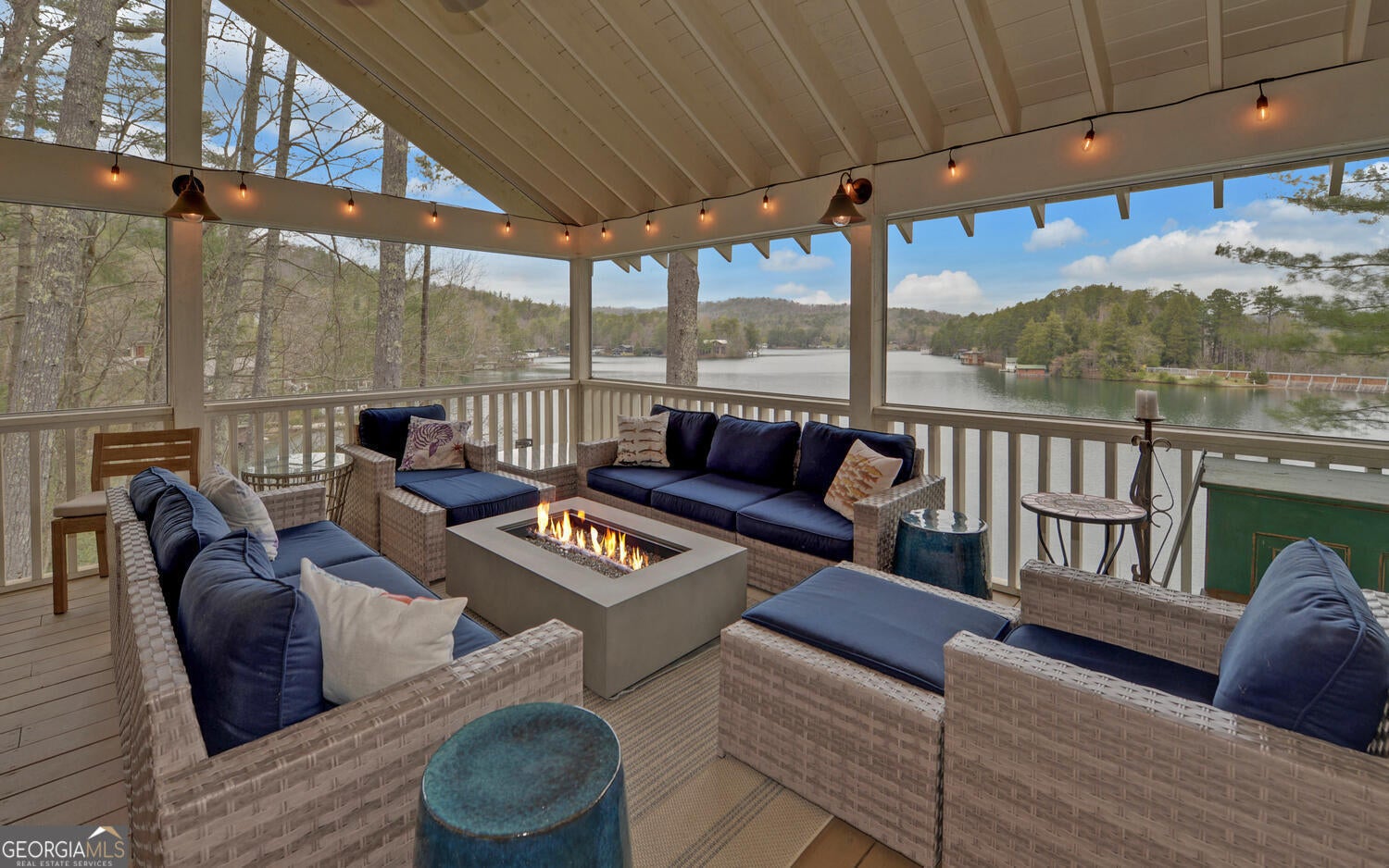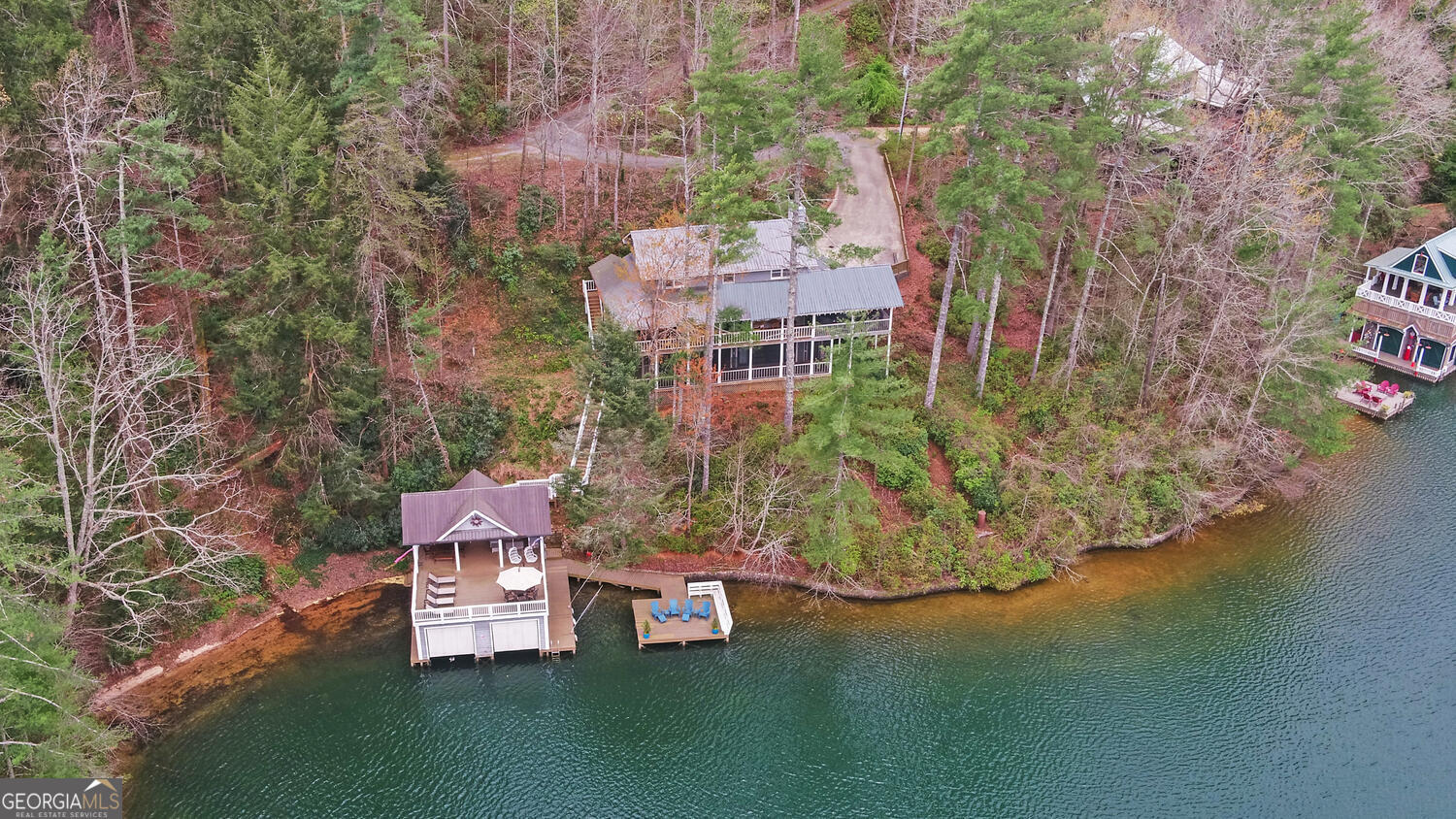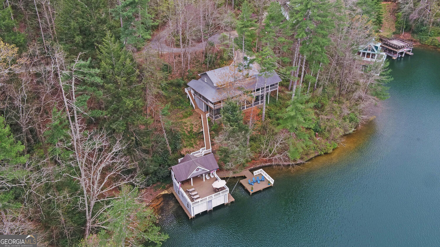Enjoy easygoing summers on Lake Rabun in this beautifully maintained lake home, just minutes from Clayton and one of the most convenient spots on the lake to reach from Atlanta. As you pull up, you'll love the home's classic lake charm, with big porches and plenty of outdoor space to kick back and take in the views. Inside, the main living area is bright and welcoming, with a cozy stone fireplace and lots of windows that bring in natural light along with beautiful lake and mountain scenery. Right off the living room, you'll find a spacious screened porch and an open deck-perfect for morning coffee, evening drinks, or hosting friends and family. The kitchen and dining area offer plenty of room to gather and open out to another deck that's great for grilling. There's also a full bathroom on the main level for added convenience. Upstairs features three comfortable bedrooms and two full baths, offering plenty of space for family and visitors. Downstairs, the recently updated terrace level includes a large primary suite with a gorgeous bathroom, as well as a charming guest room with its own ensuite. And when you're ready to enjoy the water, it's just a short walk to the lakefront where you'll find a well-kept two-story, two-stall boathouse, an extra swim dock, and a beach-style area that's perfect for swimming and relaxing.