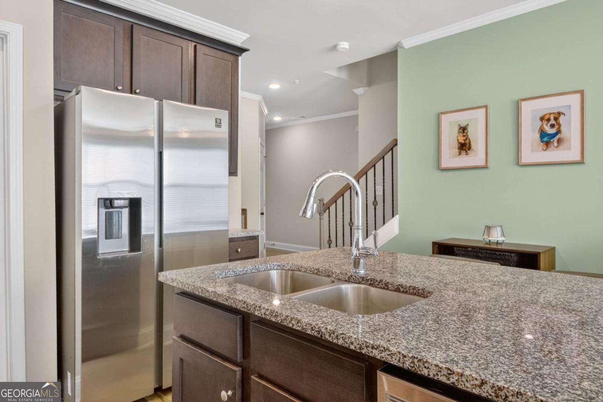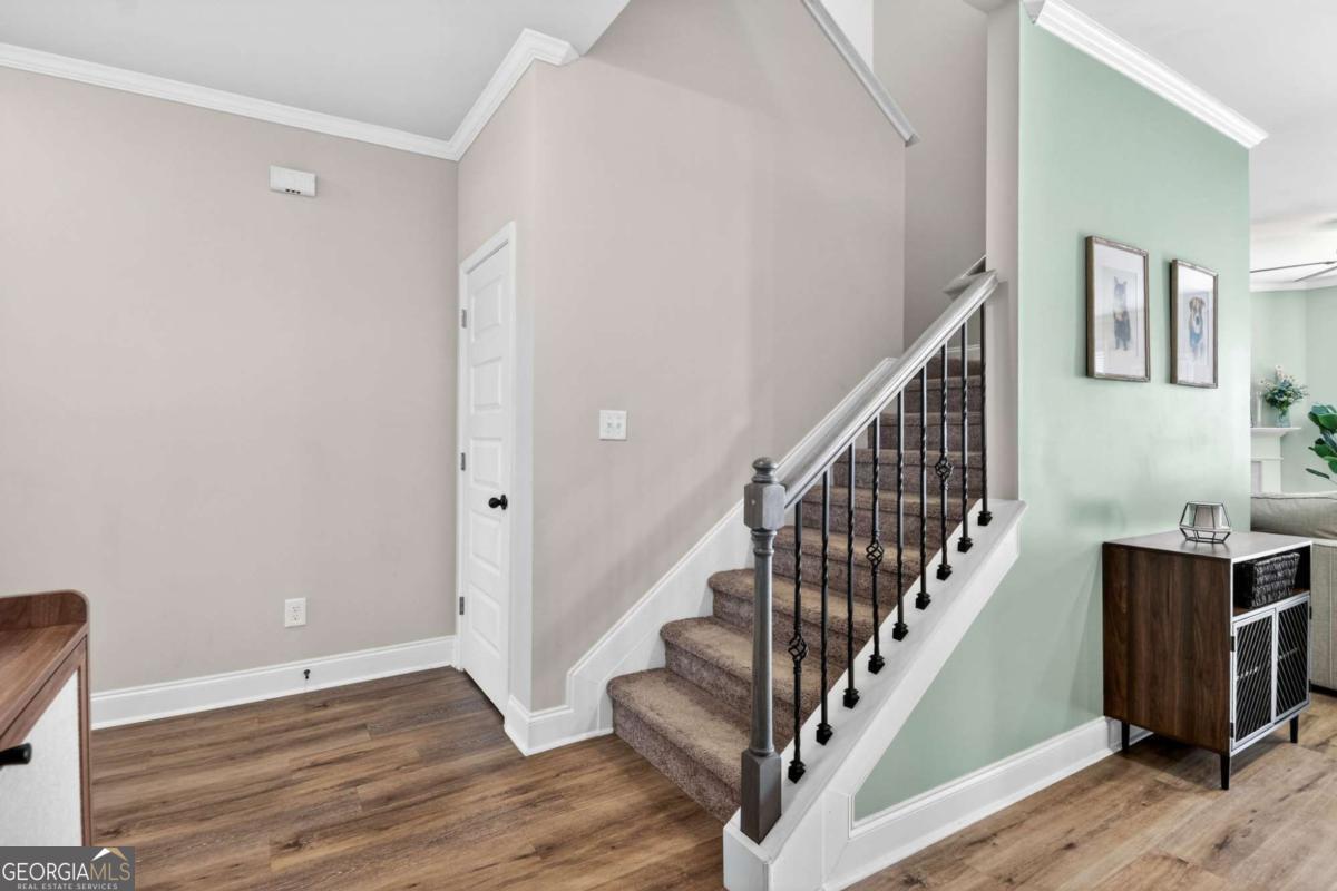 Welcome to this beautifully maintained end-unit townhome in the highly desirable East of Main community, just minutes from vibrant Downtown Woodstock. Offering the perfect blend of comfort, convenience, and modern design, this move-in ready home is filled with natural light and thoughtful upgrades throughout. The open-concept main level features LVP flooring and a spacious kitchen with granite countertops, stainless steel appliances, a large island, and seamless flow into the dining area and fireside family room, ideal for both everyday living and entertaining. A standout feature is the stove range vented to the exterior, a rare upgrade not commonly found in the community. Upstairs, the oversized primary suite offers a relaxing retreat with a custom closet system, along with a spa-like bathroom featuring a double vanity, soaking tub, and separate shower. Two additional bedrooms provide flexibility for guests, a home office, or growing needs, while the convenient upstairs laundry room adds everyday functionality. An extra-wide hallway upstairs offers additional flex space, perfect for a study nook or sitting area. As an end unit, this home enjoys added privacy, extra windows, and a bright, open feel throughout. Step outside to the back patio with a natural gas hookup, perfect for grilling and outdoor enjoyment. All appliances remain, making this truly move-in ready, and a transferable home warranty is included for added peace of mind. Residents of East of Main also enjoy access to a community playground and pavilion, providing ideal spaces for outdoor fun and gatherings. Conveniently located near shopping including Black Rifle Coffee Company, dining, and major highways, this home offers both lifestyle and accessibility in one of Woodstock's most sought-after communities. Don't miss this opportunity to own a well-appointed home in an unbeatable location