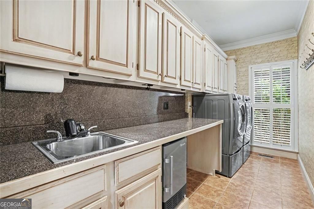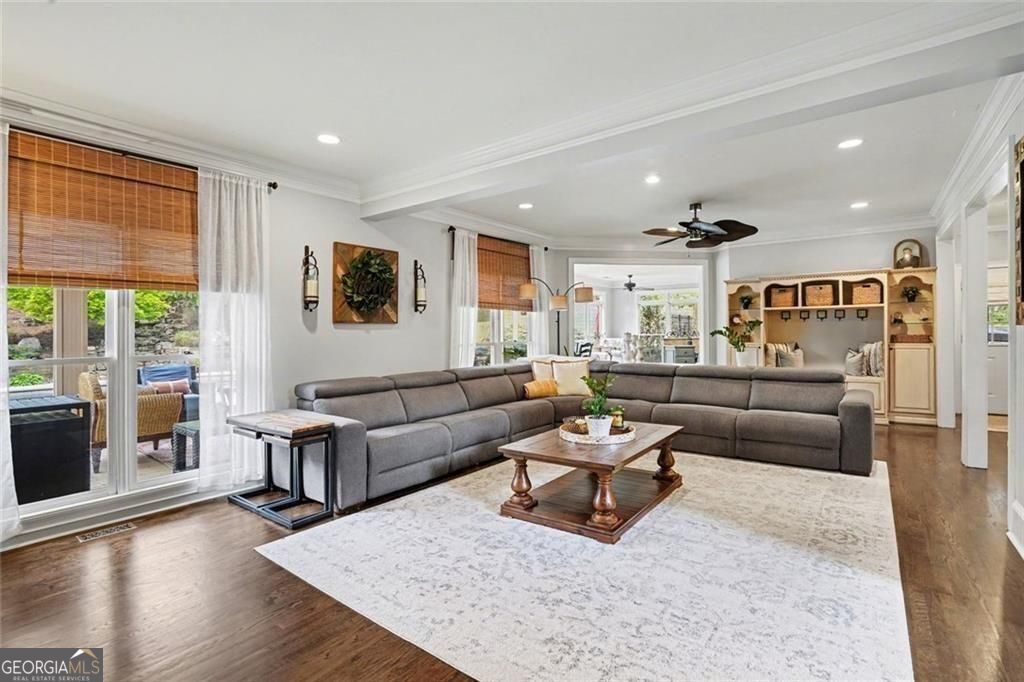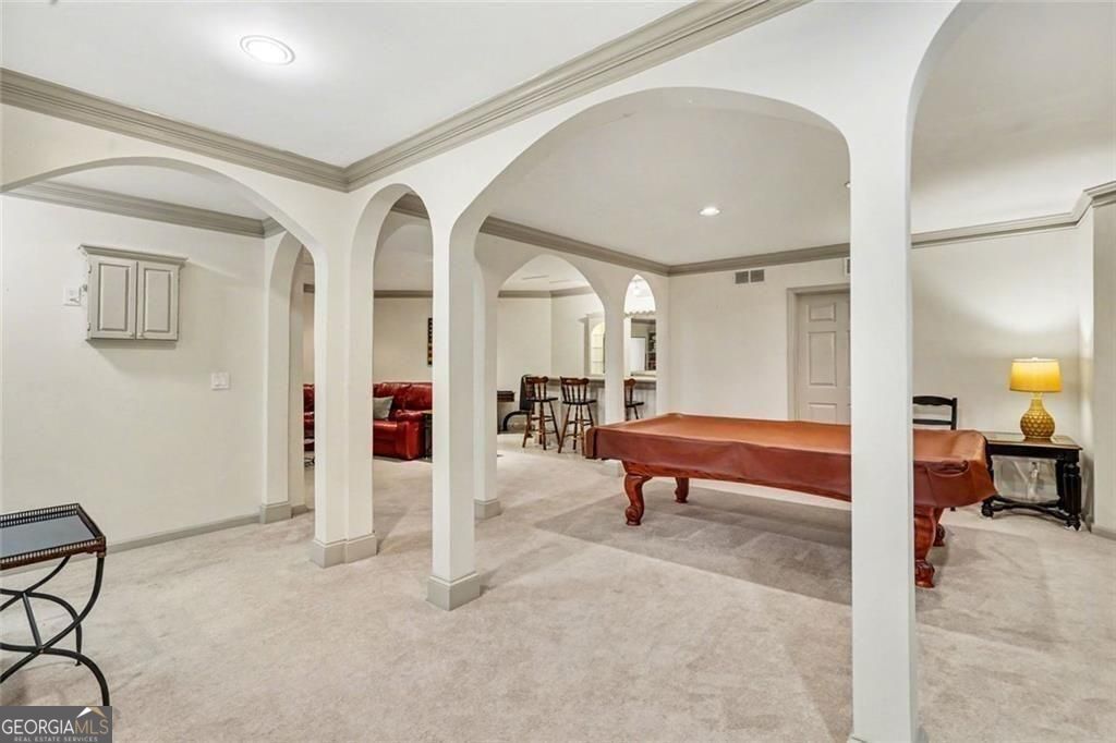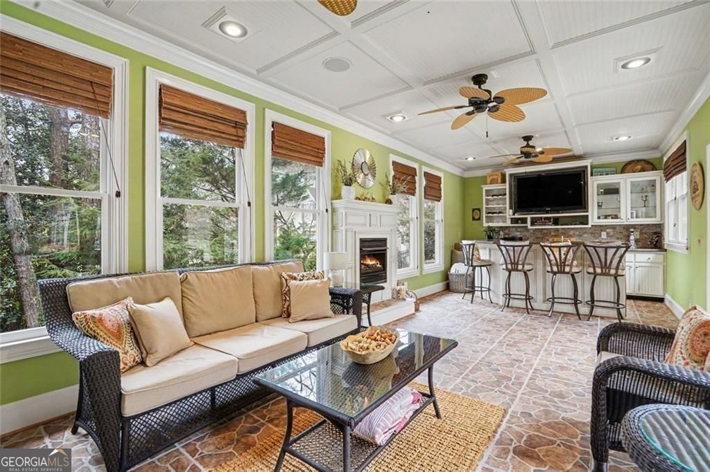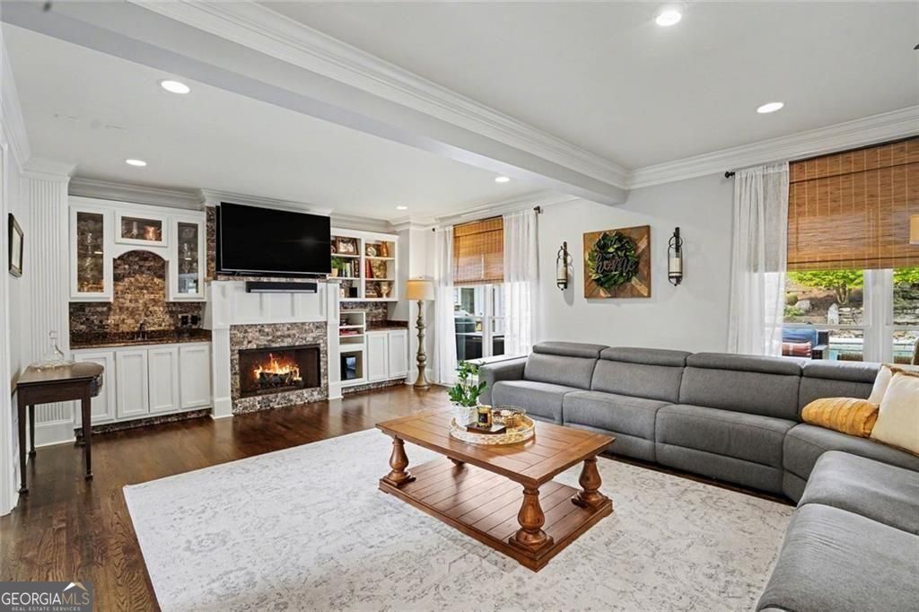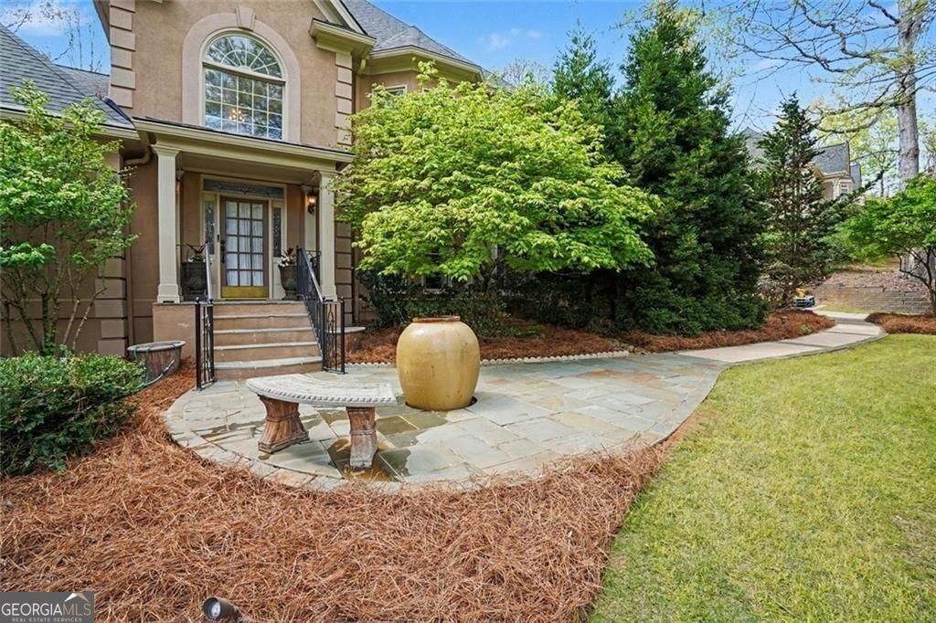 Stunning entertainer's retreat in sought-after Johns Creek, the #1 place to live in the nation according to U.S News & World Repor! Situated on an almost one-acre lot, this beautiful home offers an exceptional blend of elegance, comfort, and resort-style outdoor living. Step inside to find rich hardwood floors, extensive crown molding, and light-filled living spaces designed for both everyday living and entertaining. The spacious family room features custom built-ins and a cozy fireplace, seamlessly flowing into the chef's kitchen complete with stainless steel appliances, large island, and abundant cabinetry. A bright breakfast area and formal dining room provide ideal gathering spaces for any occasion-while every room along the back of the home showcases serene views of the pool. The main-level primary suite is a true retreat with a dramatic coffered ceiling, sitting area, and spa-inspired bath featuring dual vanities, soaking tub, and separate shower. This versatile floor plan includes two additional bonus rooms perfect for extra bedrooms, home offices, or flex spaces to suit your needs. Upstairs, generously sized secondary bedrooms and additional living areas provide ample space for family and guests. The finished terrace level is designed for entertaining, featuring a large recreation room, two additional wet bars, and flexible space for gatherings or multi-generational living. Step outside to your private backyard oasis featuring an inground Gunite heated saltwater pool with jacuzzi and waterfall, expansive patio, covered outdoor living space, and a dedicated pool room complete with bar and fireplace. The beautifully landscaped, terraced yard is enhanced by a private well that services the entire exterior, including the pool and waterfall-perfect for maintaining the lush surroundings. Additional highlights include Smart Home features, a WiFi-enabled garage door, abundant storage, and thoughtfully designed indoor-outdoor flow throughout. Located just minutes from the Chattahoochee River, River Pines Golf, Atlanta Athletic Club, Newtown Park, Town Center, top-rated schools, shopping, and dining, this exceptional home truly has it all.