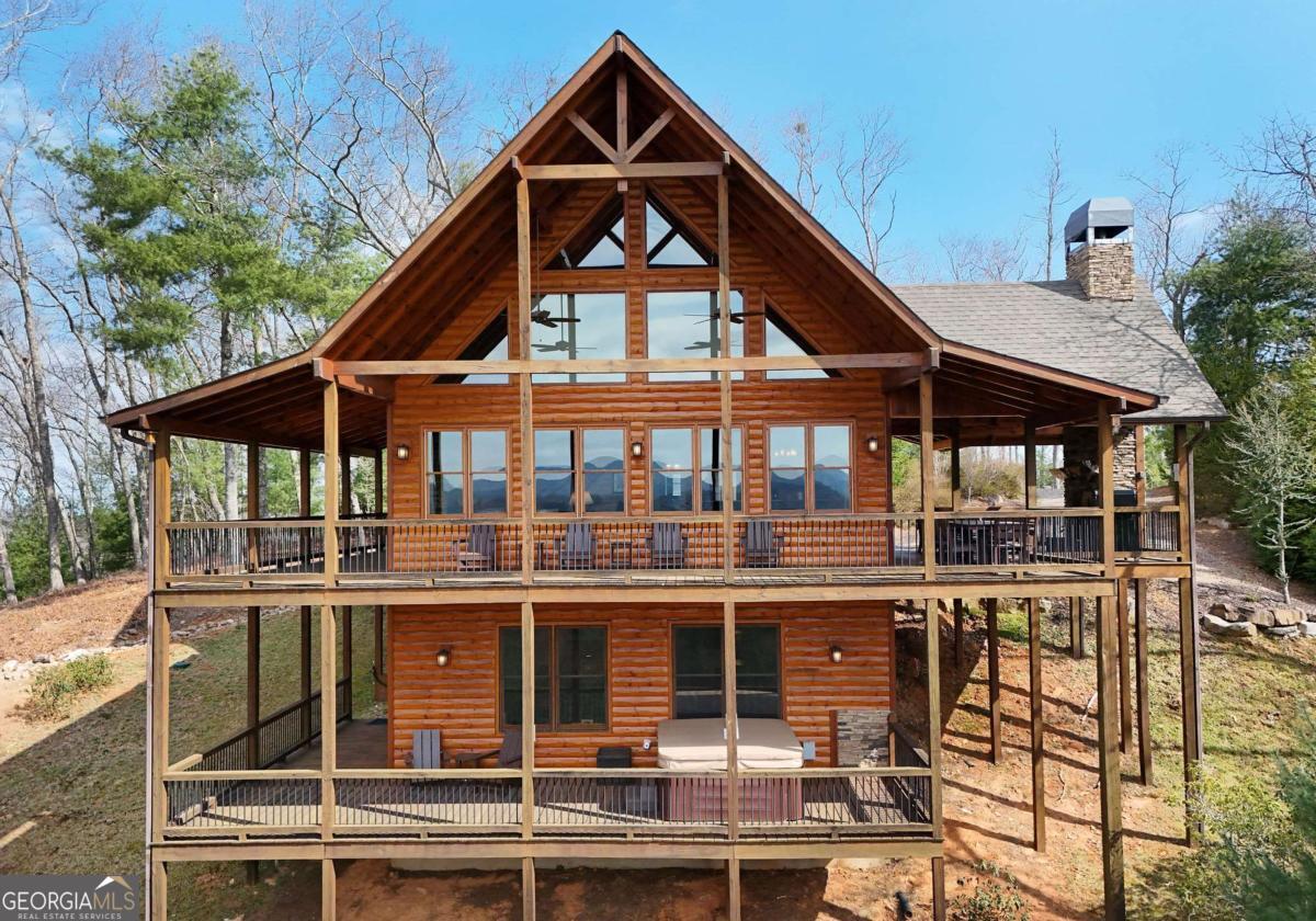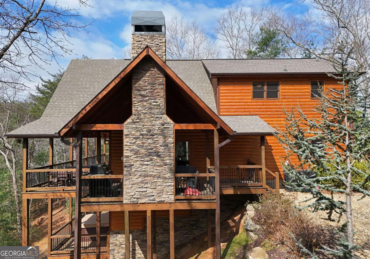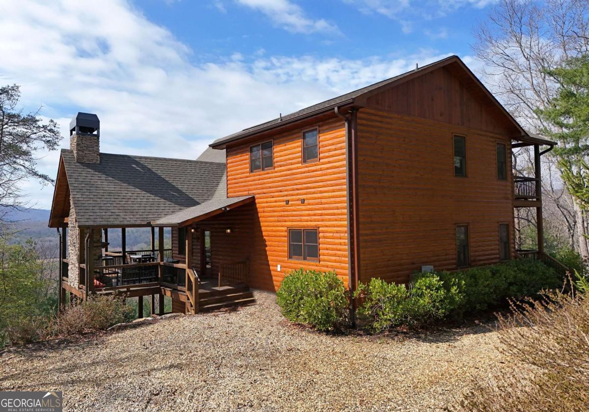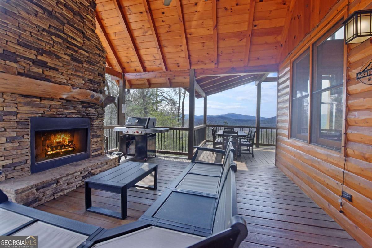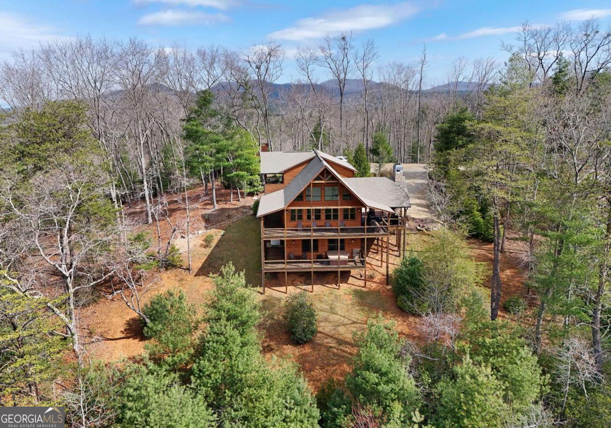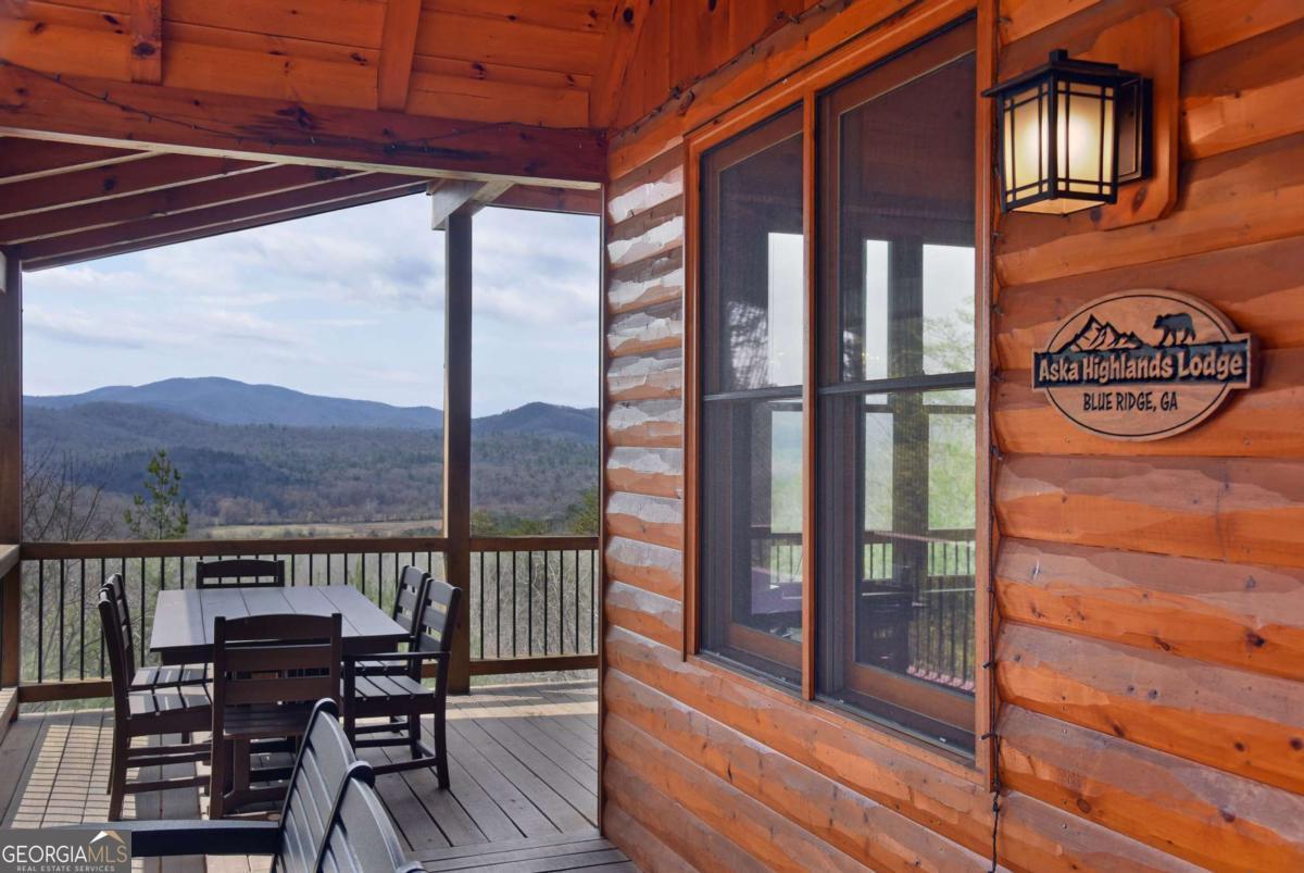 Perched high atop the mountain in the heart of the Aska Adventure Area, this richly appointed chalet captures the true spirit of rustic luxury & timeless mountain living. Nestled on a private cul-de-sac w/in a gated community, the setting offers unmatched peace & seclusion, surrounded by beautifully landscaped grounds & the natural beauty of the North Georgia mountains. Breathe in the crisp, clean air as you take in breathtaking, long-range mountain views that stretch endlessly into the horizon-an ever-changing backdrop filled with wildlife & quiet serenity. Crafted w/hand-hewn log siding & warm, natural finishes, the home welcomes you with an authentic yet refined mountain aesthetic. A dramatic wall of windows brings the outdoors in, filling the open-concept living spaces with light while perfectly framing the panoramic views. Gather around the glow of floor-to-ceiling stacked stone fireplaces in the main level great room, lower-level family room, or out on the inviting party porch; each space designed for comfort, connection & making memories. Step outside to expansive wrap-around decks & a private master balcony, where mornings begin with sunrise over the mountains & evenings end under a canopy of stars. Offered fully furnished w/high-end, thoughtfully curated pieces, this home is completely turnkey-ready for immediate enjoyment or a seamless investment opportunity. The cabin features two luxurious master ensuites on the main & upper levels, while the finished terrace level offers a spacious family room w/fireplace, wet bar, oversized bedroom, & full bath. Kitchen & baths showcase upgraded cabinetry & granite countertops, complemented by rich hardwood flooring throughout. Perfectly positioned just minutes to hiking, kayaking, tubing & fly fishing on the Toccoa River & a short drive to Downtown Blue Ridge's dining, shopping, wineries, & breweries, this is where every sunrise feels like a retreat & every sunset settles in w/the warm glow of a true mountain escape.