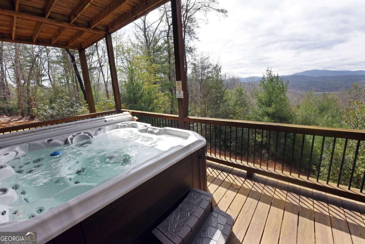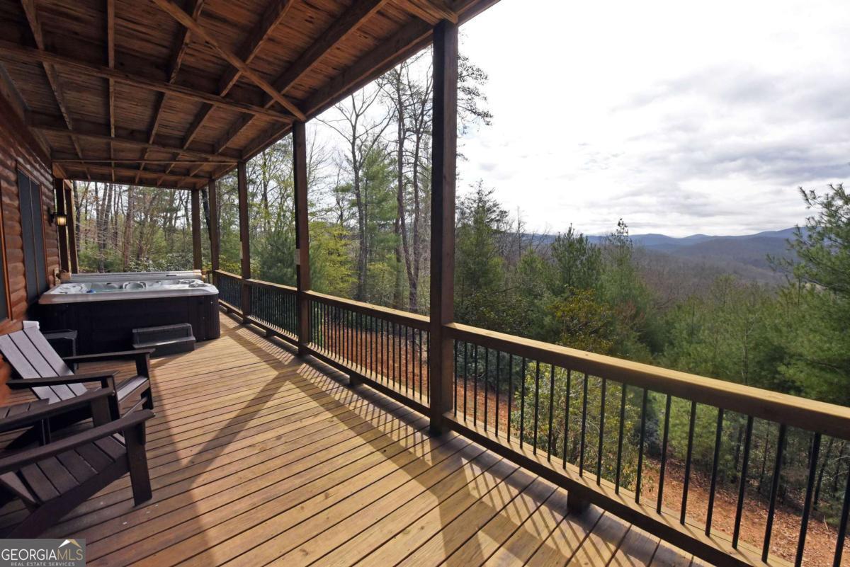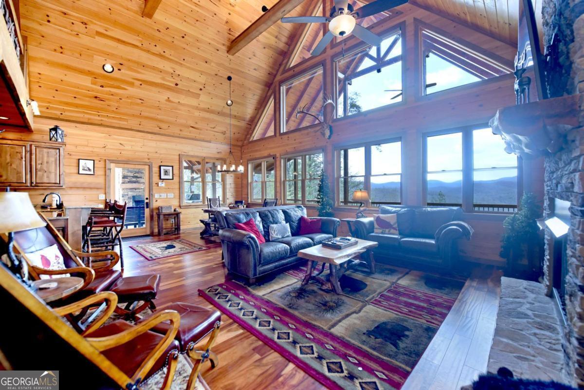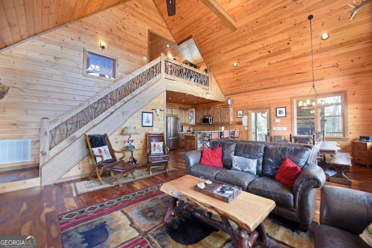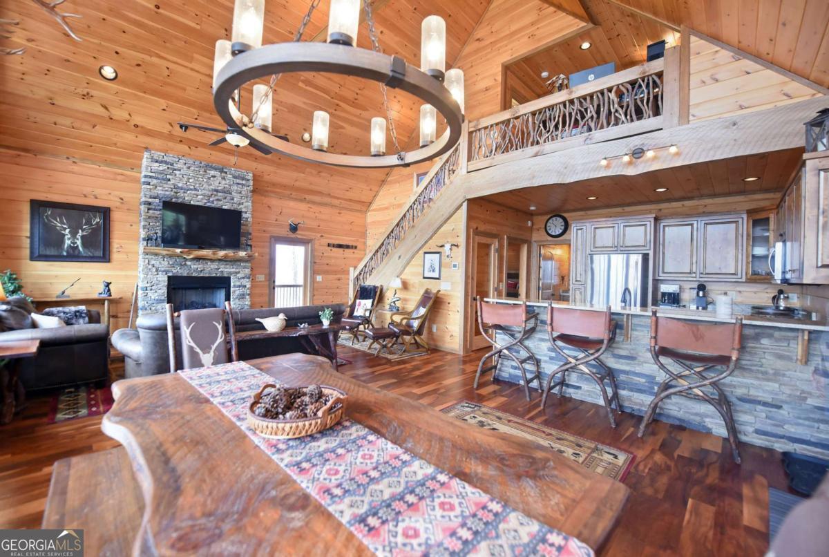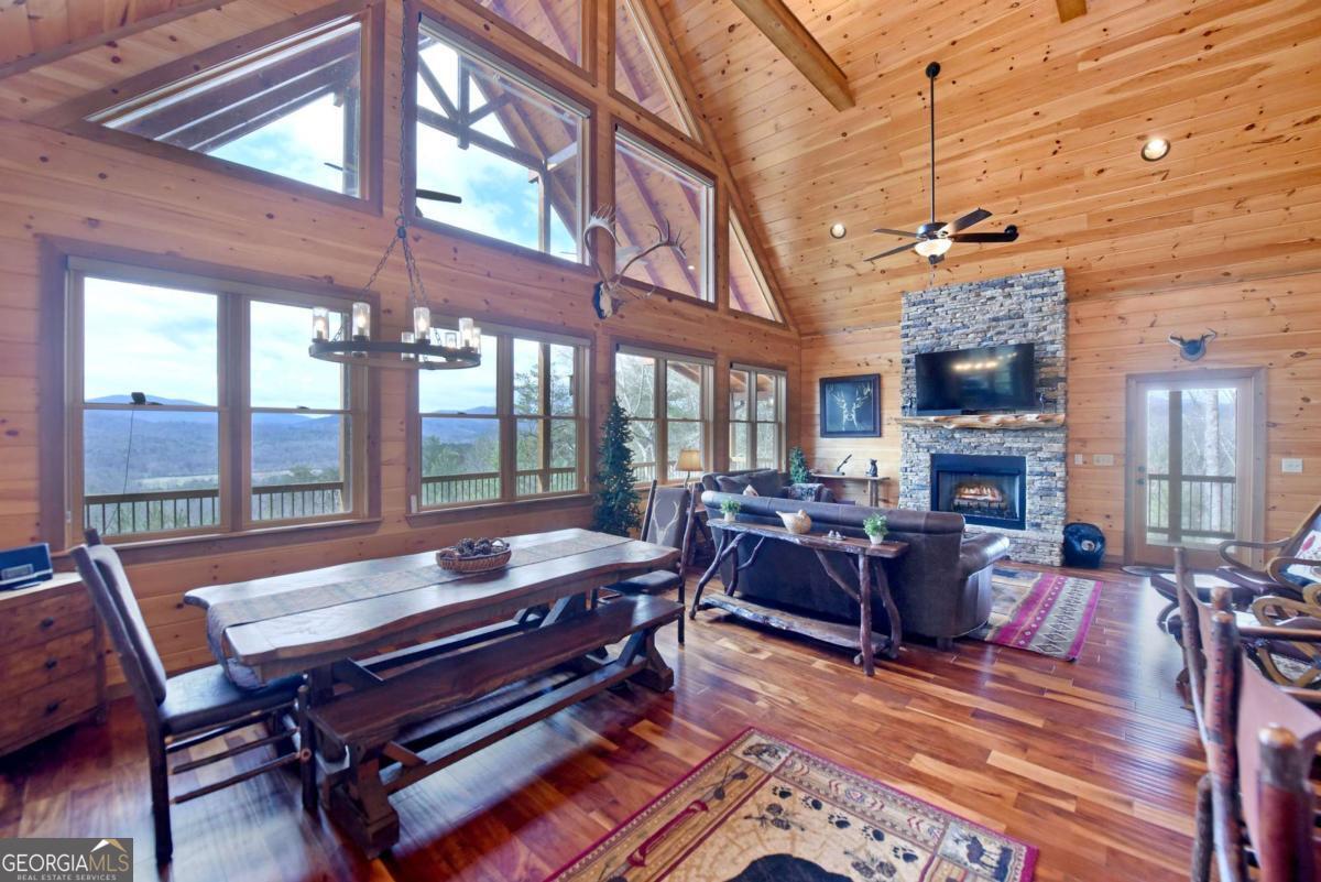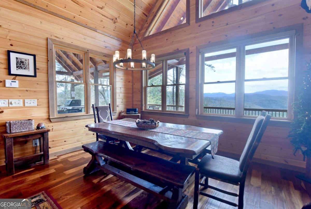 Perched high atop the mountain in the heart of the Aska Adventure Area, this richly appointed chalet captures the true spirit of rustic luxury & timeless mountain living. Nestled on a private cul-de-sac w/in a gated community, the setting offers unmatched peace & seclusion, surrounded by beautifully landscaped grounds & the natural beauty of the North Georgia mountains. Breathe in the crisp, clean air as you take in breathtaking, long-range mountain views that stretch endlessly into the horizon-an ever-changing backdrop filled with wildlife & quiet serenity. Crafted w/hand-hewn log siding & warm, natural finishes, the home welcomes you with an authentic yet refined mountain aesthetic. A dramatic wall of windows brings the outdoors in, filling the open-concept living spaces with light while perfectly framing the panoramic views. Gather around the glow of floor-to-ceiling stacked stone fireplaces in the main level great room, lower-level family room, or out on the inviting party porch; each space designed for comfort, connection & making memories. Step outside to expansive wrap-around decks & a private master balcony, where mornings begin with sunrise over the mountains & evenings end under a canopy of stars. Offered fully furnished w/high-end, thoughtfully curated pieces, this home is completely turnkey-ready for immediate enjoyment or a seamless investment opportunity. The cabin features two luxurious master ensuites on the main & upper levels, while the finished terrace level offers a spacious family room w/fireplace, wet bar, oversized bedroom, & full bath. Kitchen & baths showcase upgraded cabinetry & granite countertops, complemented by rich hardwood flooring throughout. Perfectly positioned just minutes to hiking, kayaking, tubing & fly fishing on the Toccoa River & a short drive to Downtown Blue Ridge's dining, shopping, wineries, & breweries, this is where every sunrise feels like a retreat & every sunset settles in w/the warm glow of a true mountain escape.